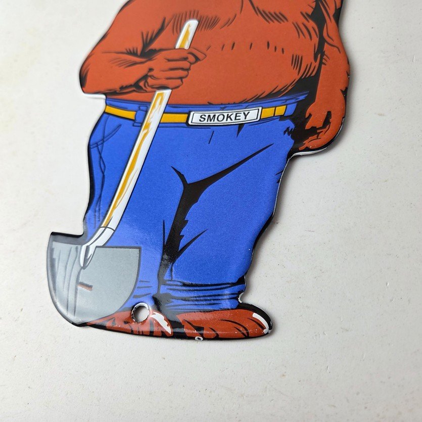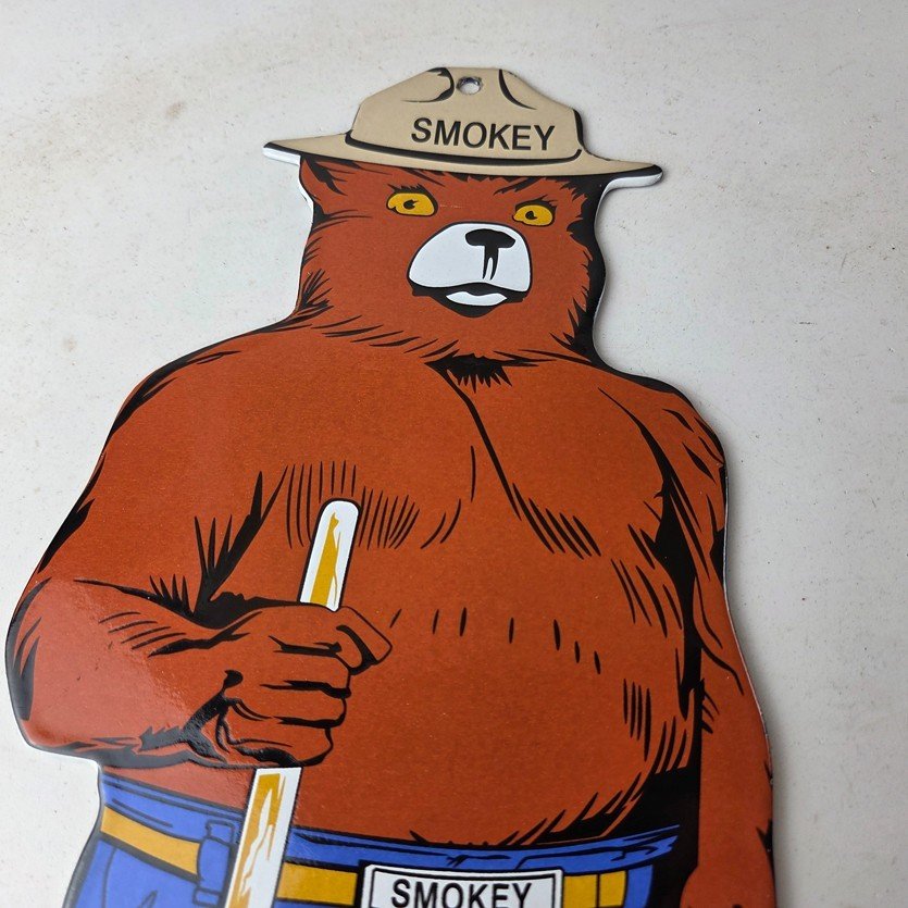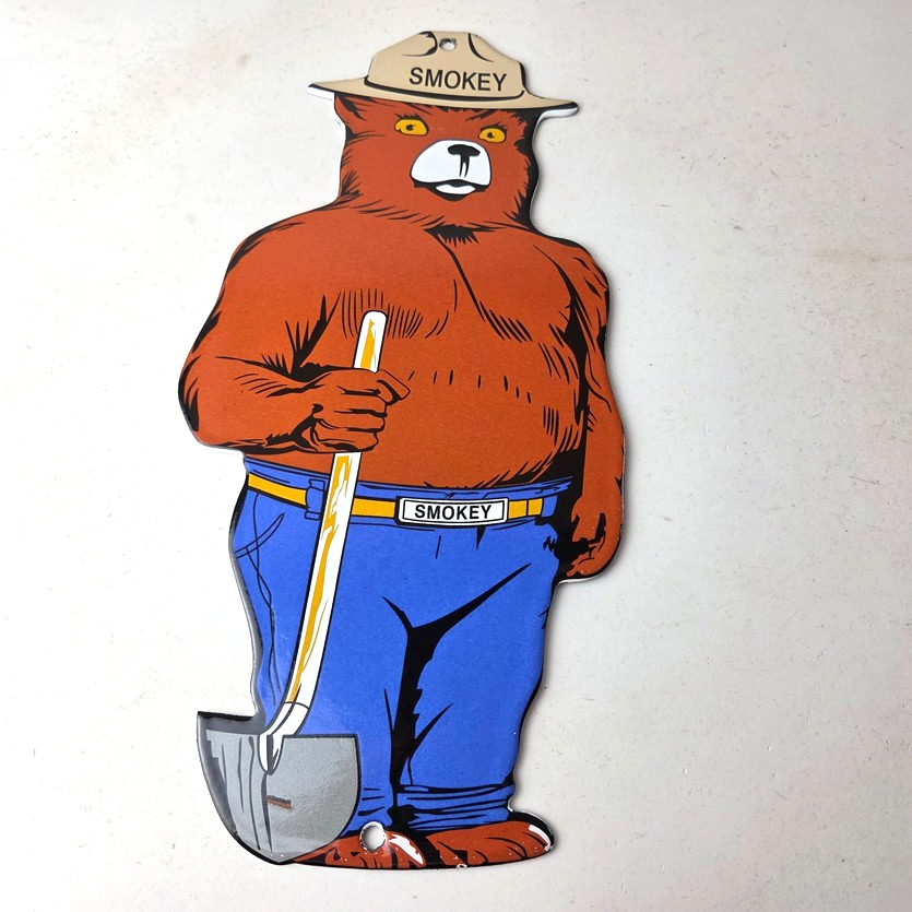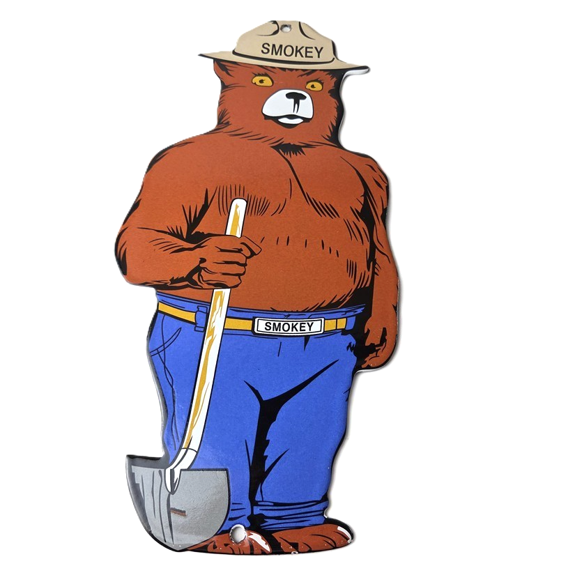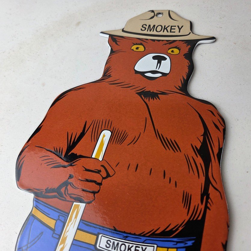 This vintage Forest Service porcelain sign features the iconic Agriculture Forest Service branding and is made of porcelain. The sign measures 12 1/4″ tall by 6″ across and features Smokey the Bear.