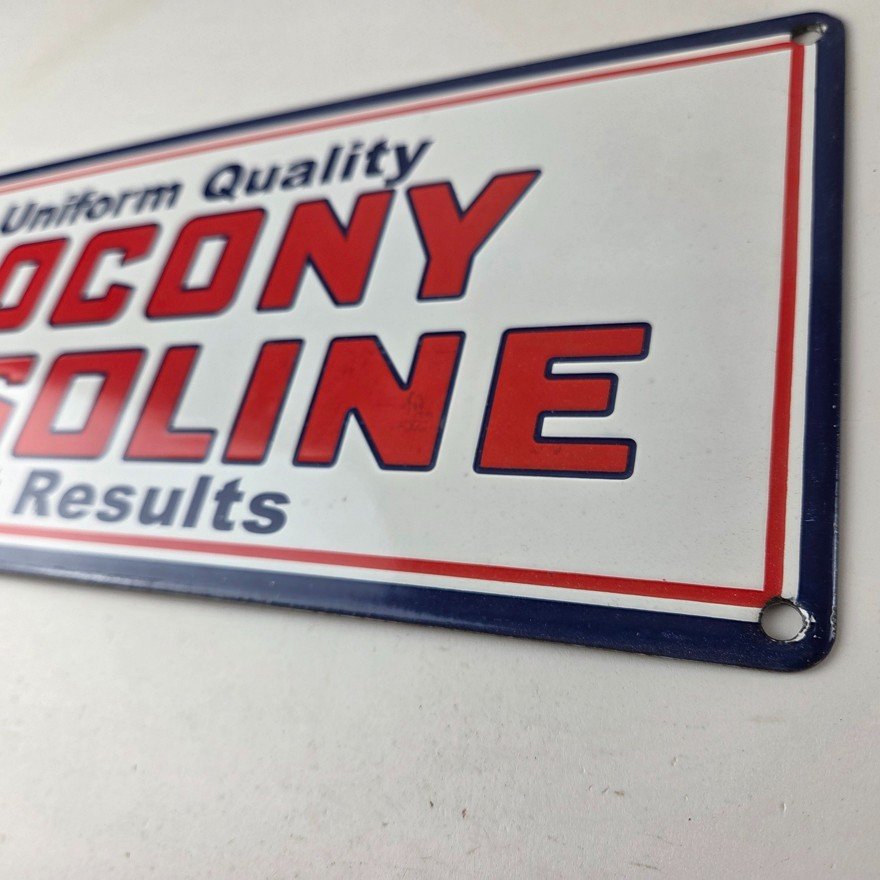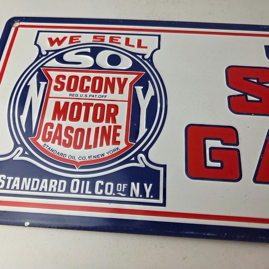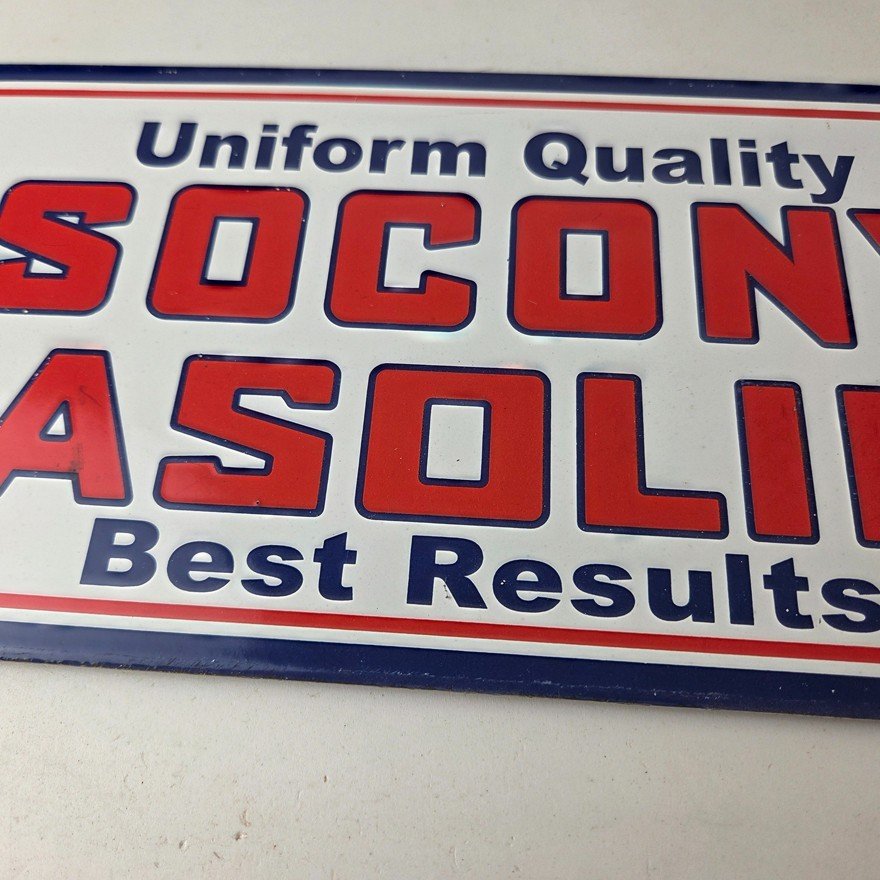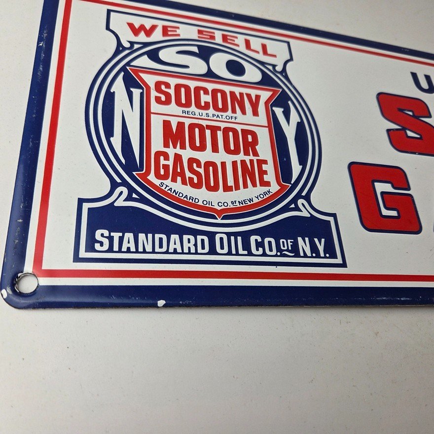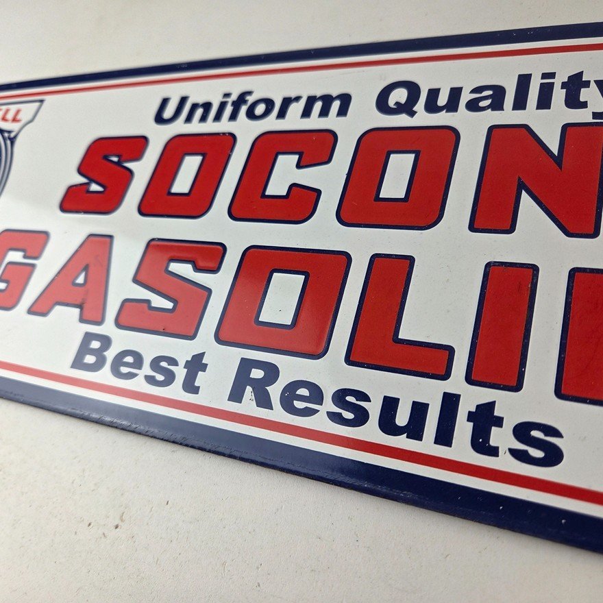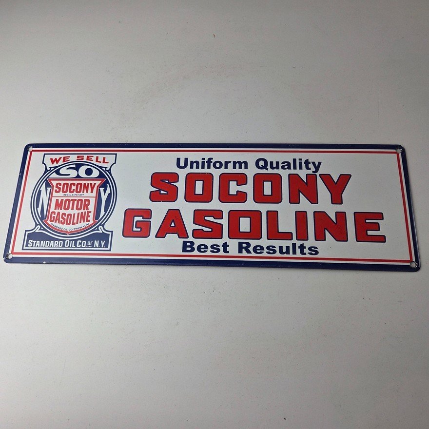 This vintage porcelain sign features the Socony Gasoline lettering across the center. The sign measures 18″ x 5 7/8″ and has a colorful design with excellent porcelain.