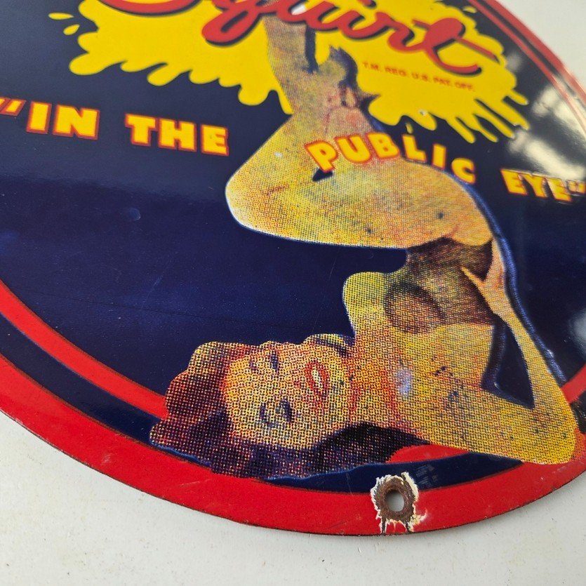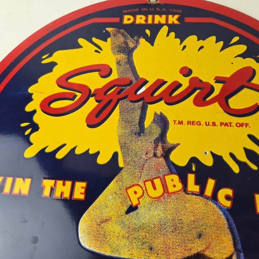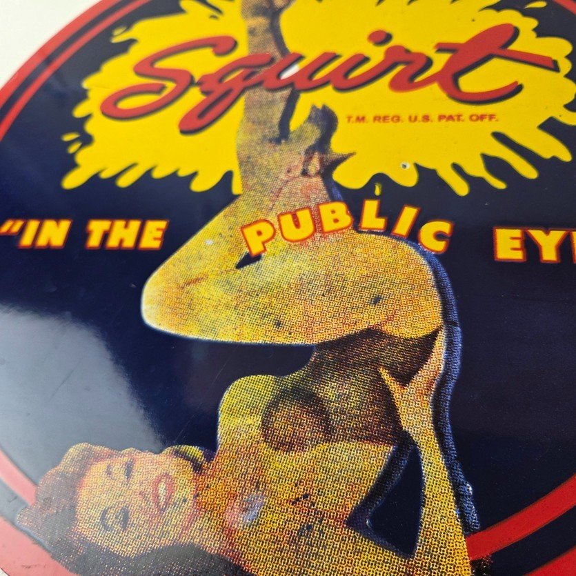 This is a vintage Squirt porcelain sign featuring the iconic pinup girl in the center and the large Squirt red and yellow lettering at the top. It measures 12 inches in diameter and is in excellent condition. This sign is sure to make a statement in any space. Whether you’re looking to add to your collection or decorate your garage, this Squirt porcelain sign is the perfect addition. It has vivid colors and gloss and is in great condition.
