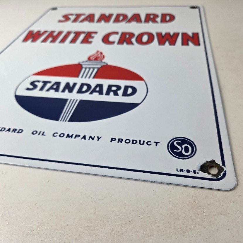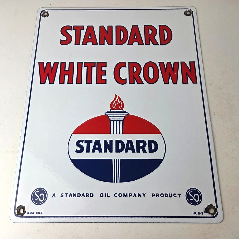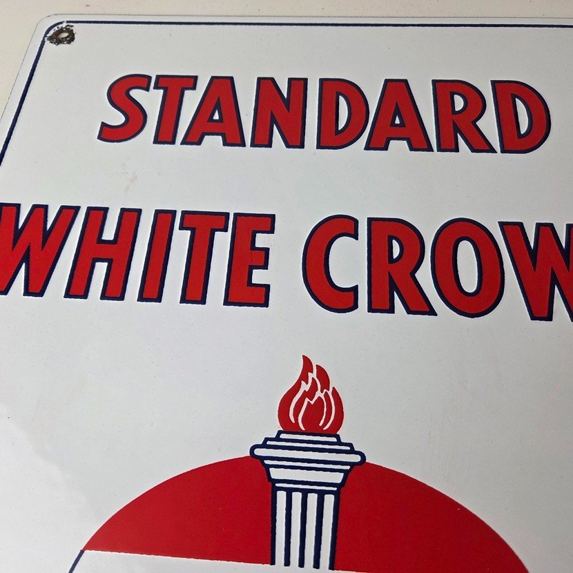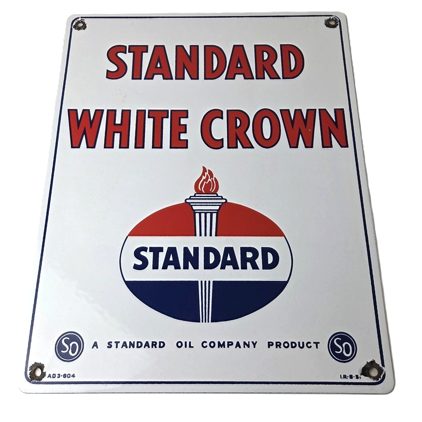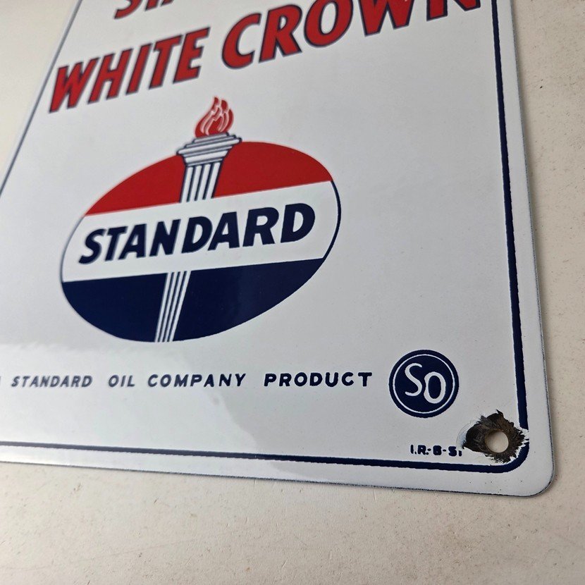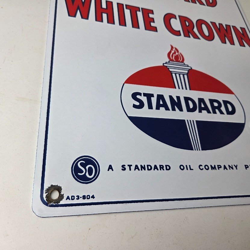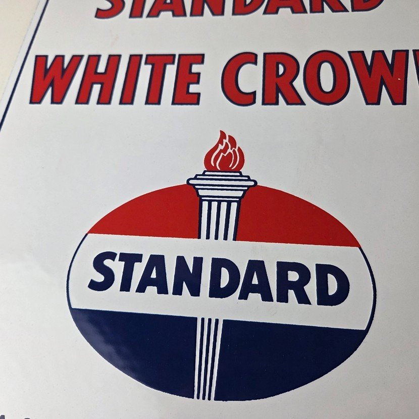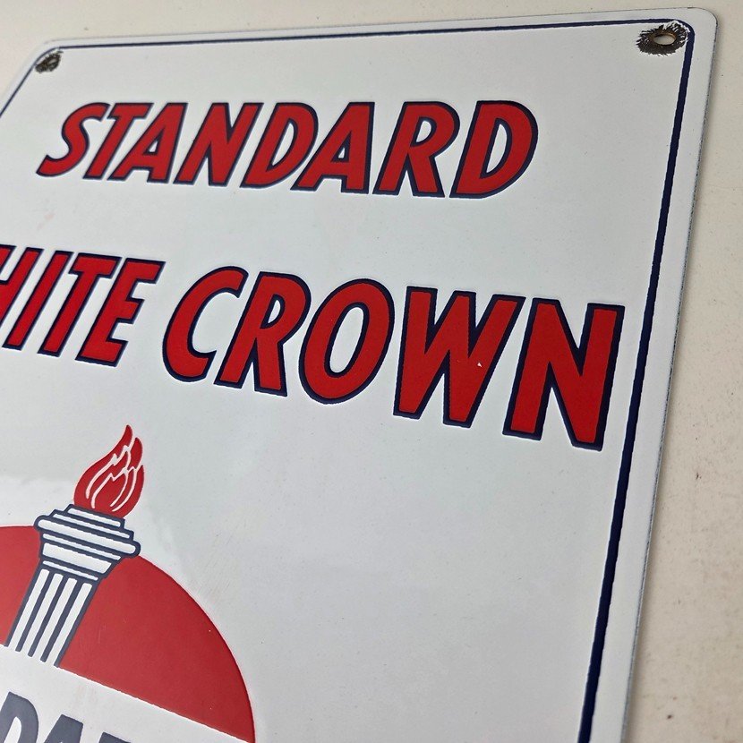 This vintage Standard Oil White Crown sign makes a great addition to a garage, shop display, man cave, or any Standard Oil memorabilia collection, vintage gas station advertising collection, or petroliana collection.