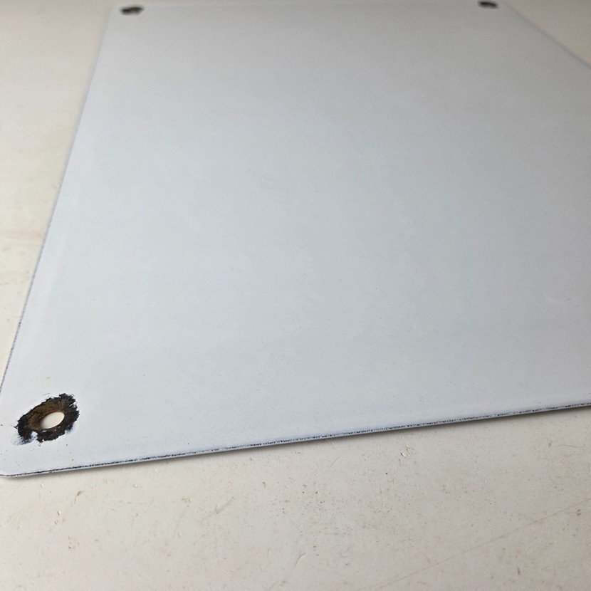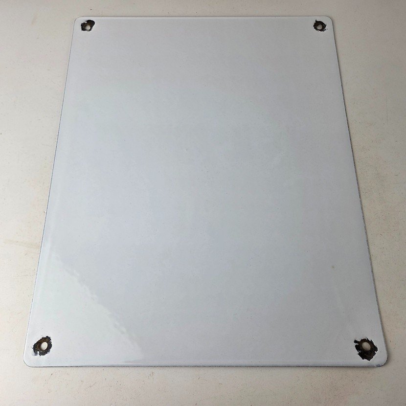 Made of porcelain enamel on steel with patina and wear: rust spotting around the mounting holes, minor edge chips, light surface scratches, and minimal discoloration. This is a porcelain enamel advertising sign in excellent condition, exactly as shown in the photos.