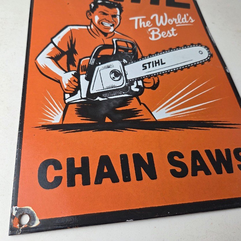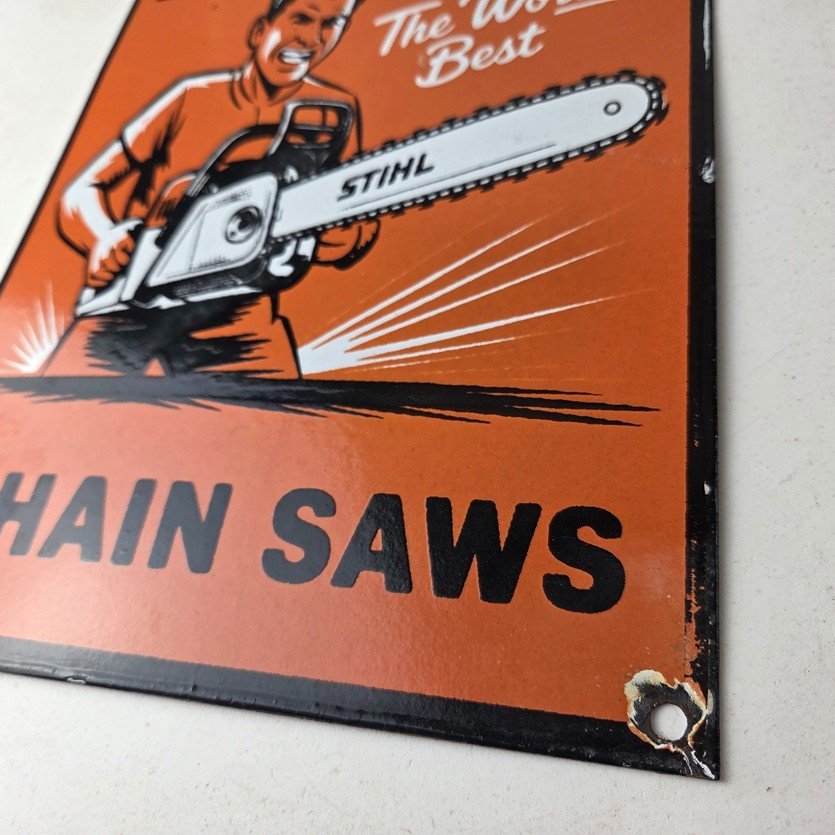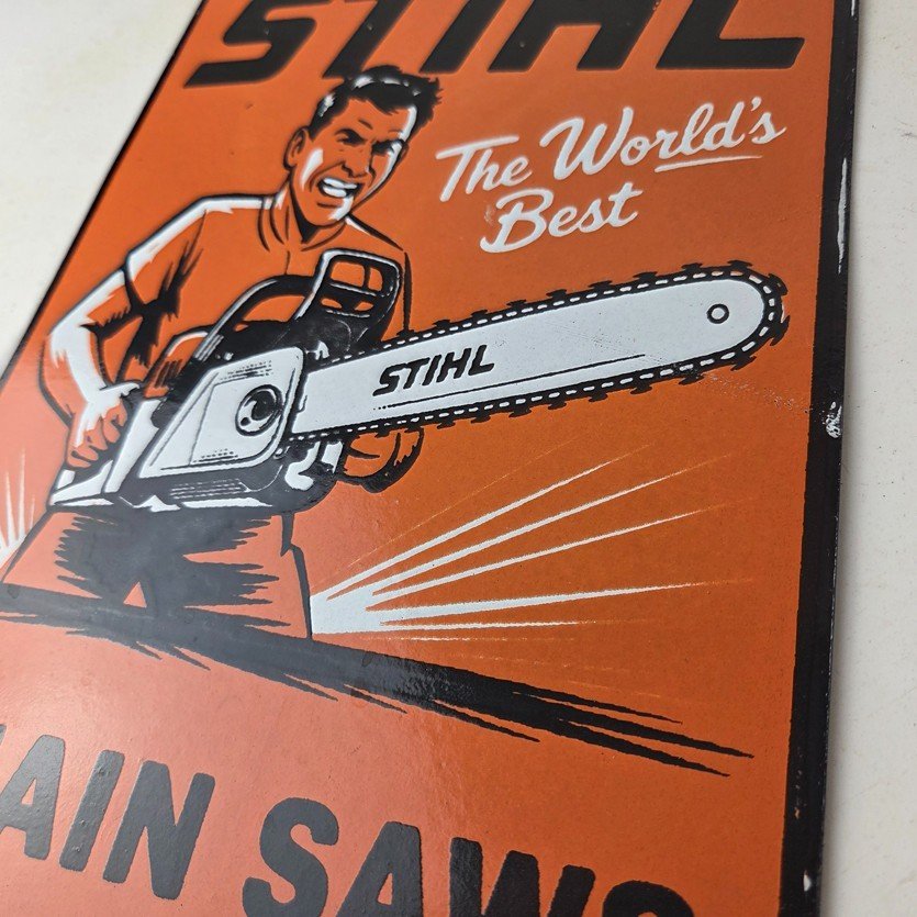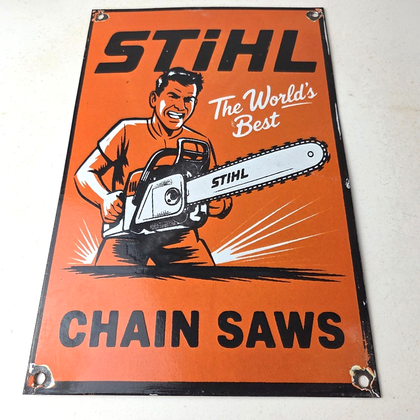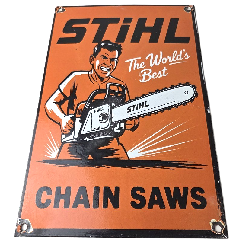 This vintage Stihl Chainsaws porcelain sign is a store display and gas pump plate, which features an eye-catching orange and black color combination and measures 12″ x 8″. The porcelain sign is perfect for automotive & gas and oil-themed spaces and adds a rustic charm to any room.