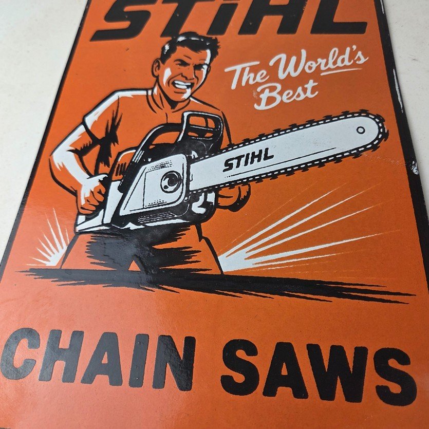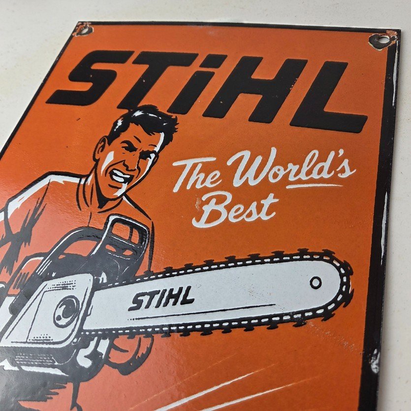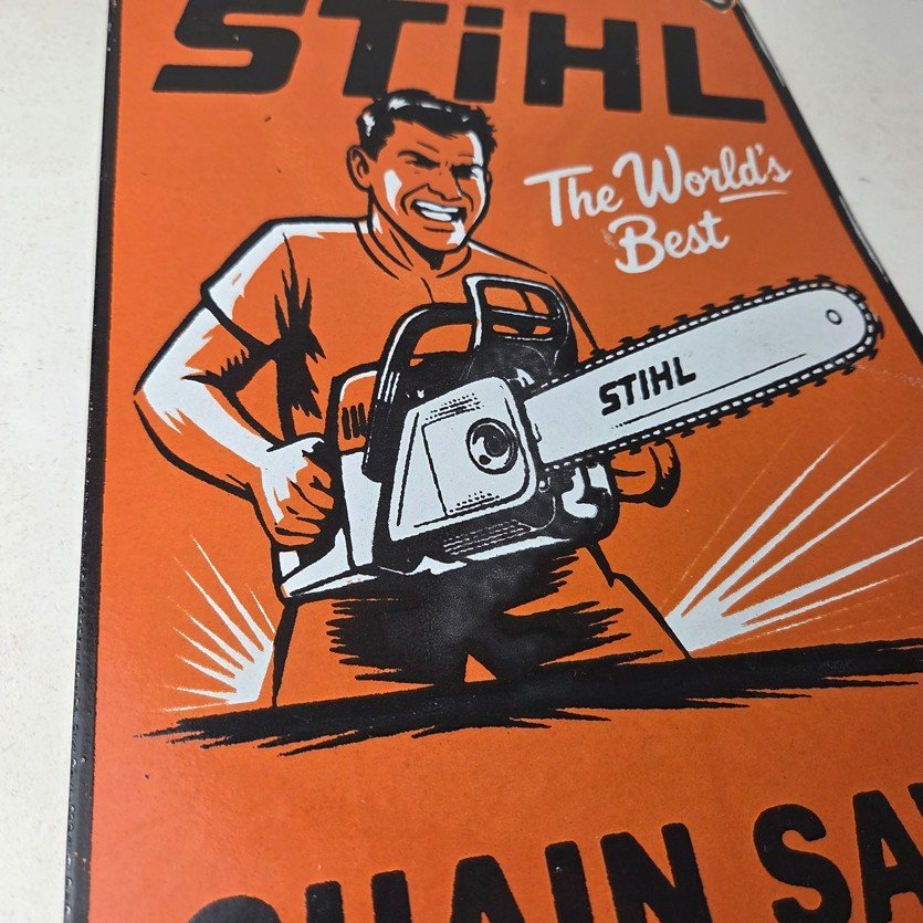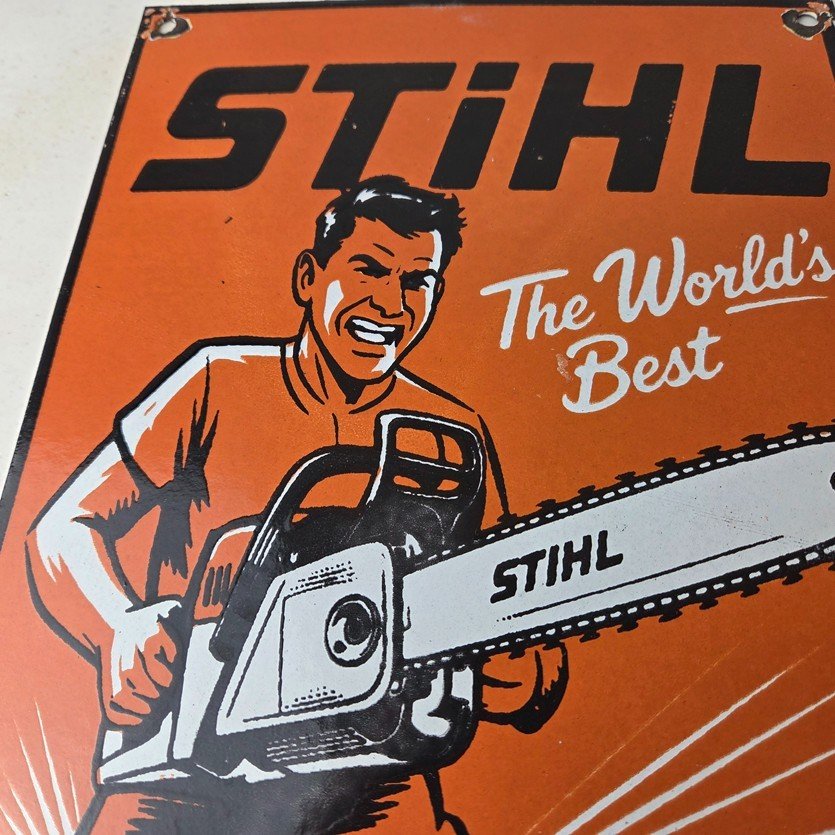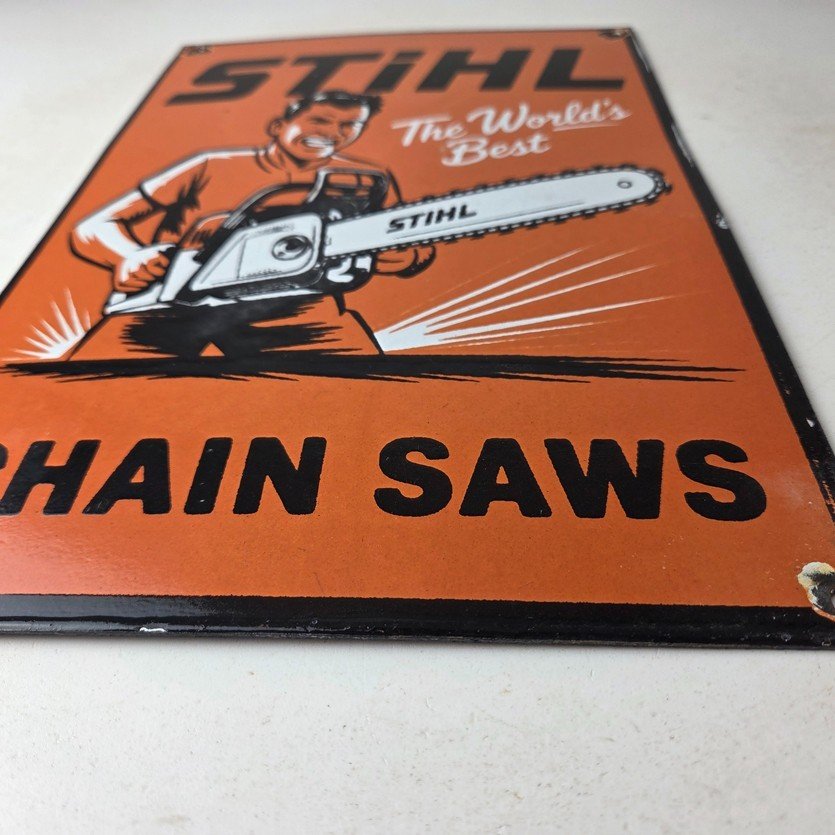 This vintage Stihl Chainsaws porcelain sign is a store display and gas pump plate, which features an eye-catching orange and black color combination and measures 12″ x 8″. The porcelain sign is perfect for automotive & gas and oil-themed spaces and adds a rustic charm to any room.