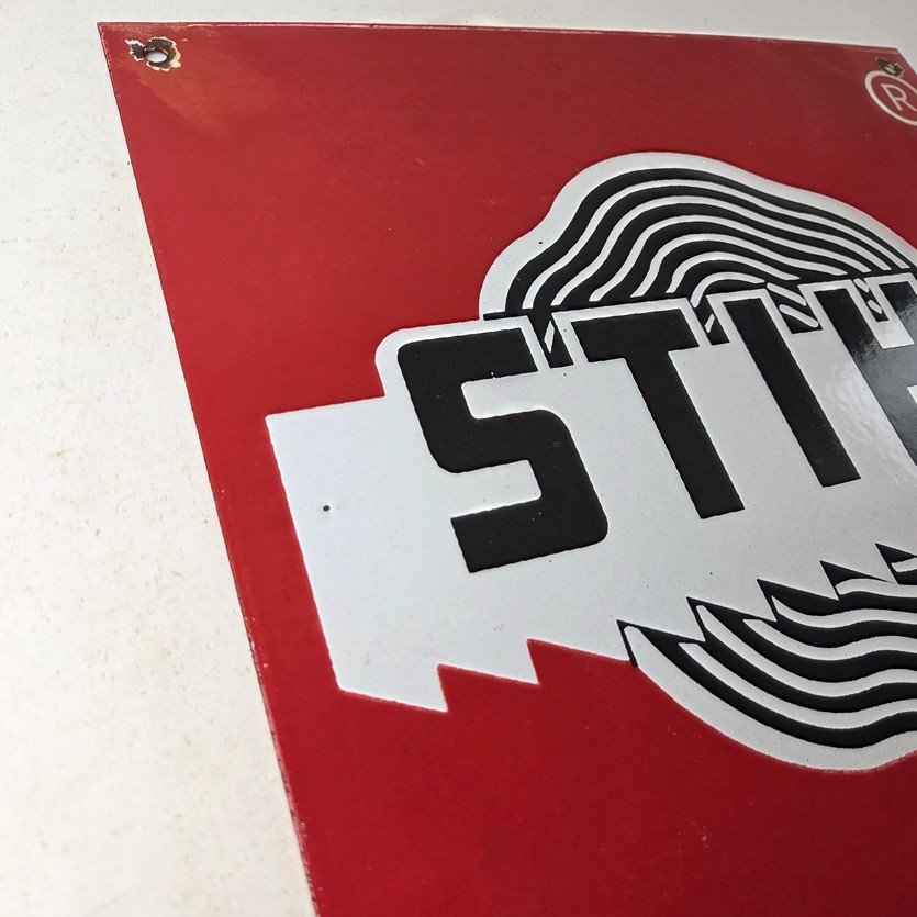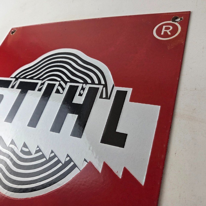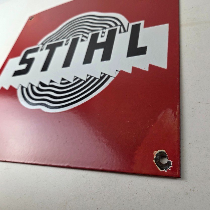 This vintage Stihl Chainsaws porcelain sign is a store display and gas pump plate, which features an eye-catching orange and black color combination and measures 12″. The porcelain sign is perfect for automotive & gas and oil-themed spaces and adds a rustic charm to any room.