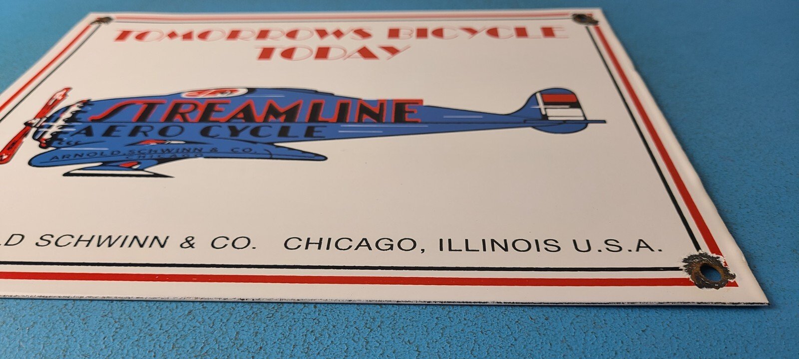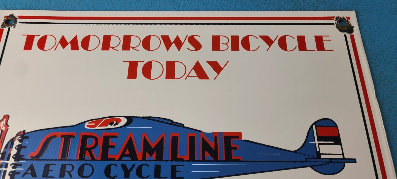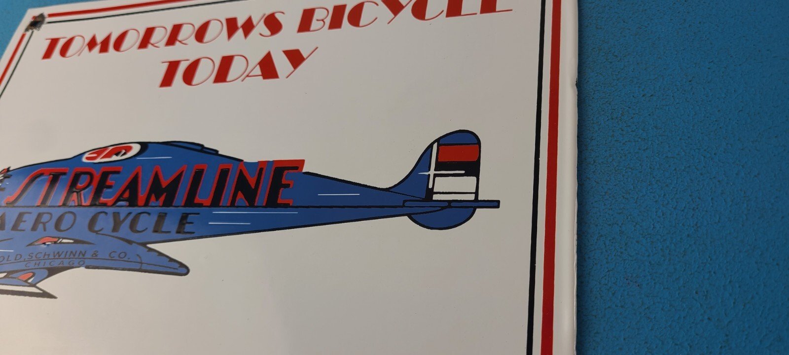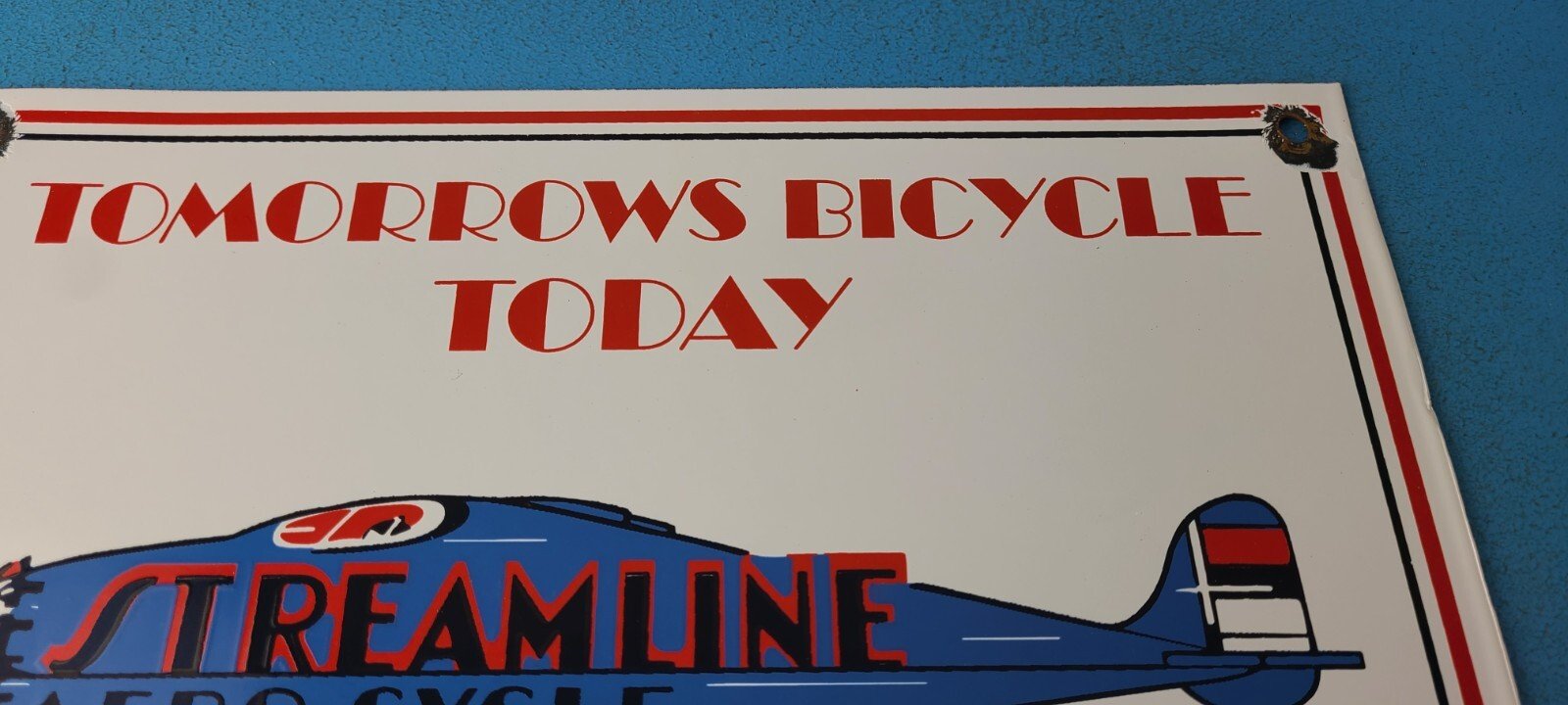 This vintage Streamline Aircraft Co. porcelain sign is a must-have for collectors and aviation & gasoline enthusiasts alike. With its eye-catching red and blue color and Streamline Aero brand, it’s a perfect addition to any collection. Measuring 12″ x 9″, this porcelain sign has excellent lettering with the Streamline graphic in the center.