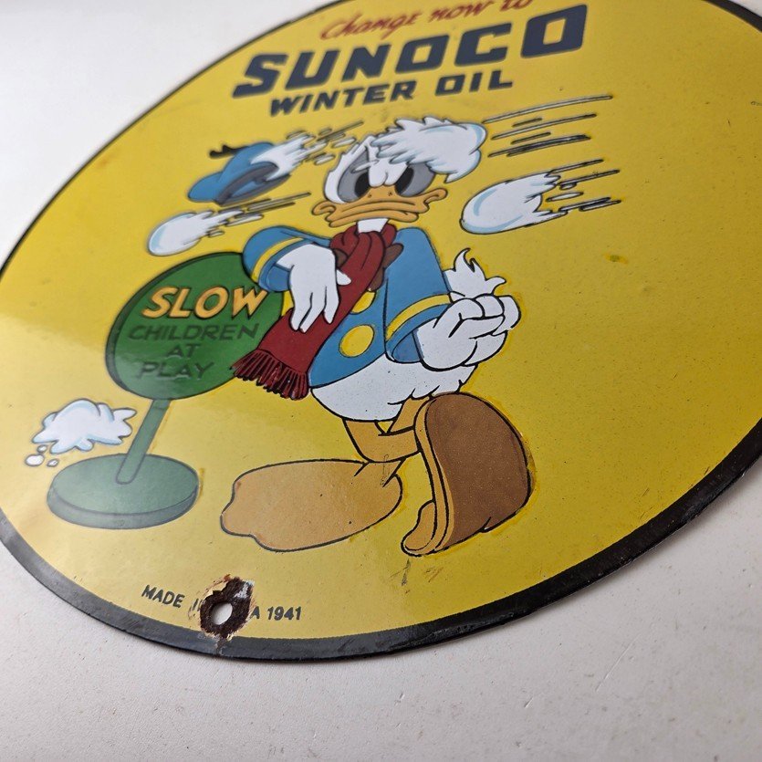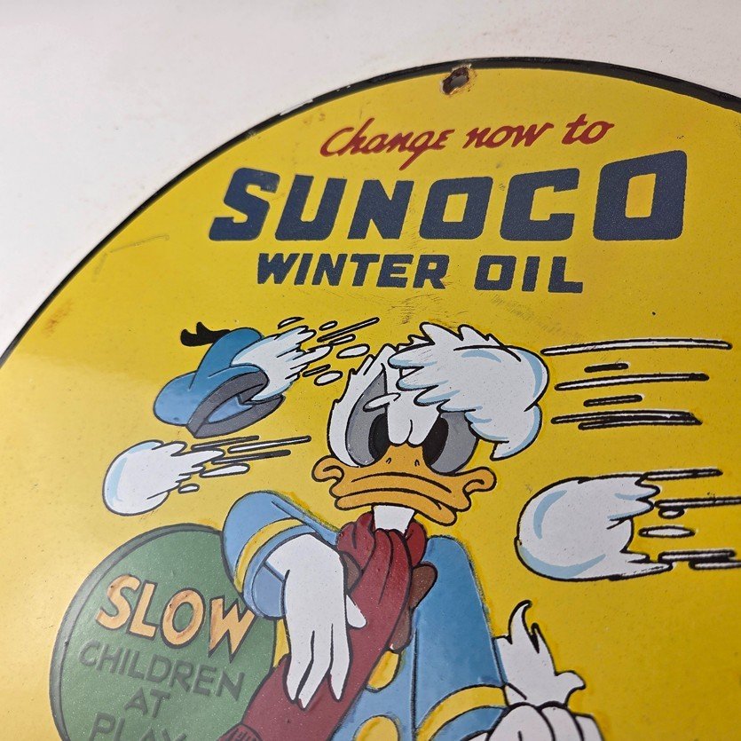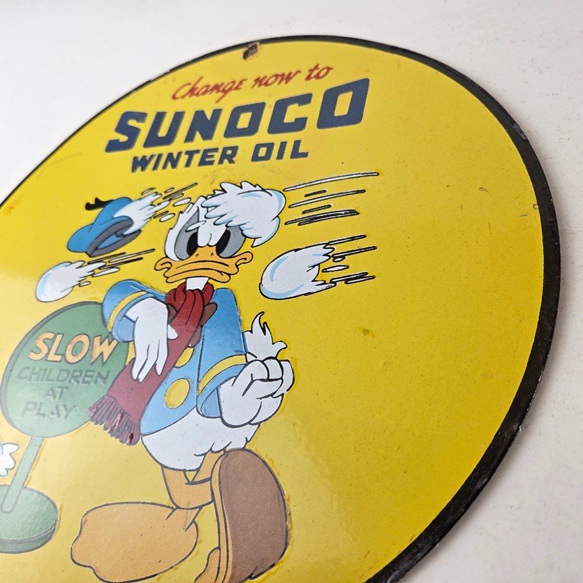 This vintage porcelain sign features the beloved character Donald Duck from Walt Disney and the iconic Sunoco Motor Oil brand.