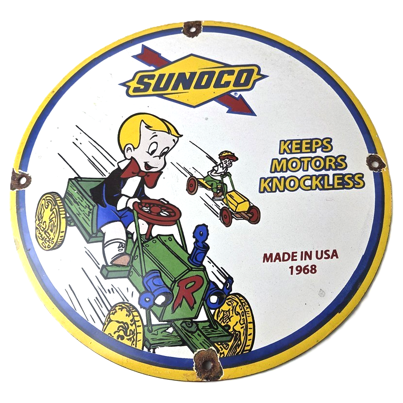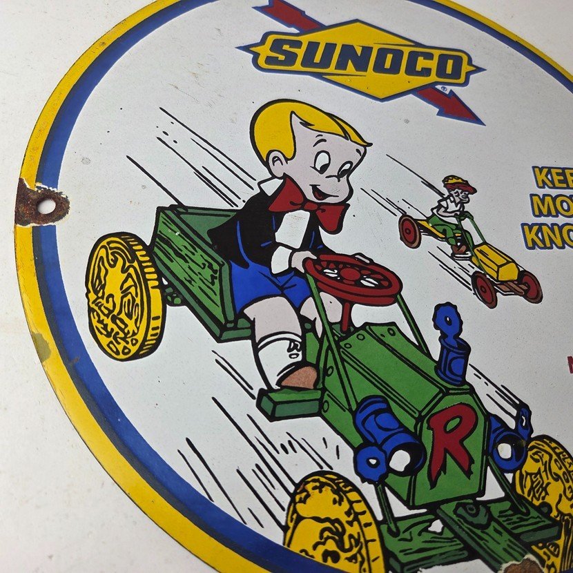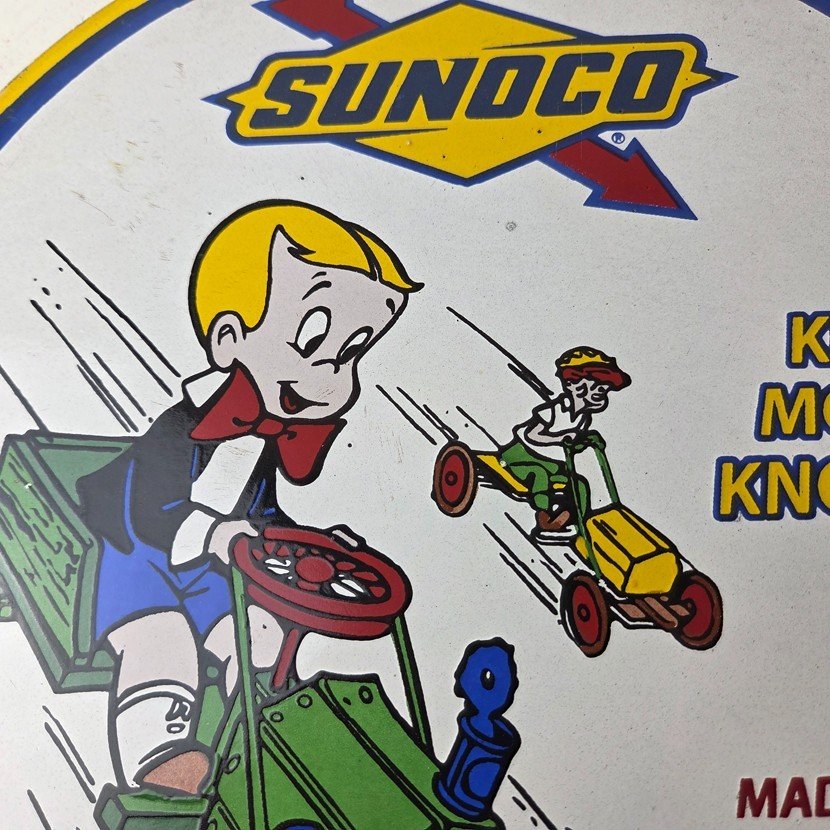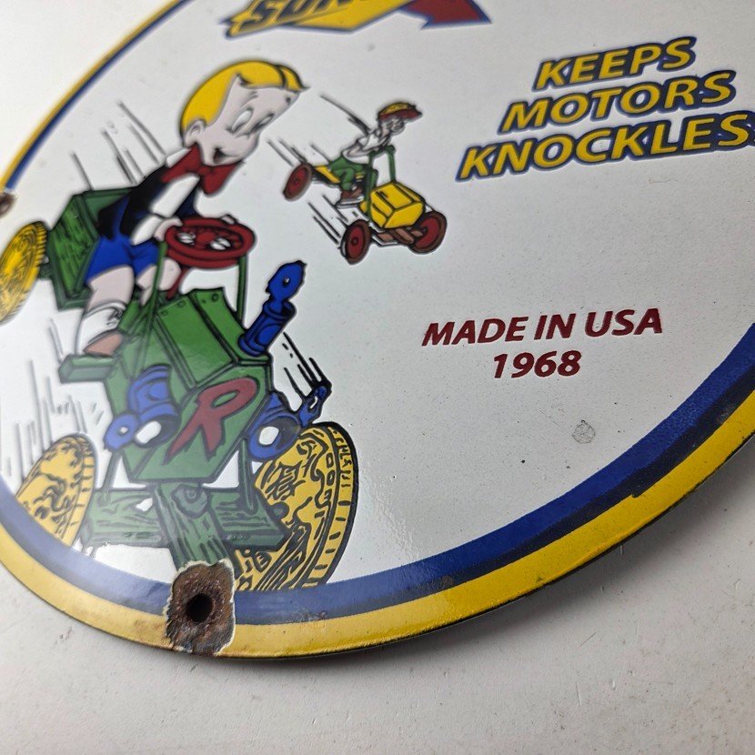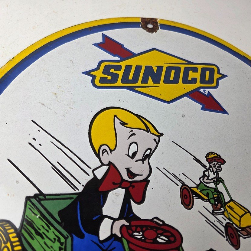 This vintage porcelain sign features the beloved character Richie Rich and the iconic Sunoco Motor Oil brand.