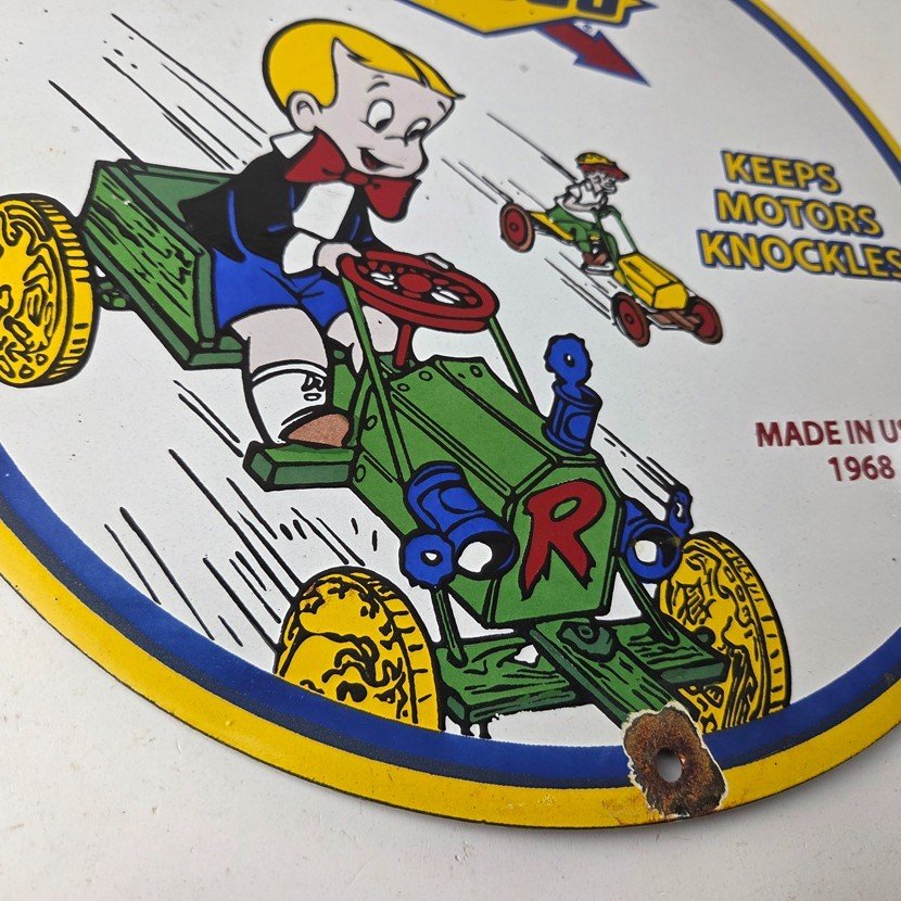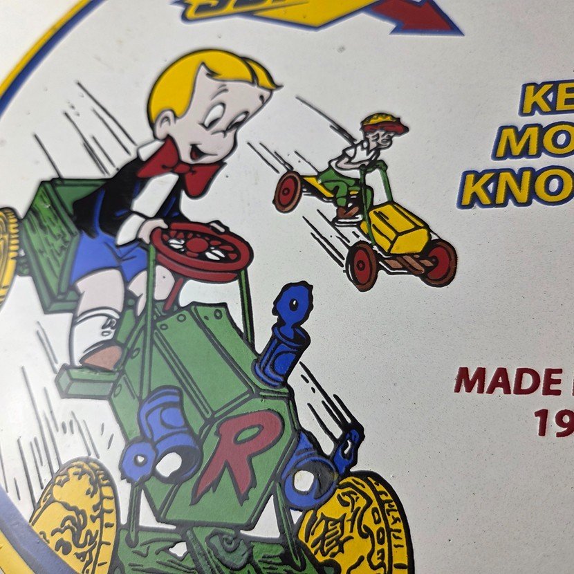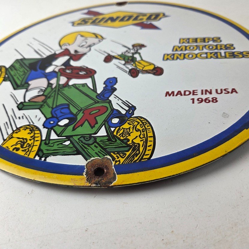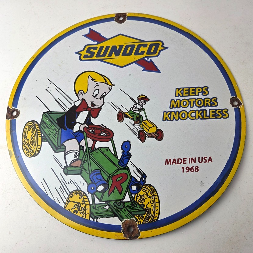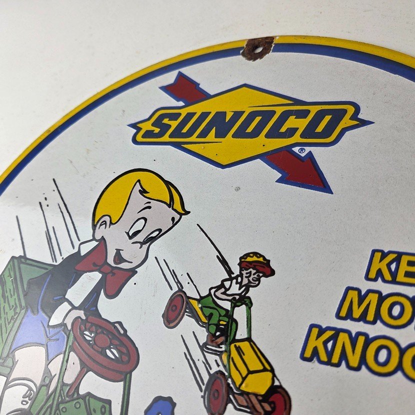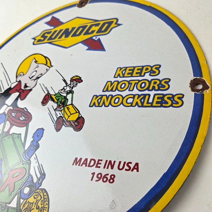 This vintage porcelain sign features the beloved character Richie Rich and the iconic Sunoco Motor Oil brand.