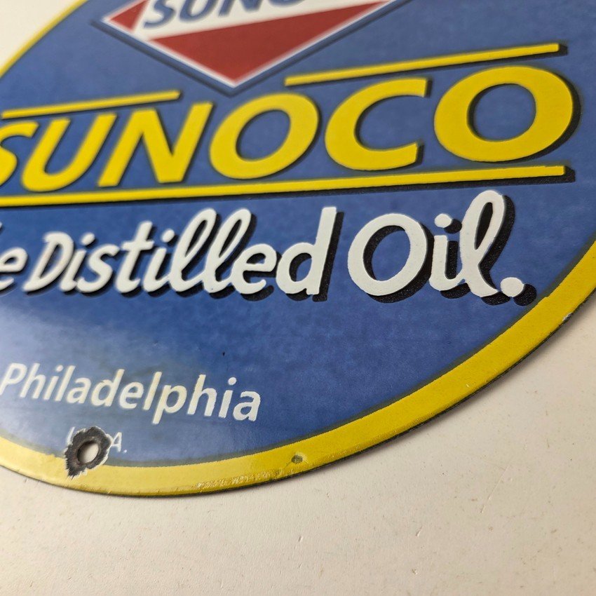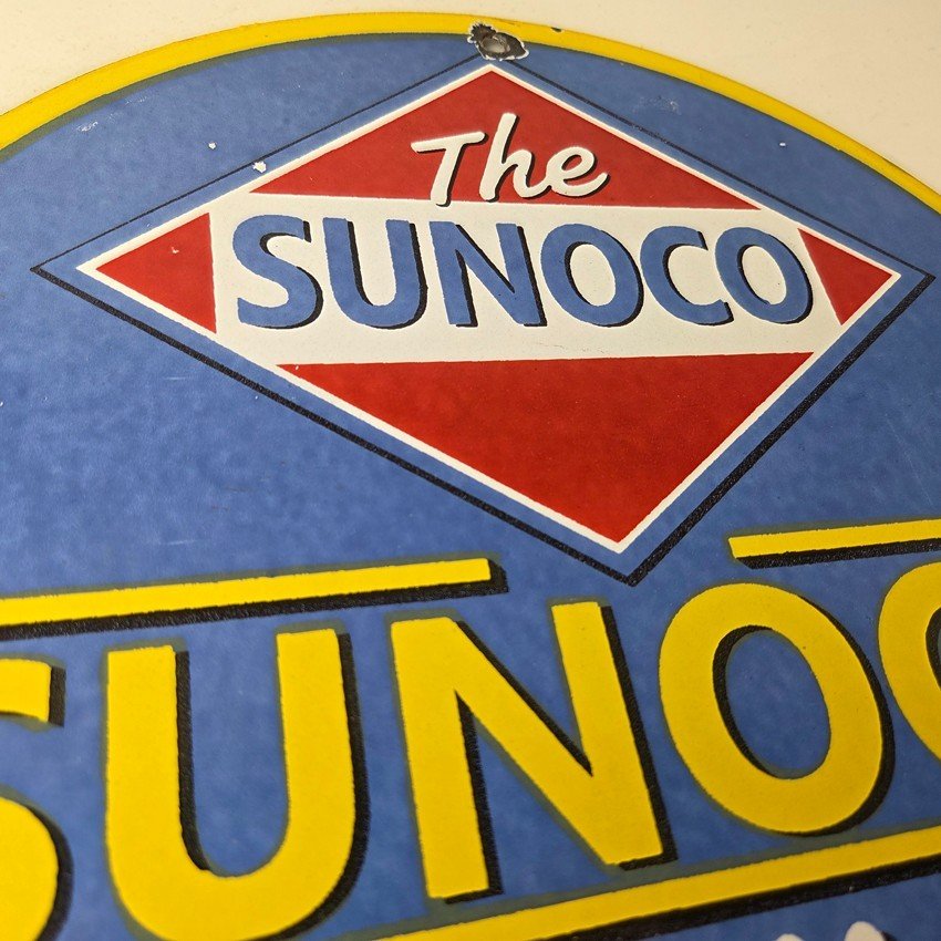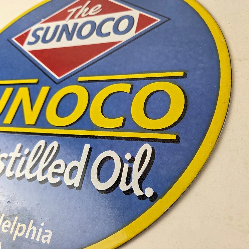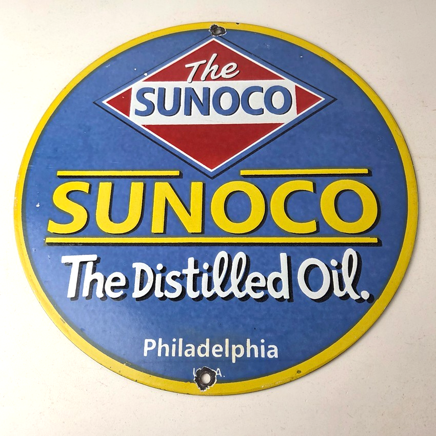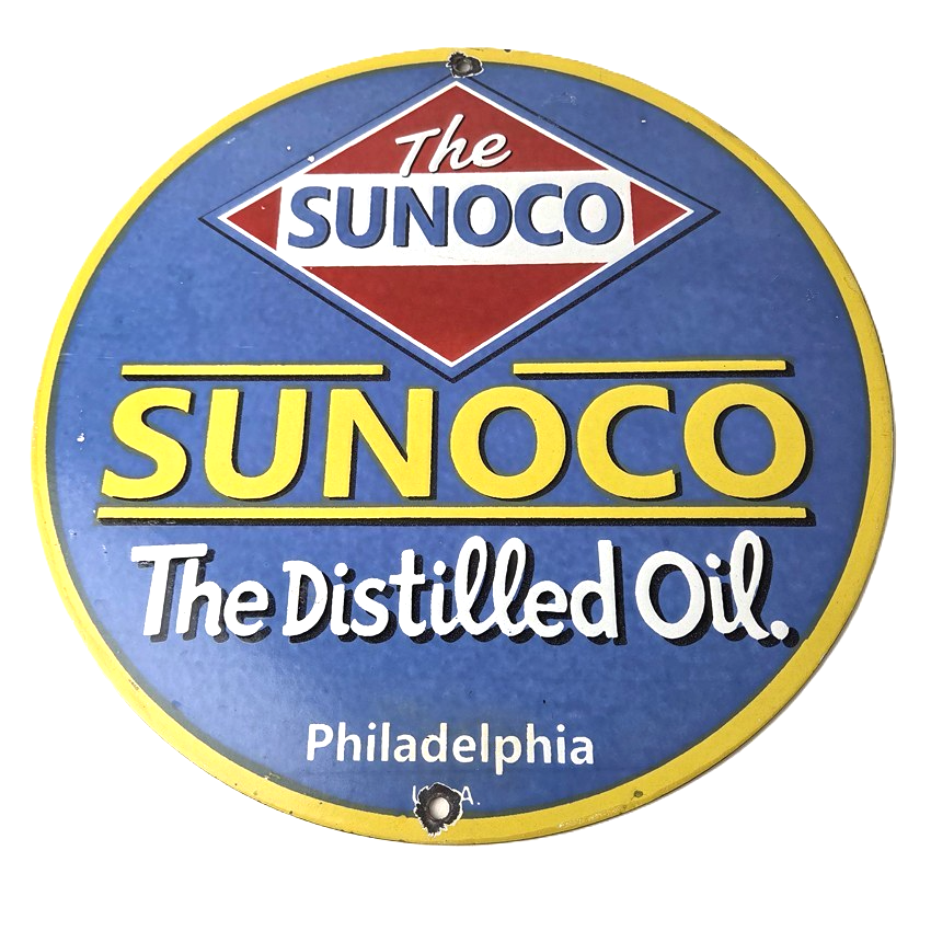 This vintage Sunoco Motor Oil porcelain sign features the iconic Sunoco lettering. This sign has excellent large lettering and porcelain. The sign measures 12″.