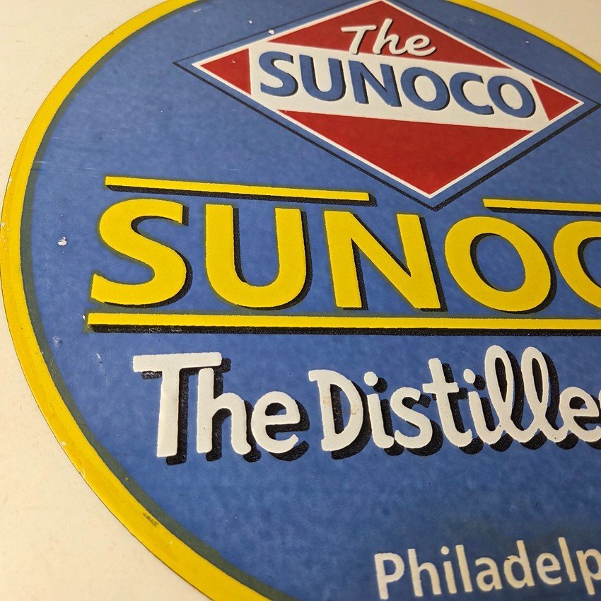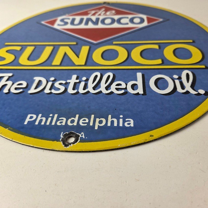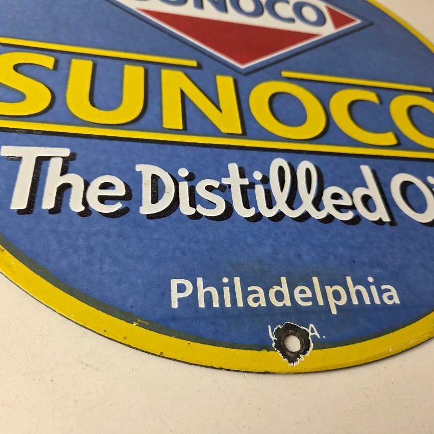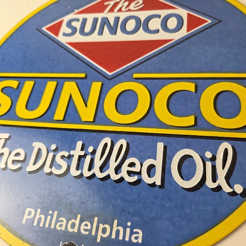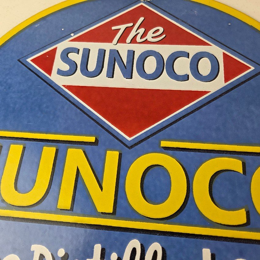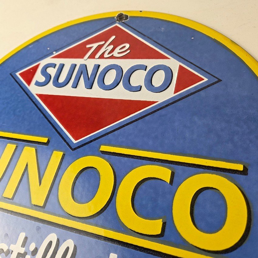 This vintage Sunoco Motor Oil porcelain sign features the iconic Sunoco lettering. This sign has excellent large lettering and porcelain. The sign measures 12″.