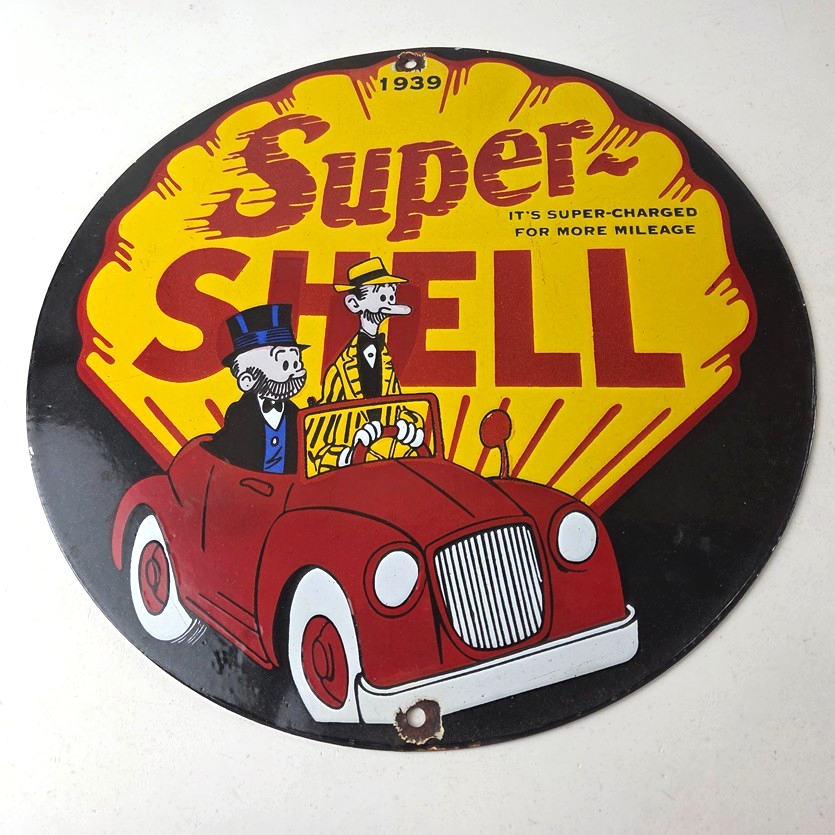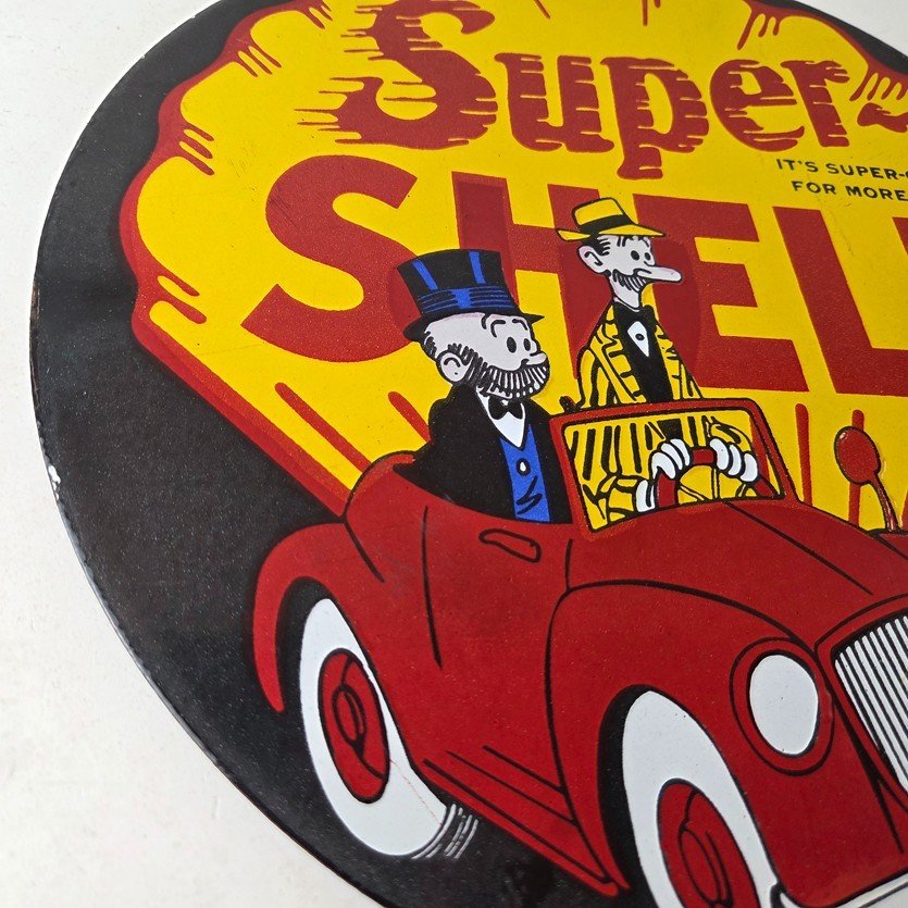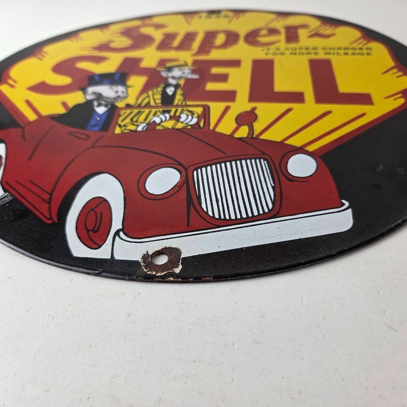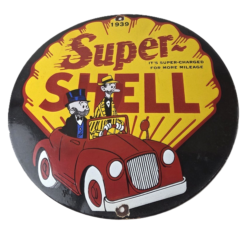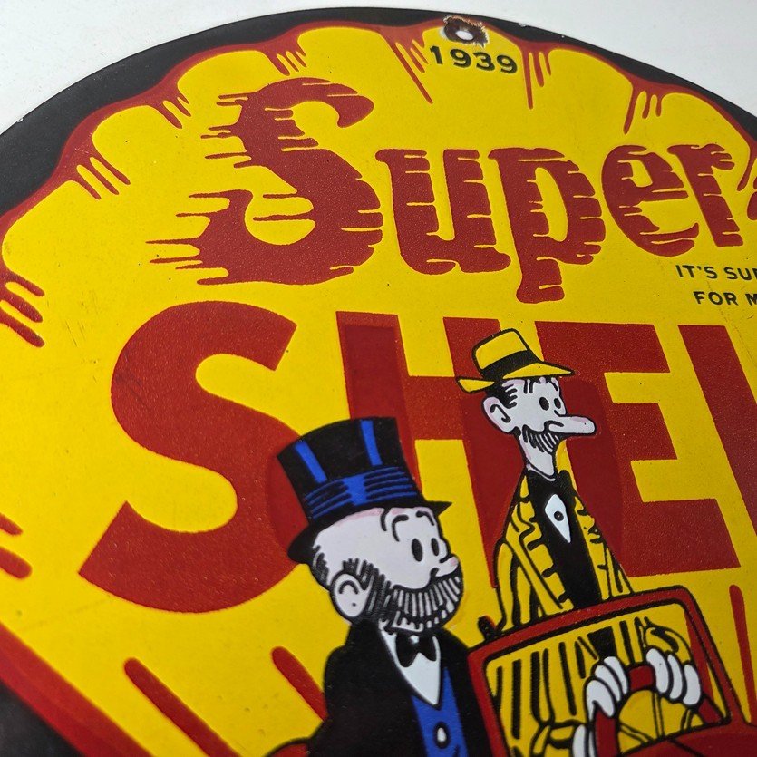 This vintage Shell Gasoline porcelain sign features the iconic Super Shell Gasoline branding and is made of porcelain. The sign measures 12″ across and features Shell blend and is designed for use on a Shell car pump.