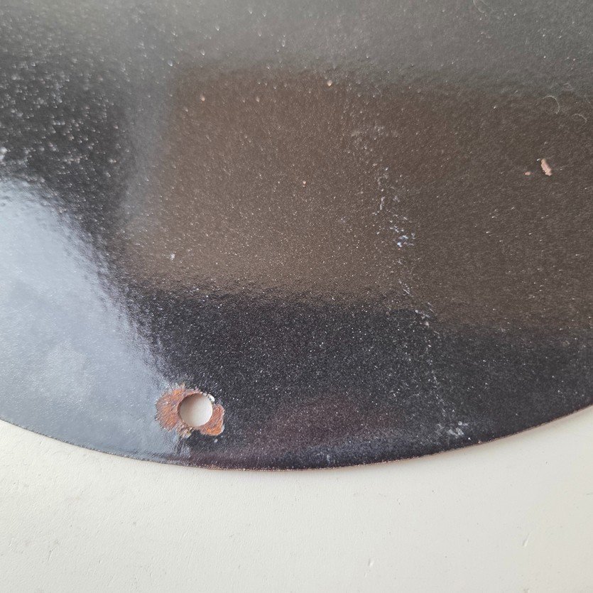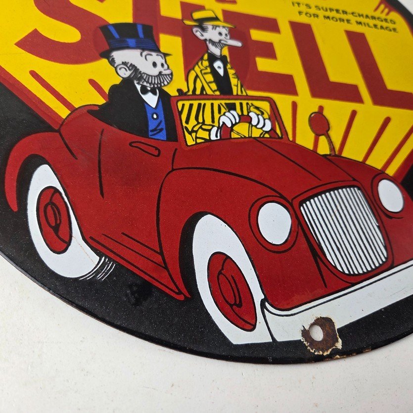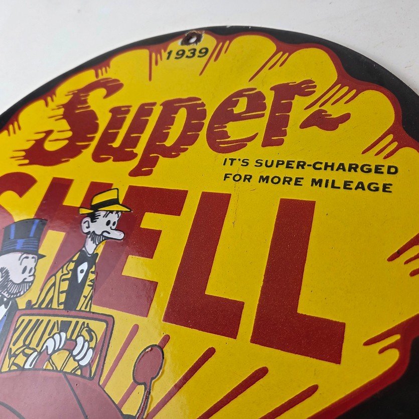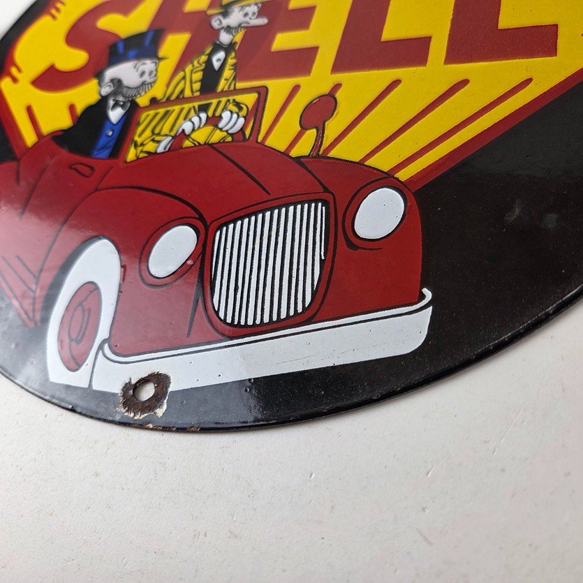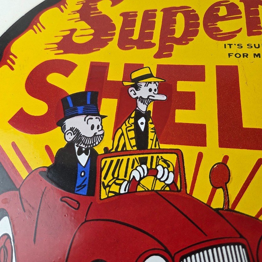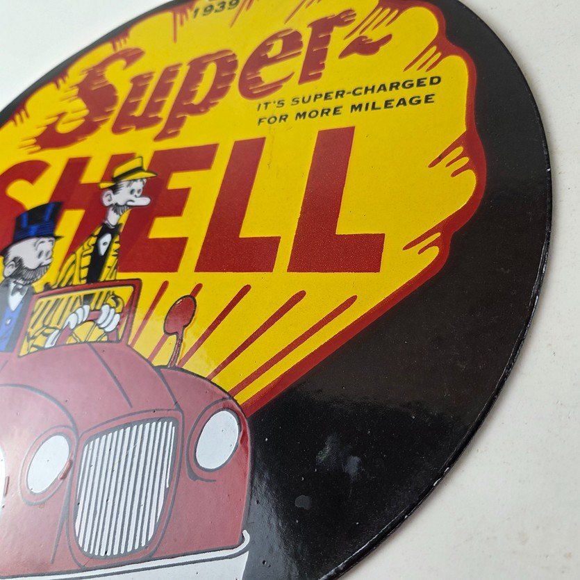 This vintage Shell Gasoline porcelain sign features the iconic Super Shell Gasoline branding and is made of porcelain. The sign measures 12″ across and features Shell blend and is designed for use on a Shell car pump.