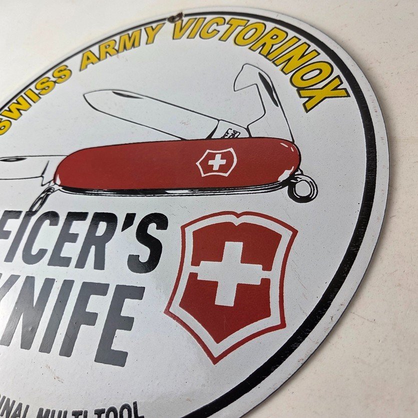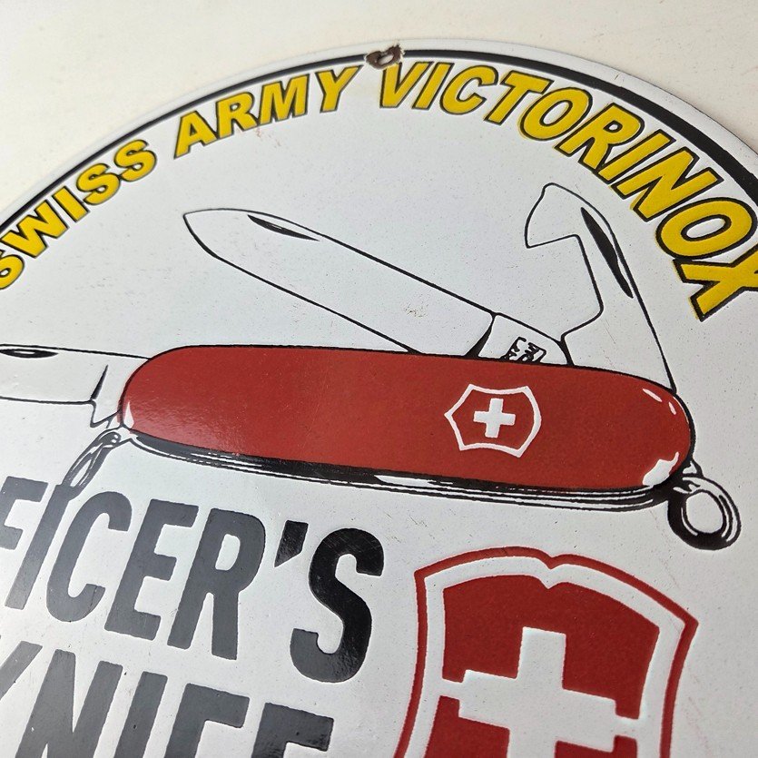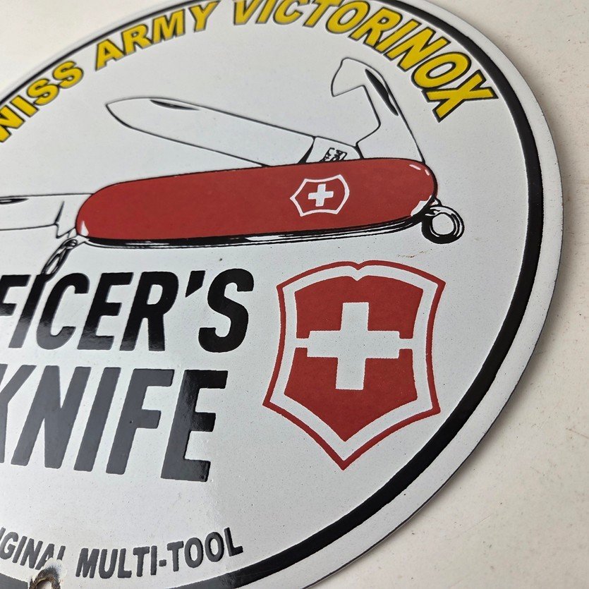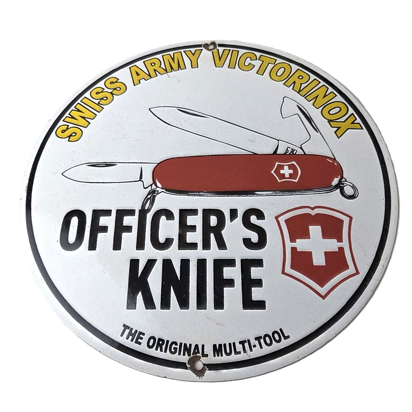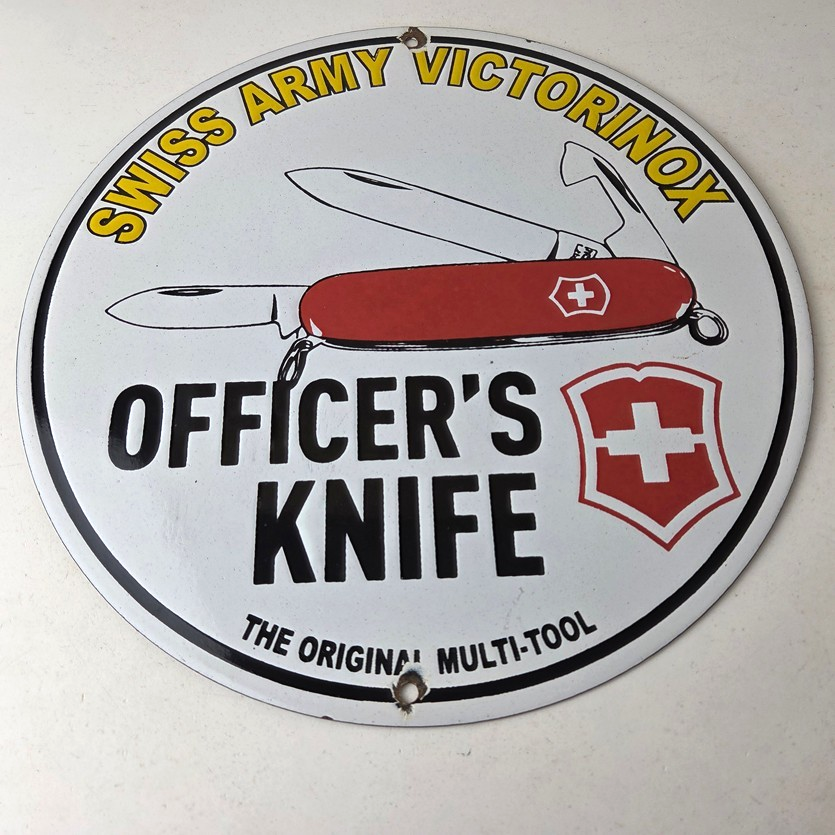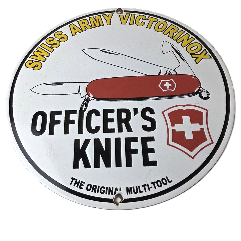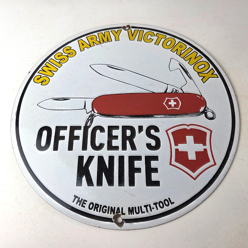 This vintage Swiss Army Victorinox porcelain sign features the iconic Knife brand and measures 12″. The sign has excellent porcelain and colors.