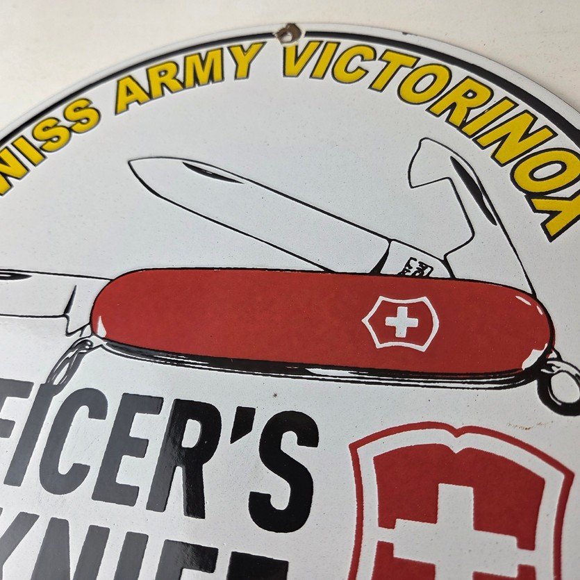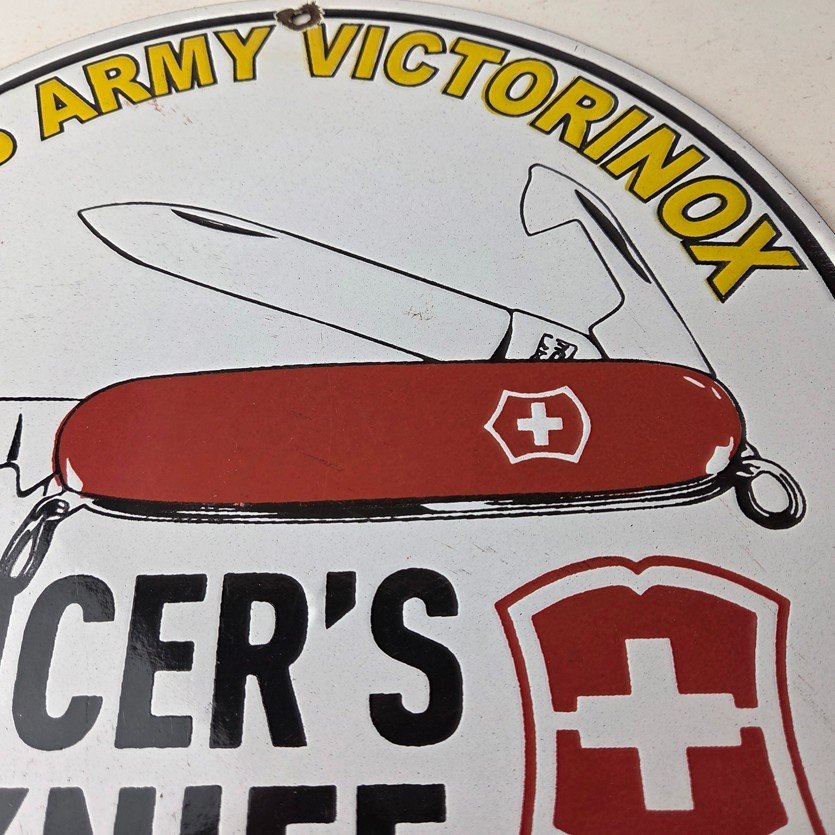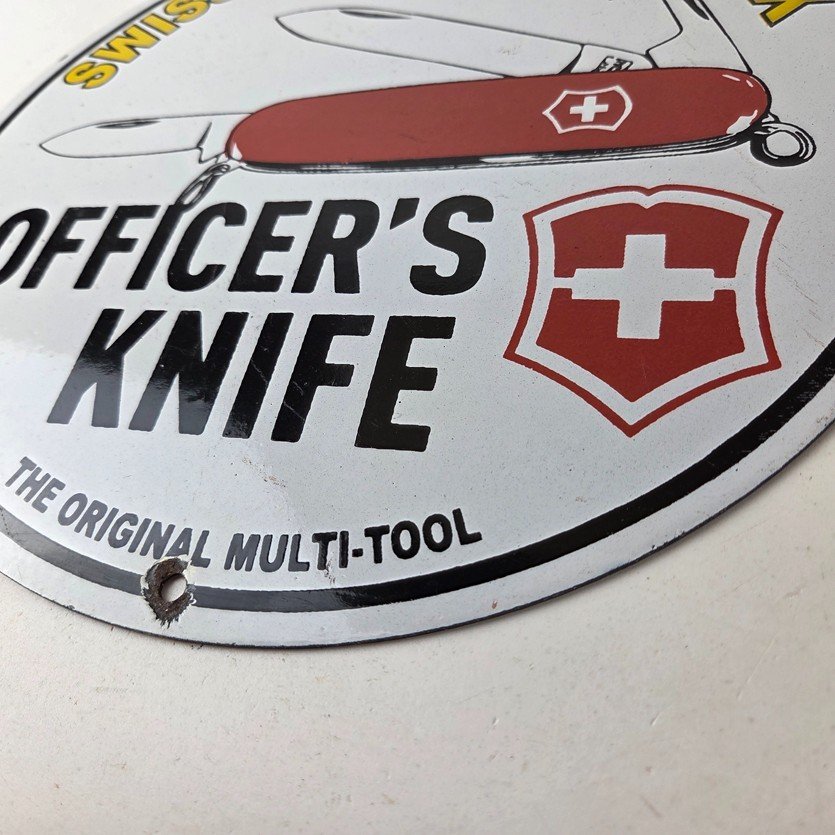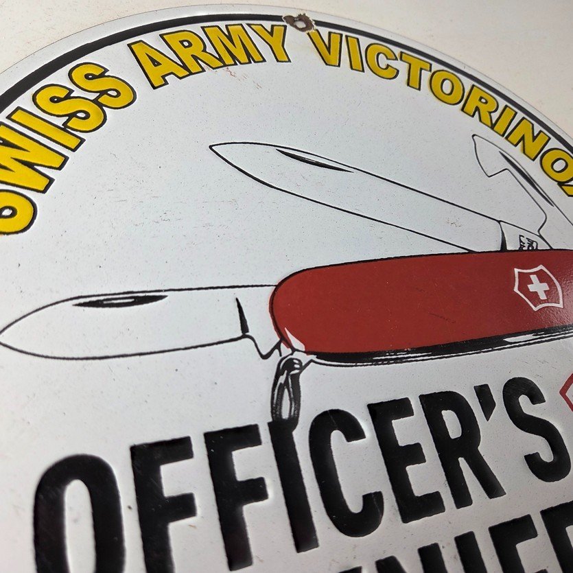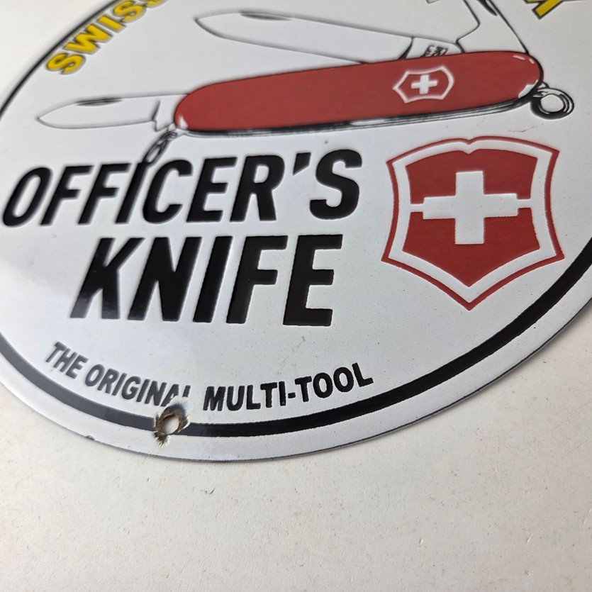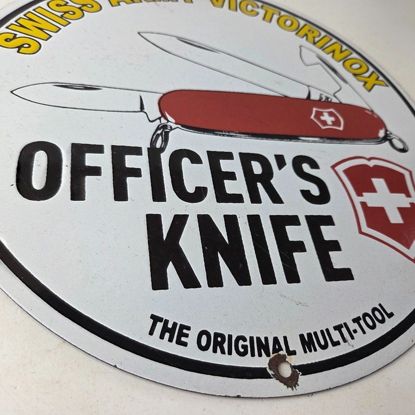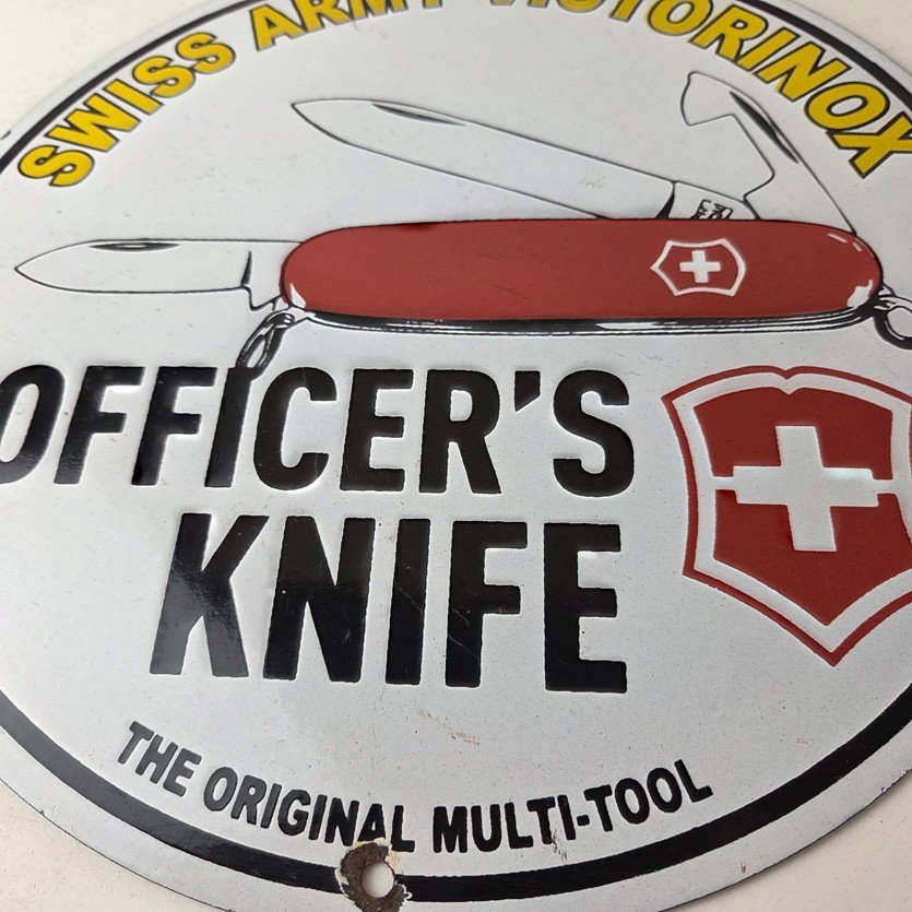 This vintage Swiss Army Victorinox porcelain sign features the iconic Knife brand and measures 12″. The sign has excellent porcelain and colors.