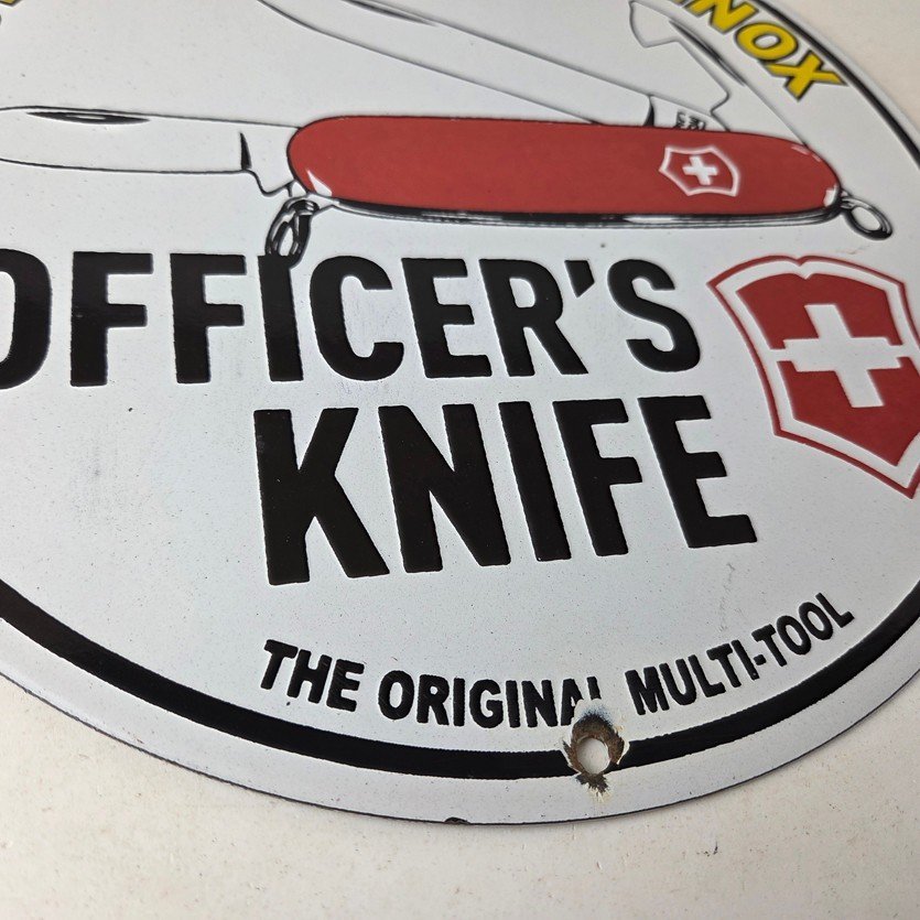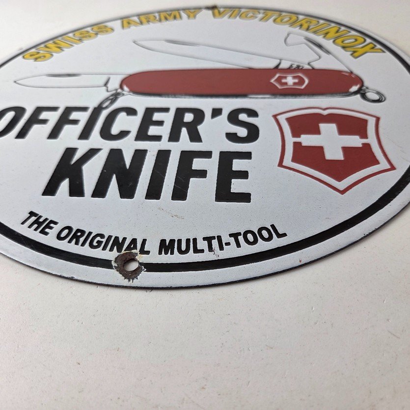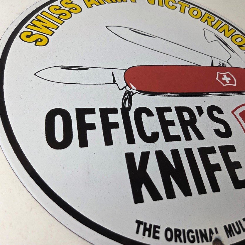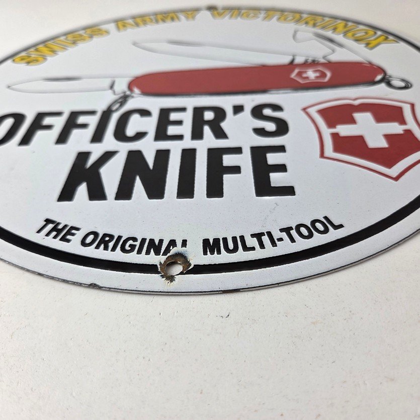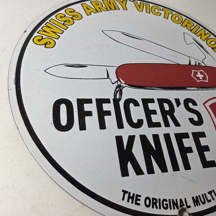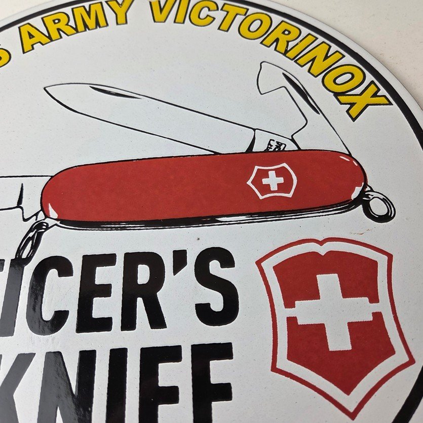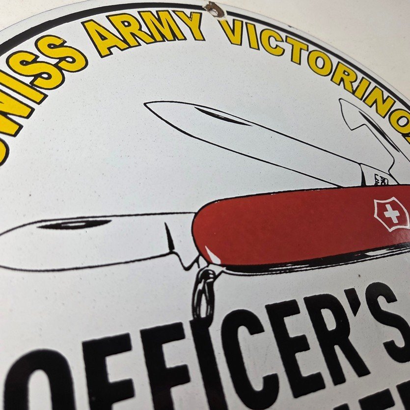 This vintage Swiss Army Victorinox porcelain sign features the iconic Knife brand and measures 12″. The sign has excellent porcelain and colors.