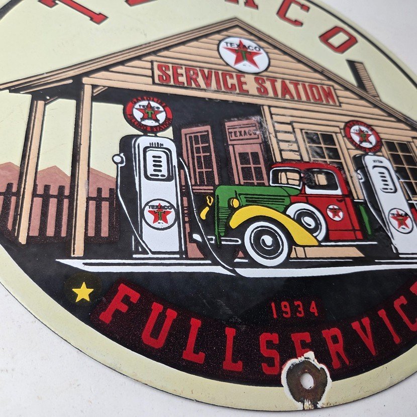 This is a vintage Texaco service station porcelain sign (also known as a Texaco Motor Oil enamel porcelain gas pump sign), measuring 12 inches round. It features the classic 1934 full-service scene: “TEXACO” arched across the top in red on cream, a detailed illustration of a wooden service station with “SERVICE STATION” banner, two Texaco pumps, a green-and-red 1930s pickup truck being fueled, Texaco star logos on the pumps and building, and “FULL SERVICE 1934” at the bottom with stars — a classic Texaco gasoline and service advertising sign.