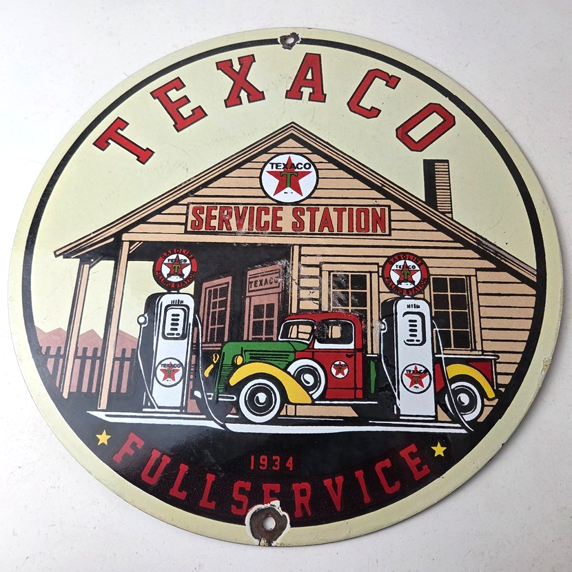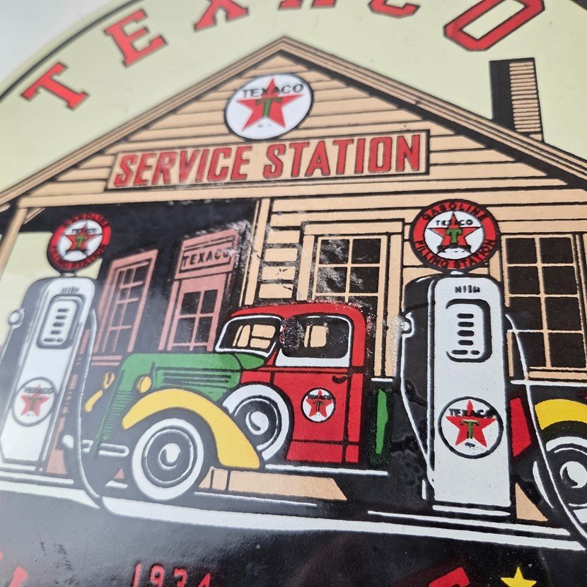 This vintage Texaco 1934 service station sign makes a great addition to a garage, shop display, man cave, or any Texaco memorabilia collection, vintage gas station advertising collection, or petroliana collection.