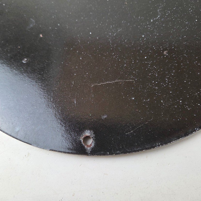 Made of porcelain enamel on steel with patina and wear: rust spotting around the mounting holes, minor edge chips, light surface scratches, and minimal discoloration. This is a porcelain enamel advertising sign in excellent condition, exactly as shown in the photos.