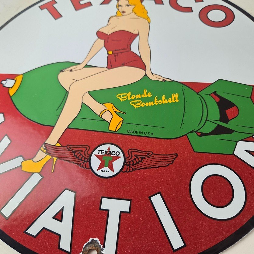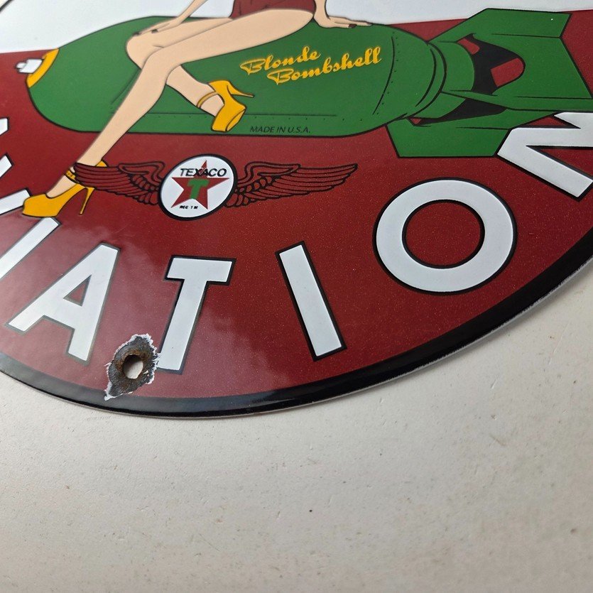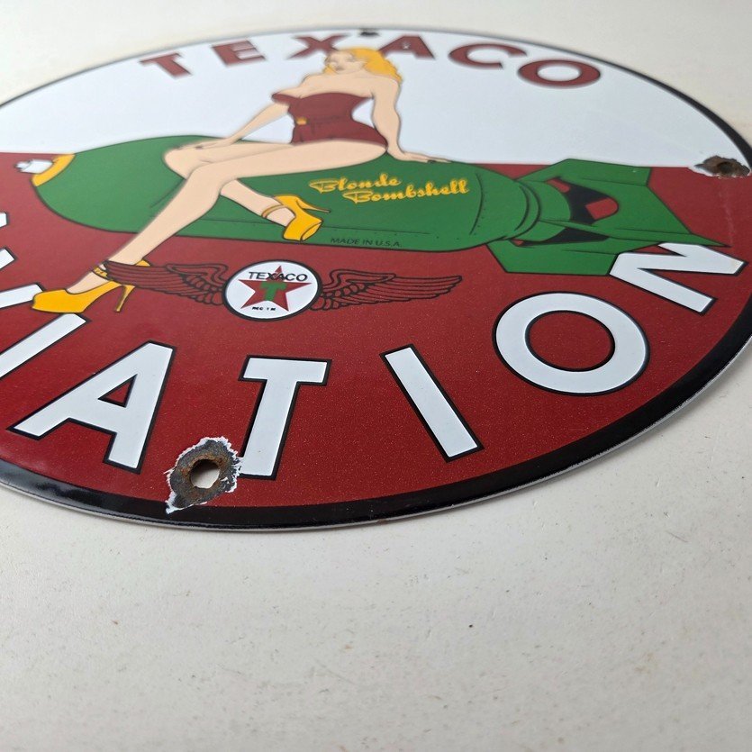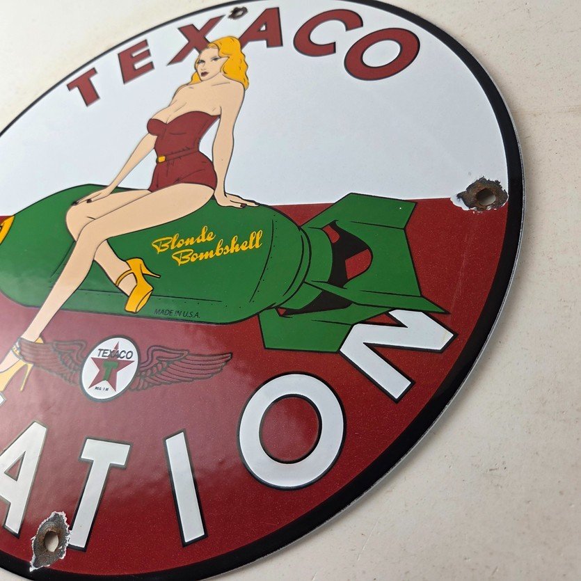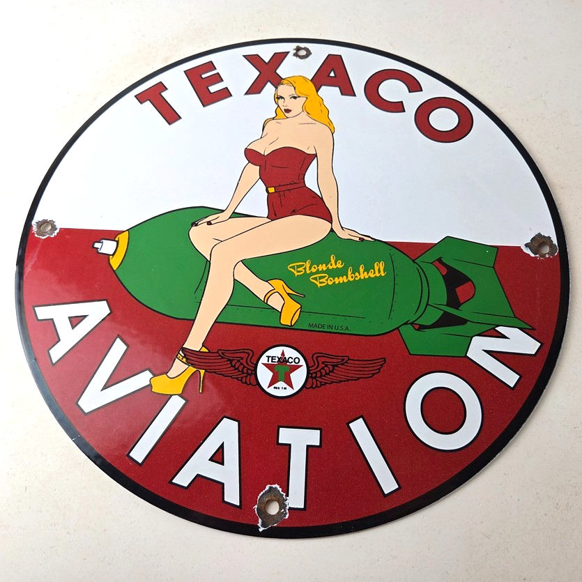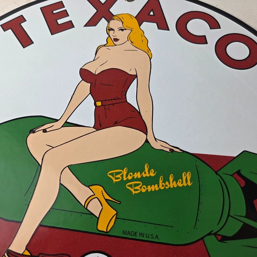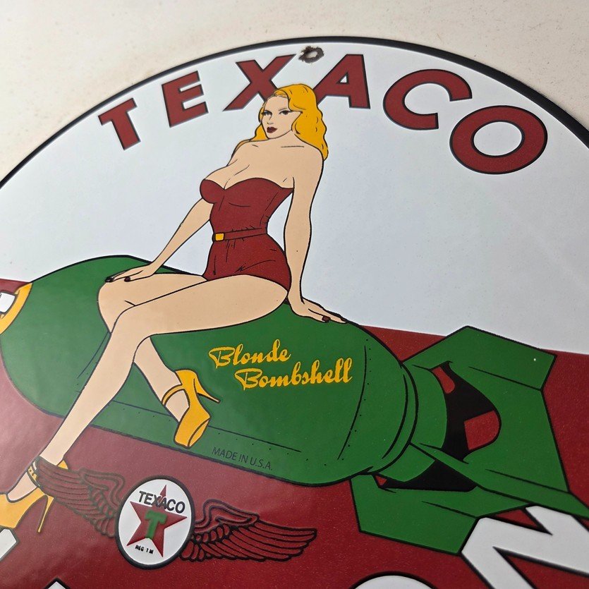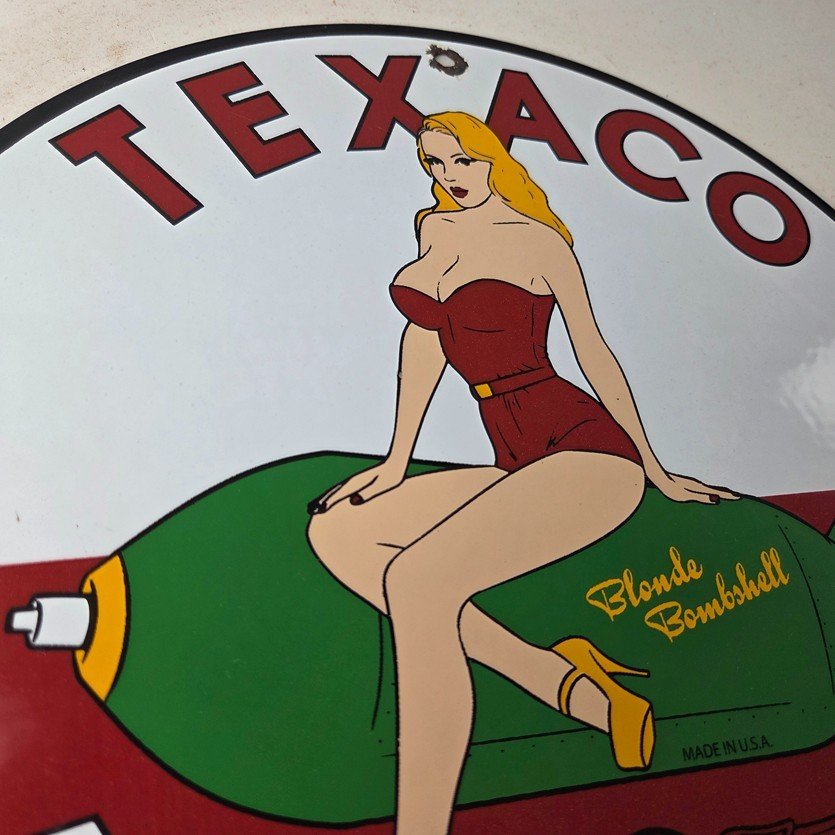 This vintage Texaco Gasoline porcelain sign features a striking design with bold Texaco red colors and is made of porcelain. It is perfect for display in a garage, shop, or man cave. The sign measures 11 3/4″ and is in excellent condition, with no major chips or cracks. It was made in the United States and has excellent porcelain and colors.