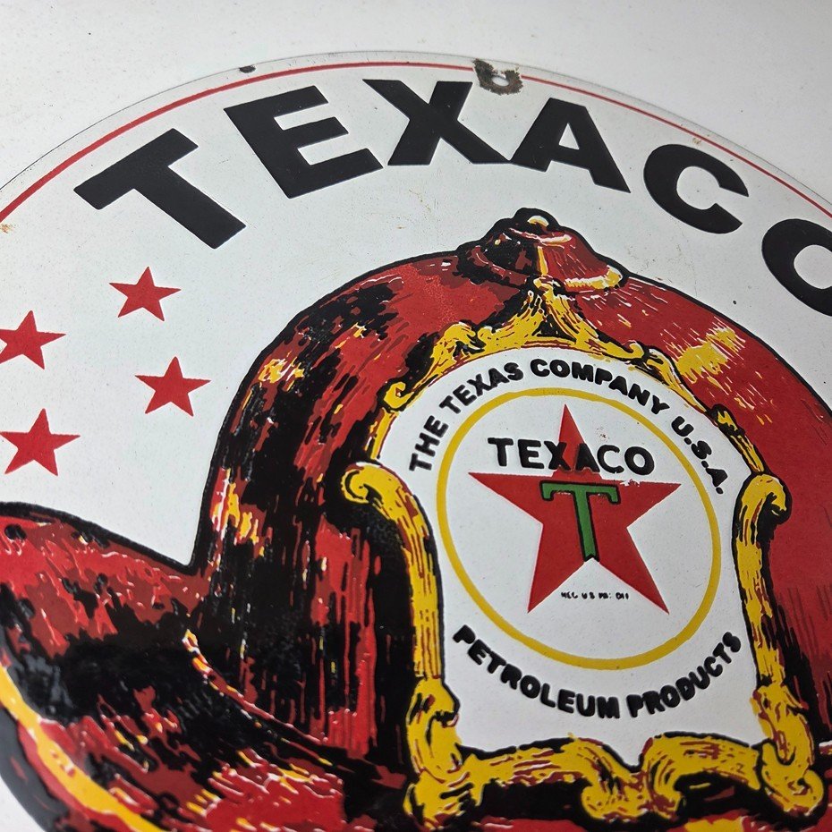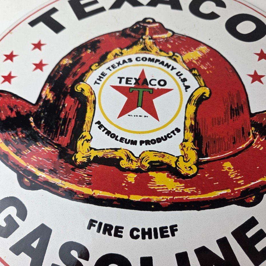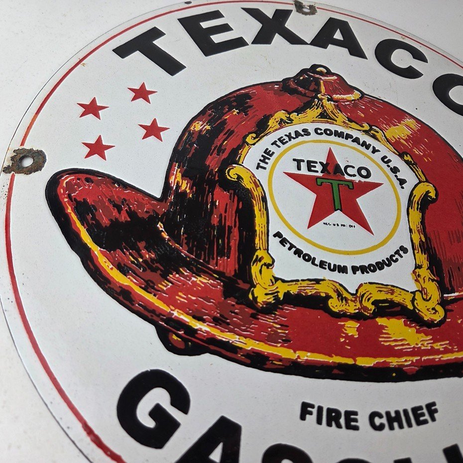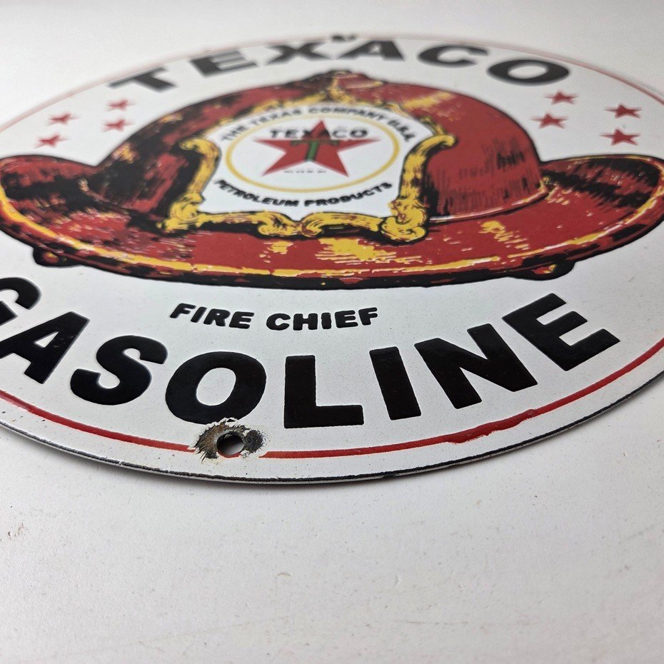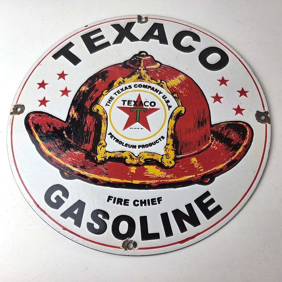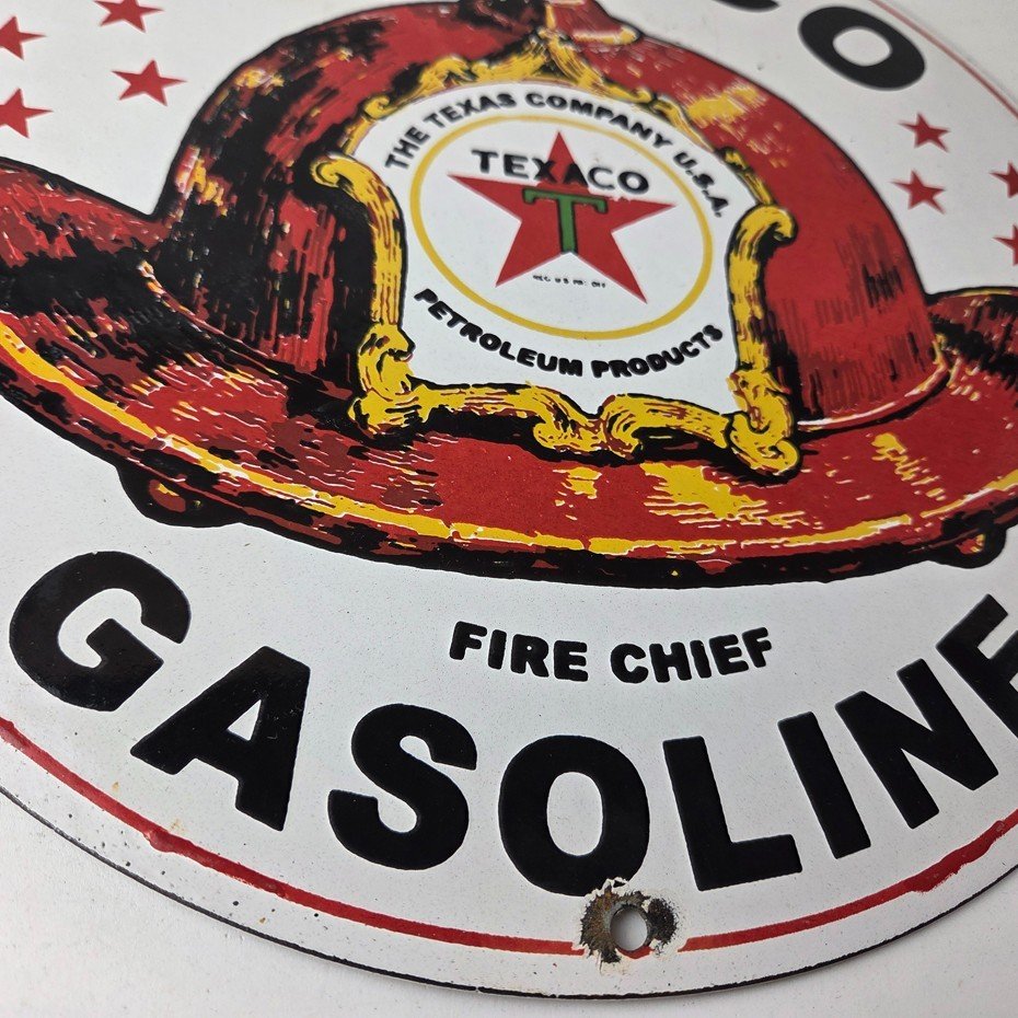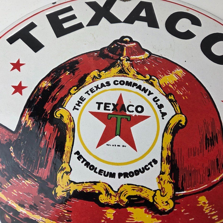 This vintage Texaco Gasoline porcelain sign features Texaco Gasoline and the iconic Fireman hat. The sign boasts vibrant colors, making it perfect for any collector of gas and oil advertising memorabilia. The sign is made of porcelain and is in excellent shape, showcasing the durability and craftsmanship of vintage gas pump signs.