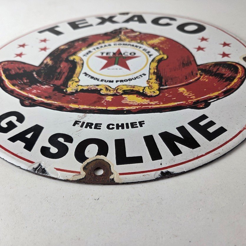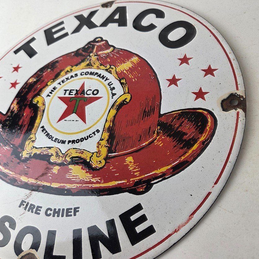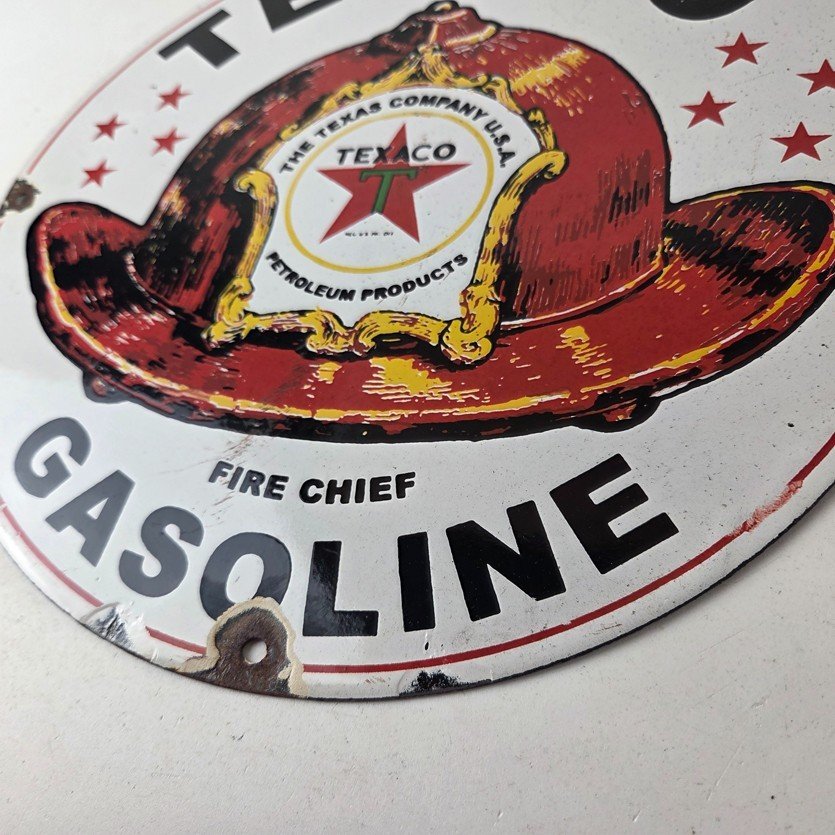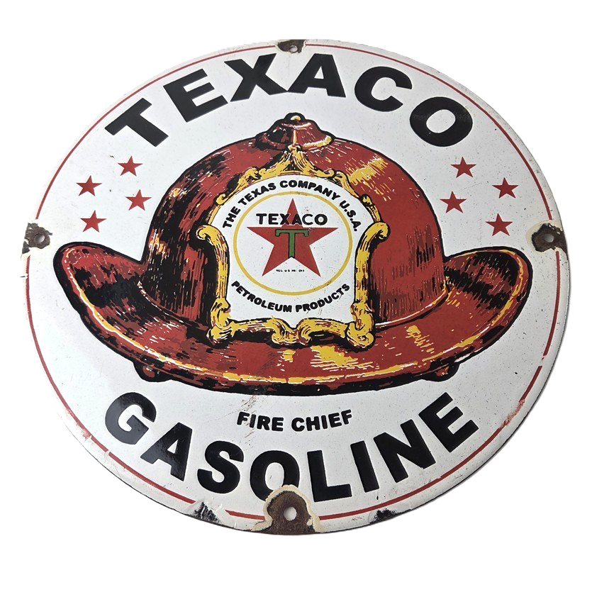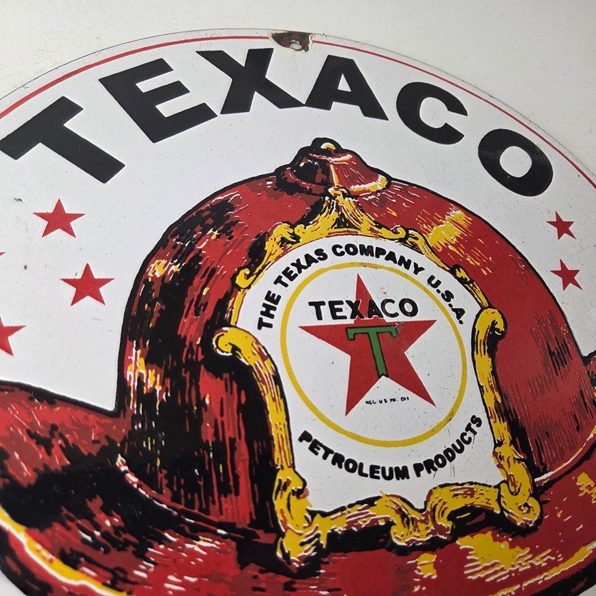 This vintage Texaco Gasoline porcelain sign features Texaco Gasoline and the iconic Fireman hat. The sign boasts vibrant colors, making it perfect for any collector of gas and oil advertising memorabilia. The sign is made of porcelain and is in excellent shape, showcasing the durability and craftsmanship of vintage gas pump signs.