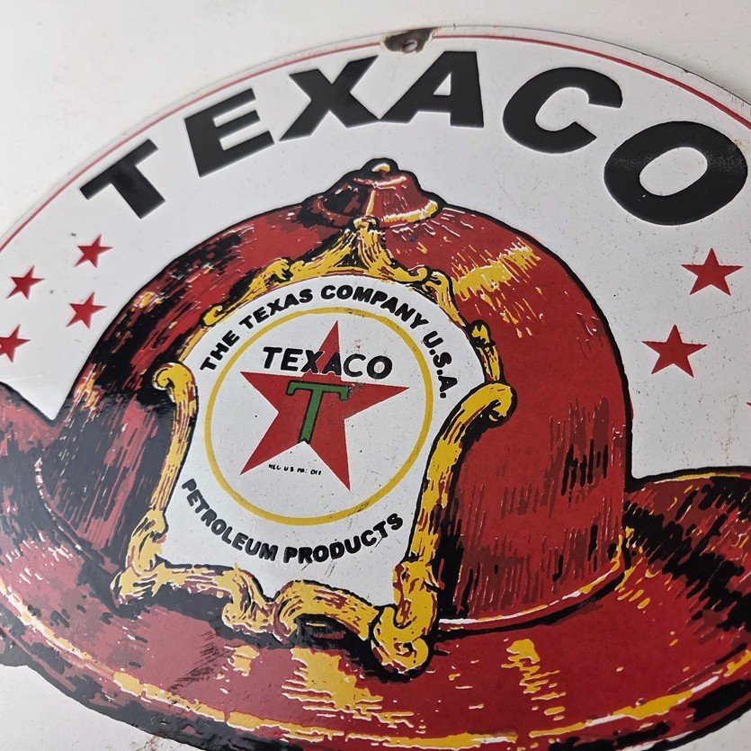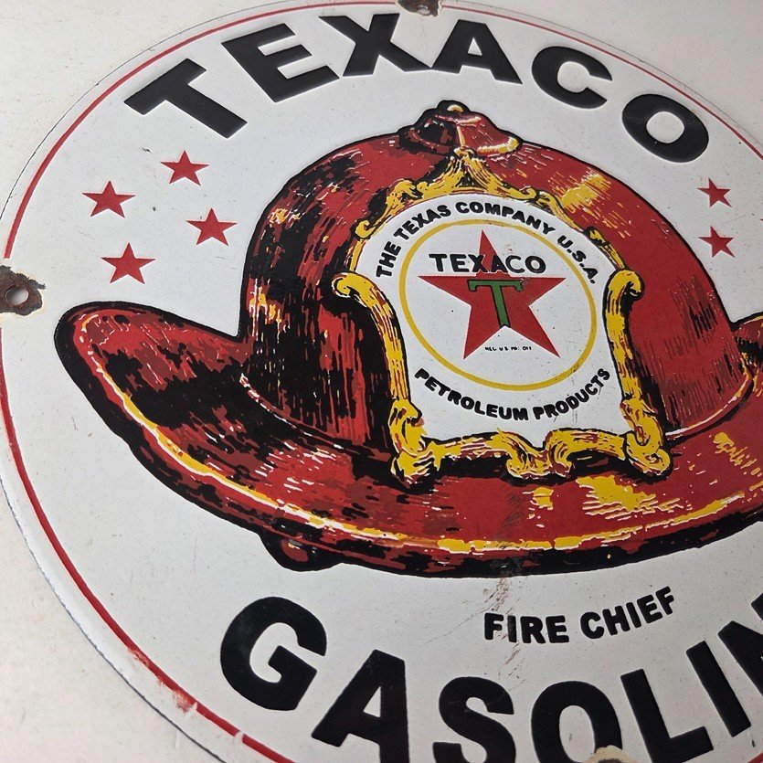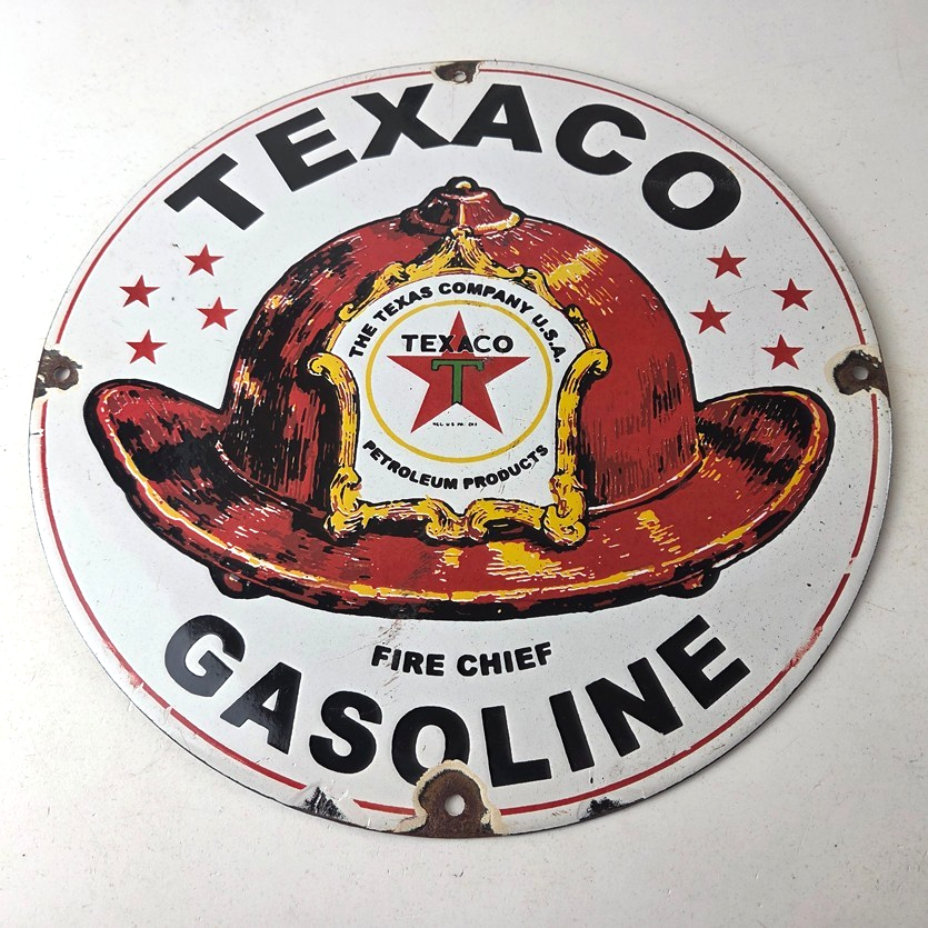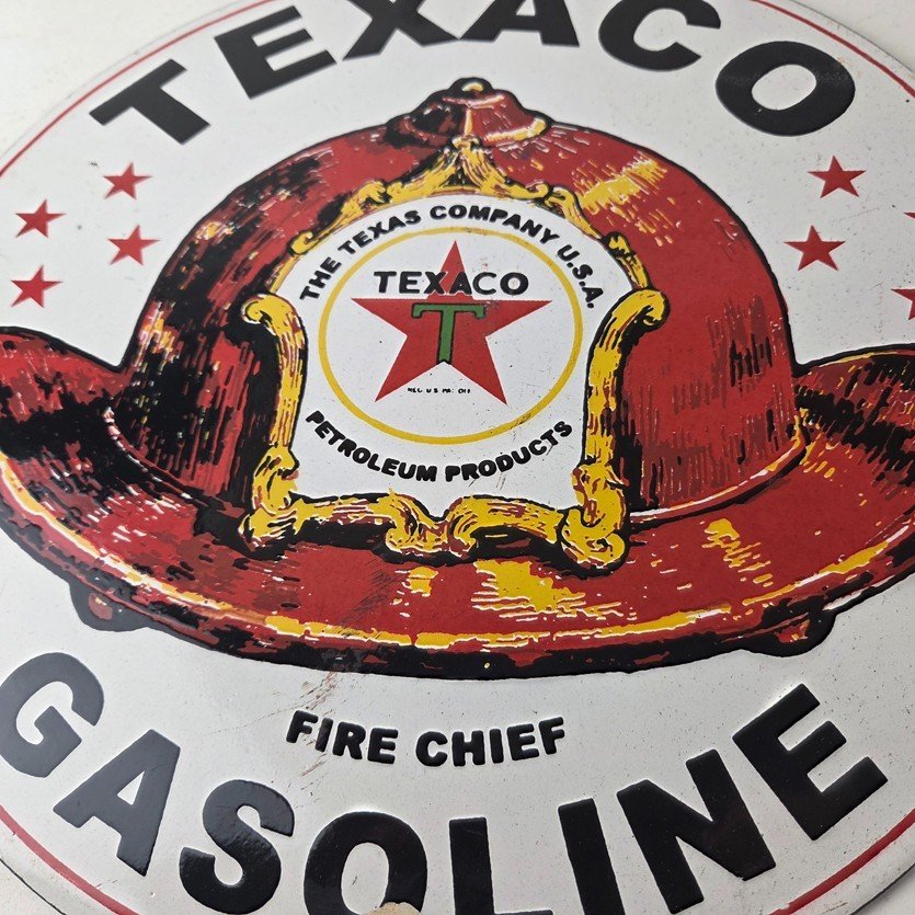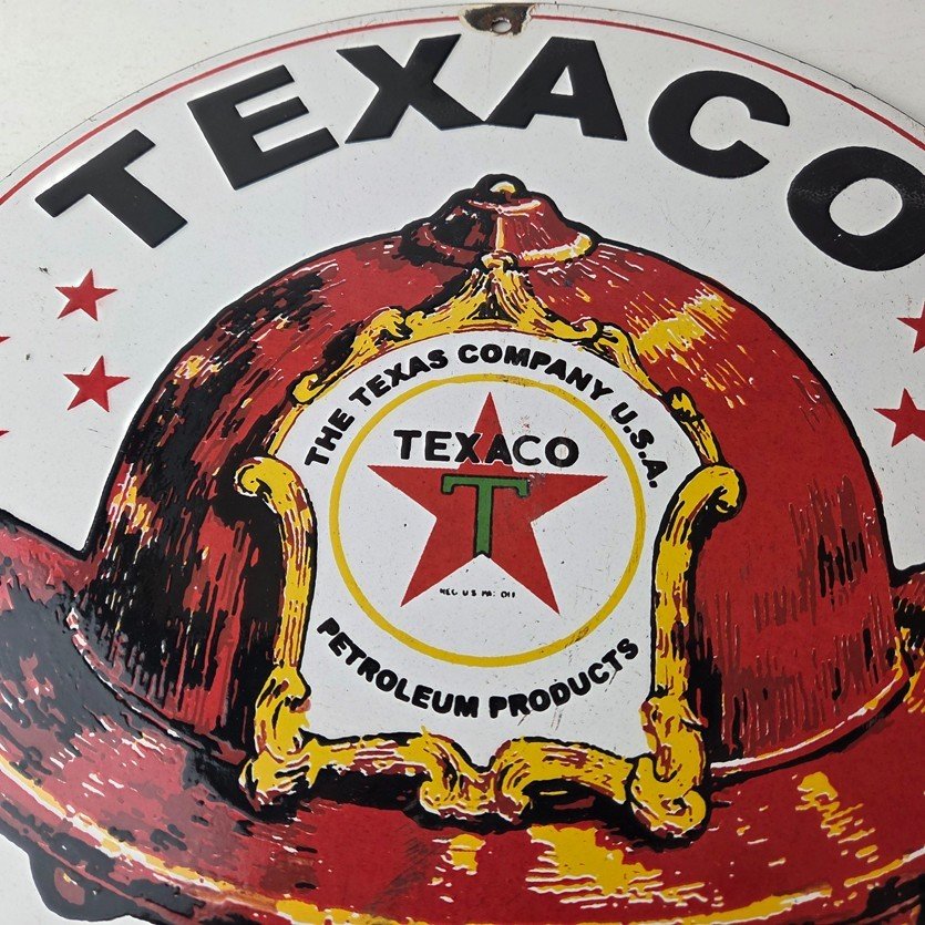 This vintage Texaco Gasoline porcelain sign features Texaco Gasoline and the iconic Fireman hat. The sign boasts vibrant colors, making it perfect for any collector of gas and oil advertising memorabilia. The sign is made of porcelain and is in excellent shape, showcasing the durability and craftsmanship of vintage gas pump signs.