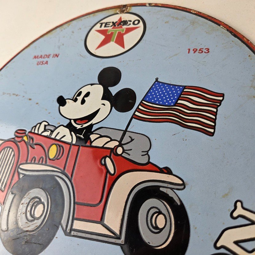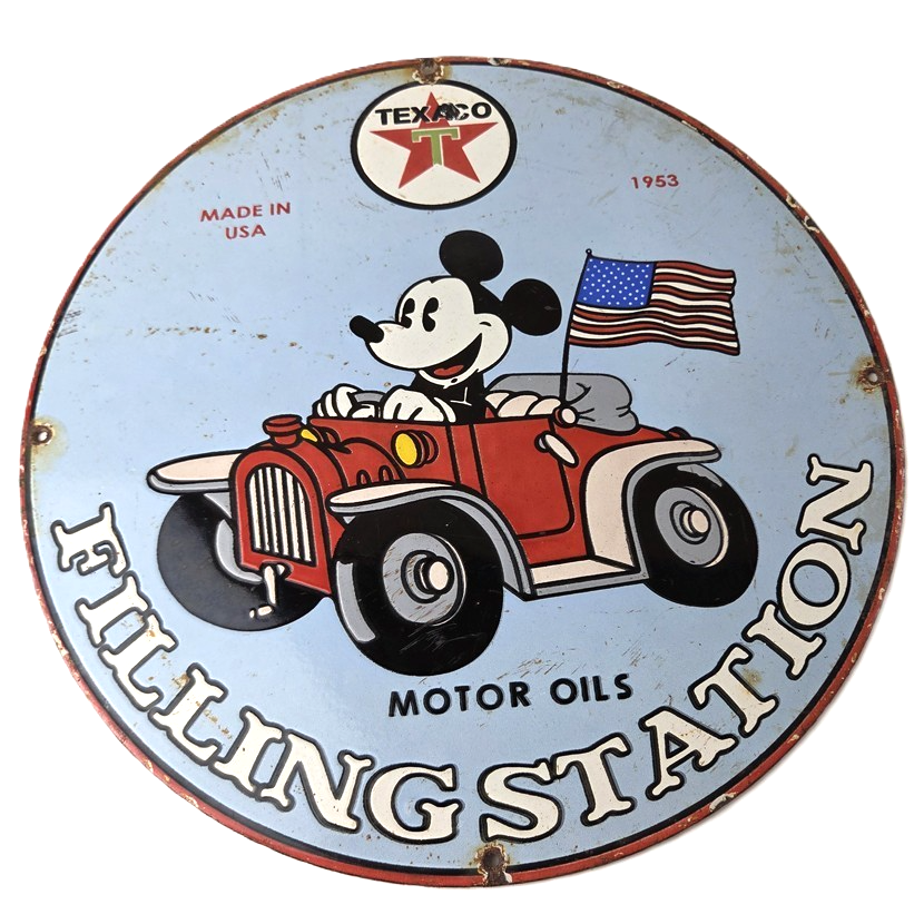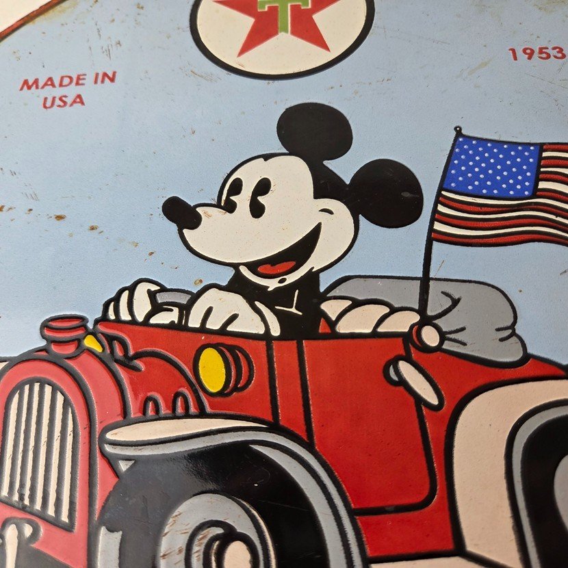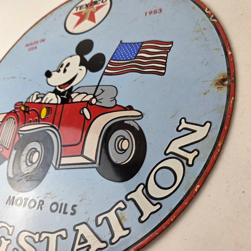 This vintage Texaco Gasoline porcelain sign features the beloved Walt Disney character, Mickey Mouse, and is the perfect addition to any gas and oil or advertising collectibles collection.