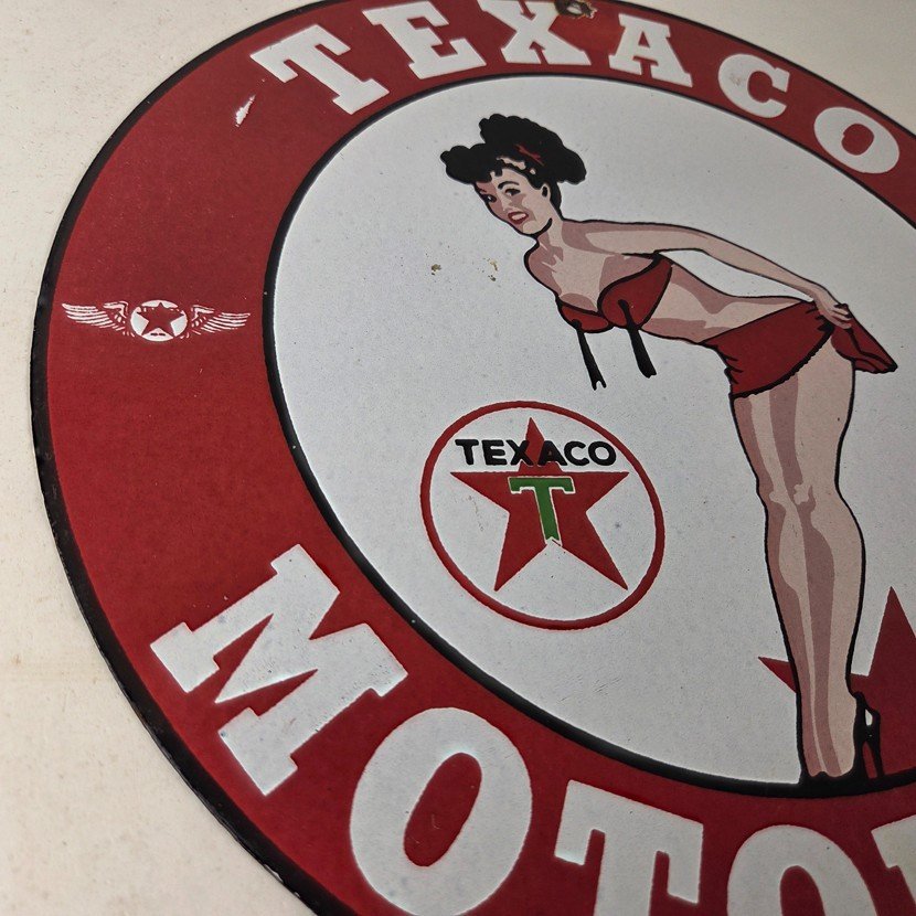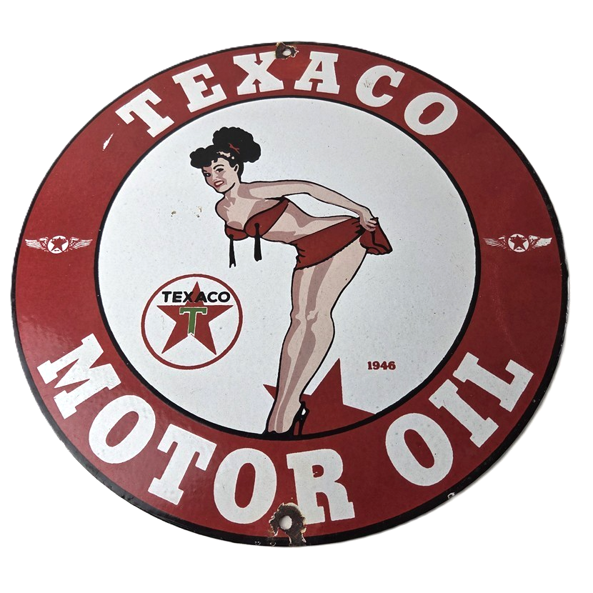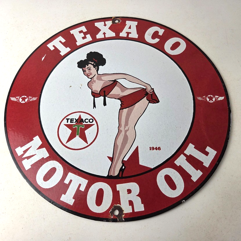 This vintage Texaco pin-up girl sign makes a great addition to a garage, shop display, man cave, or any Texaco memorabilia collection, vintage gas station advertising collection, or Petrolina collection.