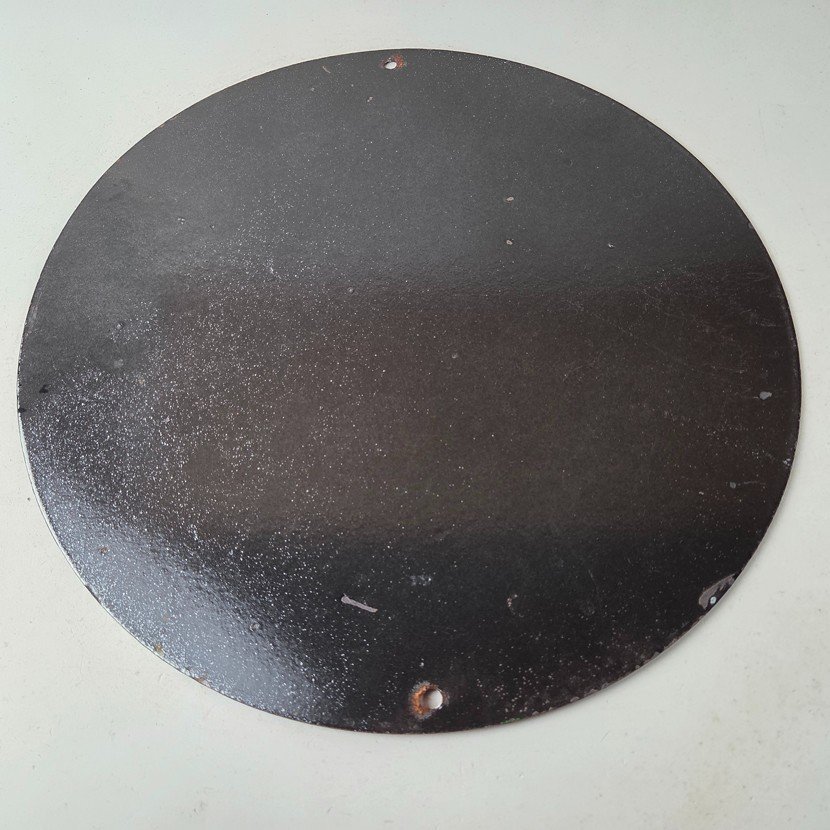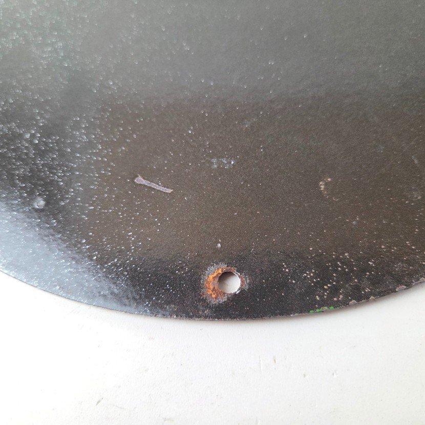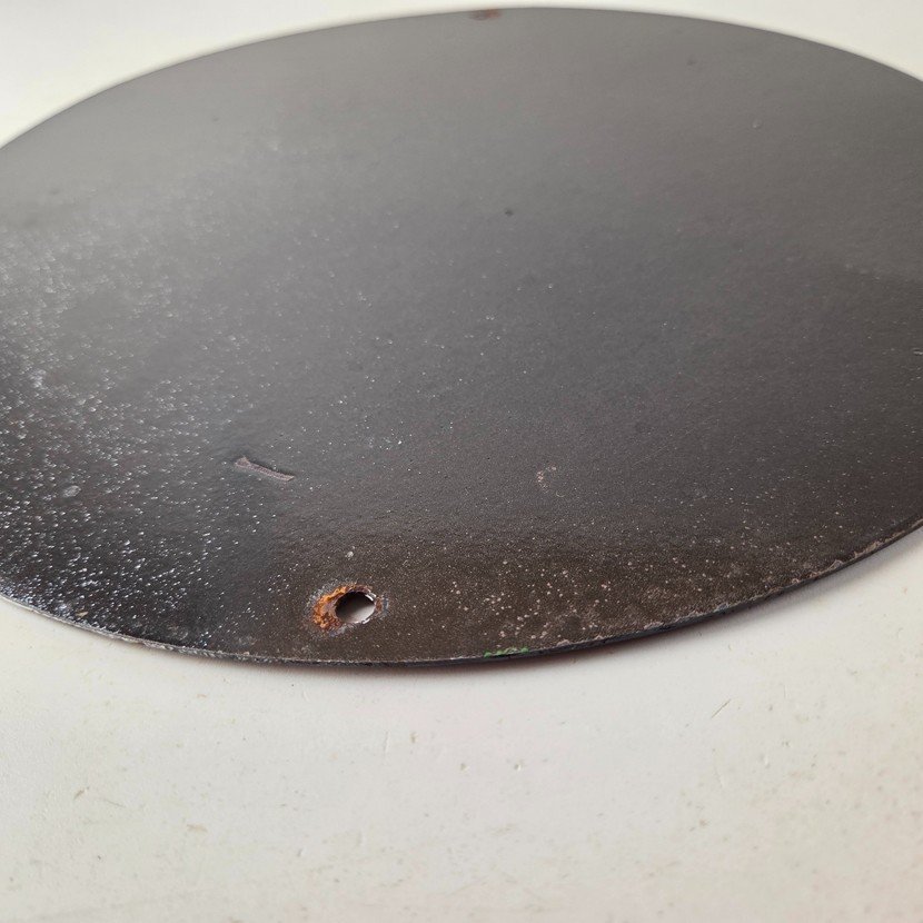 Made of porcelain enamel on steel with patina and wear: rust spotting around the mounting holes, minor edge chips, light surface scratches, and minimal discoloration. This is a porcelain enamel advertising sign in excellent condition, exactly as shown in the photos.