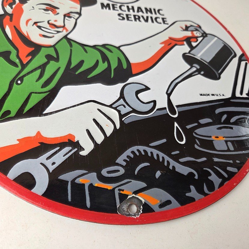 This is a vintage Texaco Mechanic Service porcelain sign (also known as a Texaco gas station attendant pump plate), measuring 12 inches round. It features the classic mid-century mechanic illustration: a smiling man in green uniform and red cap pouring oil from a black can into an engine with wrench in hand, oil dripping onto the block, “TEXACO” star logo with “T” at the top, “MECHANIC SERVICE” in bold white letters, “MADE IN U.S.A.” marking — a classic Texaco approved mechanic service advertising sign.
