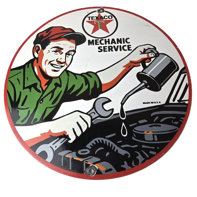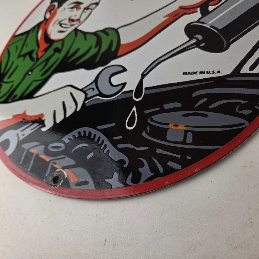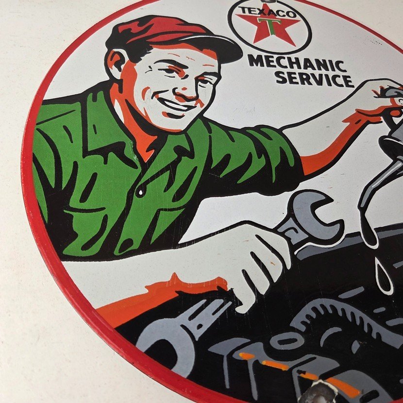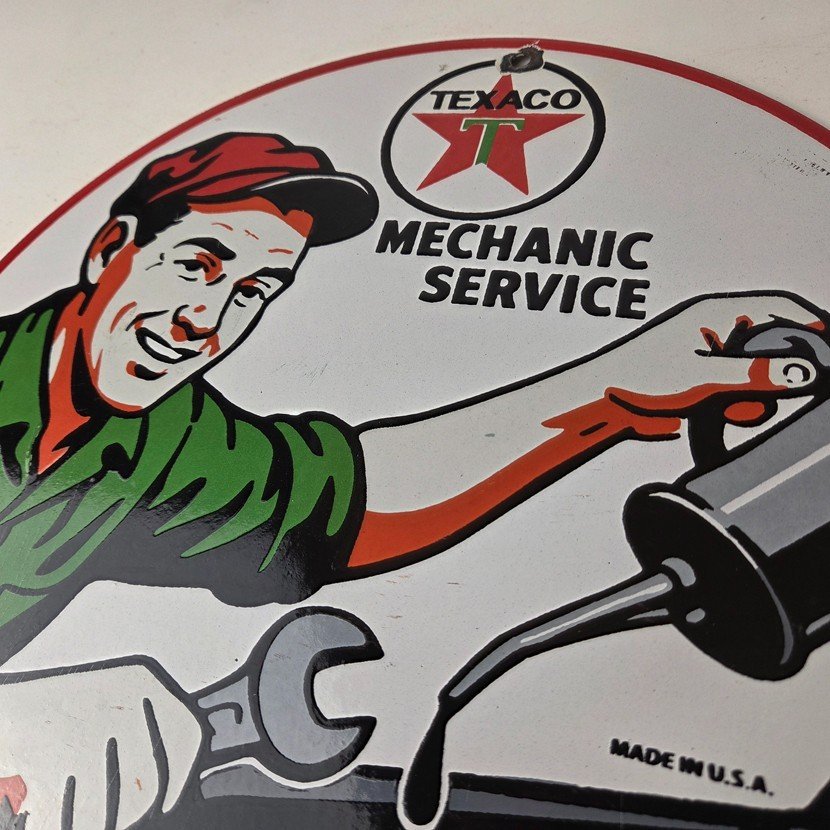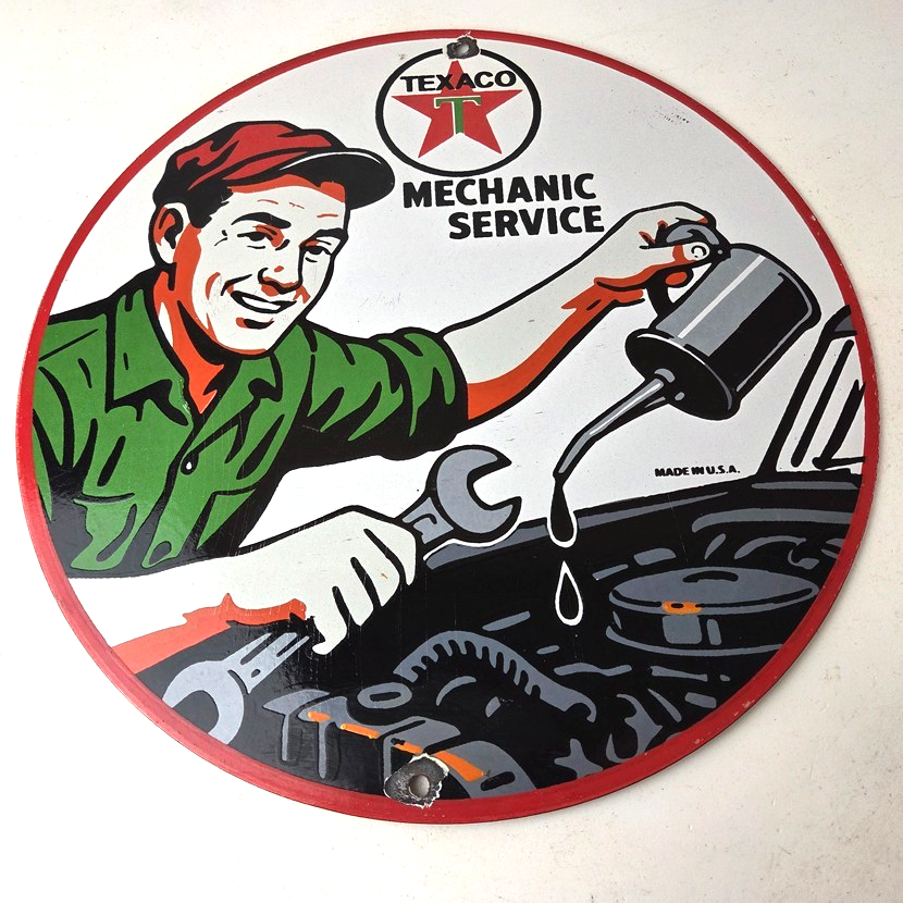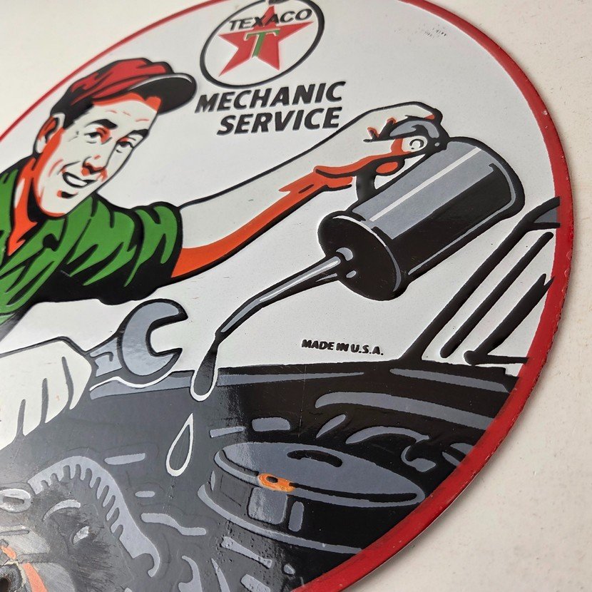 This vintage Texaco mechanic oil pour sign makes a great addition to a garage, shop display, man cave, or any Texaco memorabilia collection, vintage gas station advertising collection, or classic auto service sign collection.