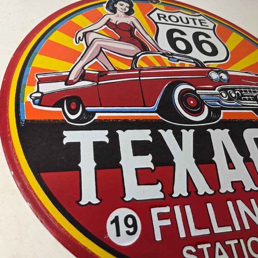 This vintage Texaco Route 66 pin-up sign makes a great addition to a garage, shop display, man cave, or any Texaco memorabilia collection, vintage gas station advertising collection, Route 66 petroliana collection, or classic car sign collection.