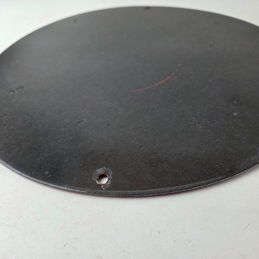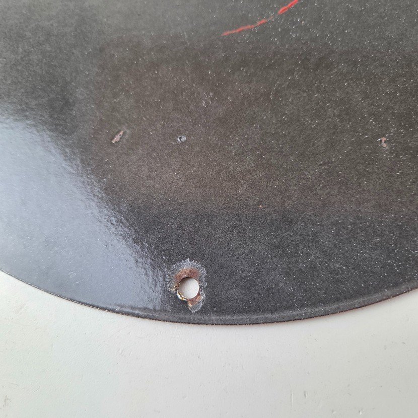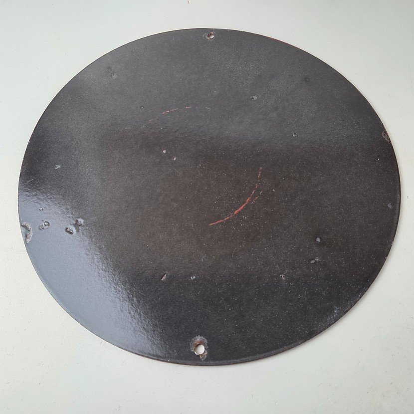 Made of porcelain enamel on steel with patina and wear: rust spotting around the mounting holes, minor edge chips, light surface scratches, and minimal discoloration. This is a porcelain enamel advertising sign in excellent condition, exactly as shown in the photos.