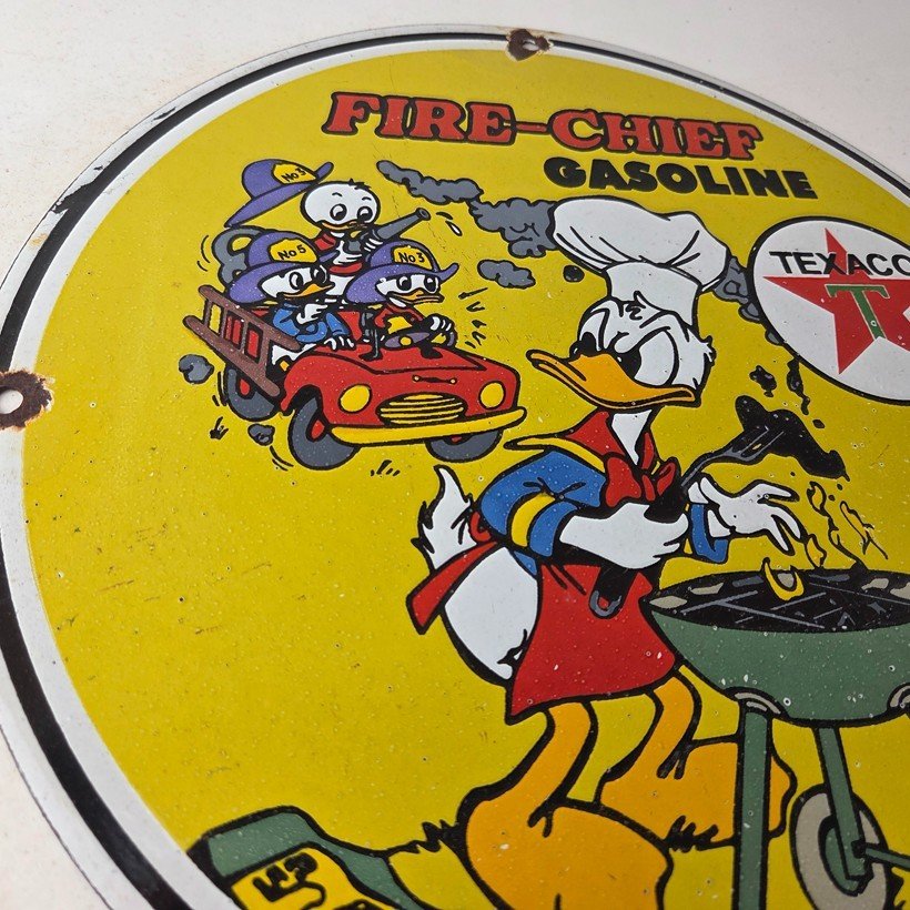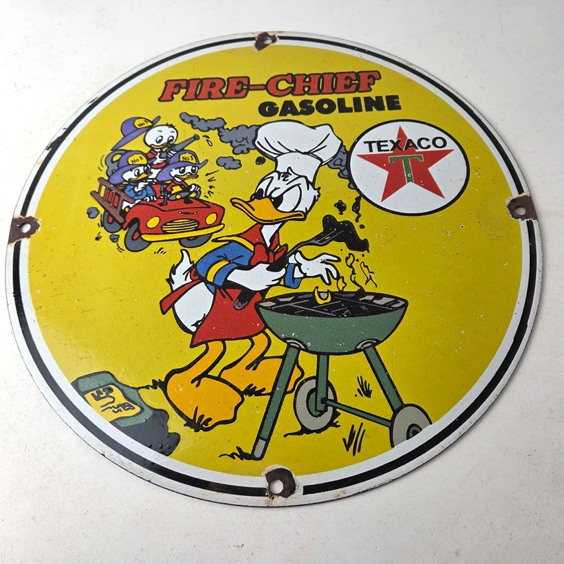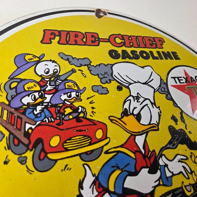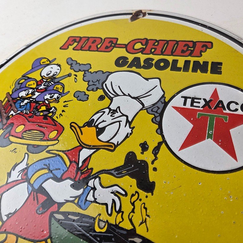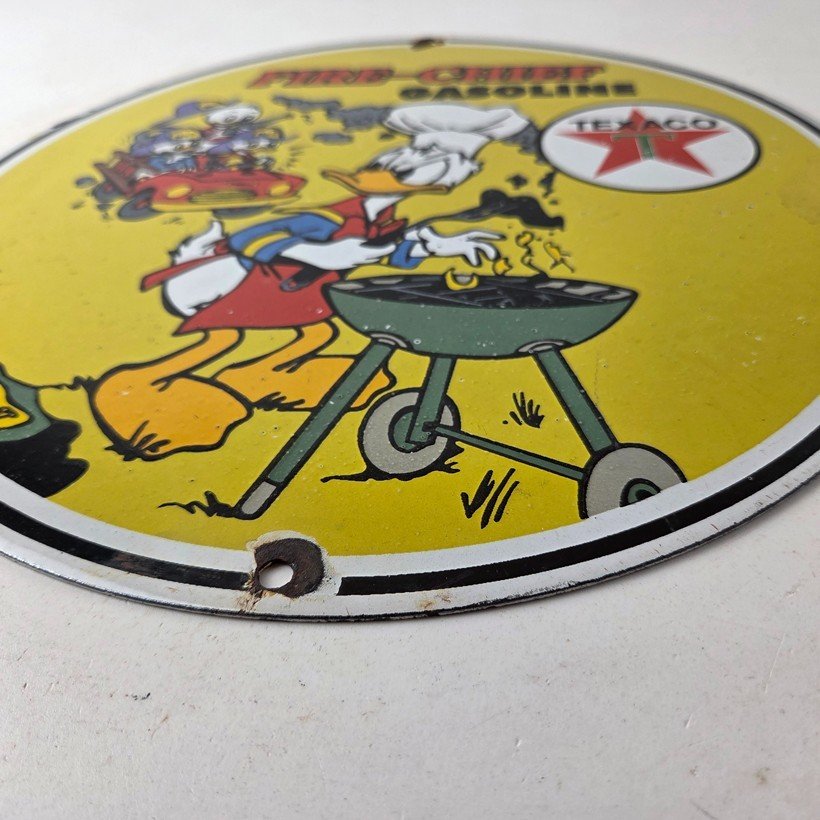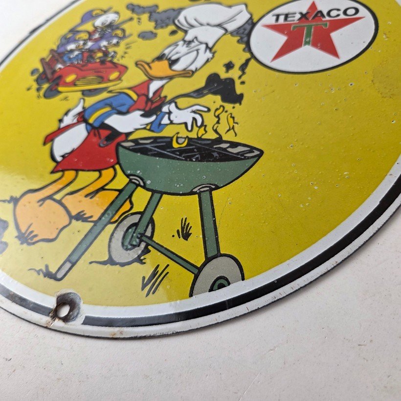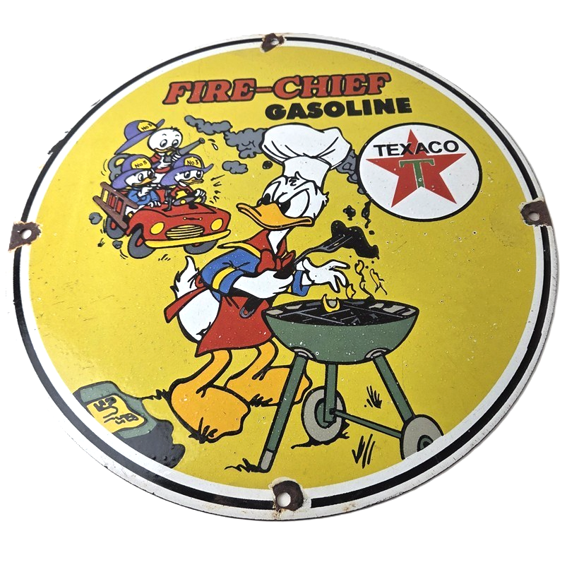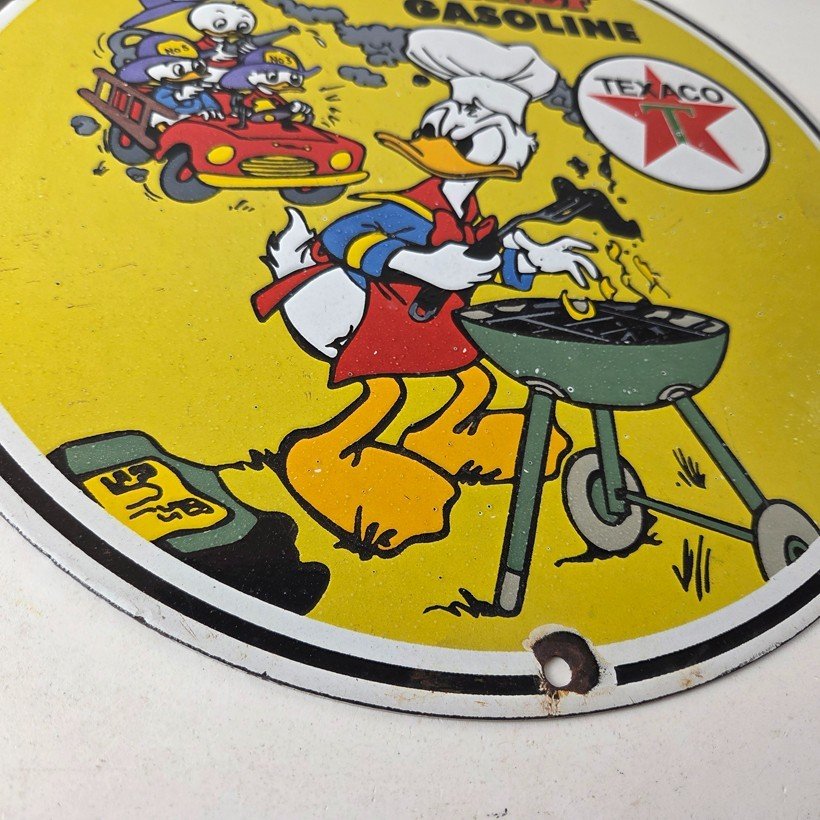 This vintage Texaco Gasoline porcelain sign features Texaco Gasoline and the iconic character of Walt Disney Donald Duck, Huey, Dewey, and Louie. The sign boasts vibrant colors, making it perfect for any collector of gas and oil advertising memorabilia. The sign is made of porcelain and is in excellent shape, showcasing the durability and craftsmanship of vintage gas pump signs.