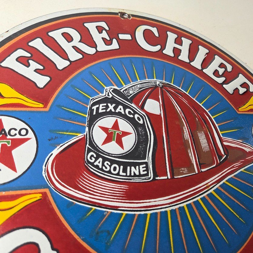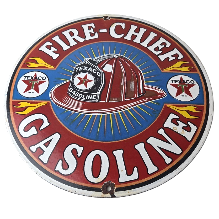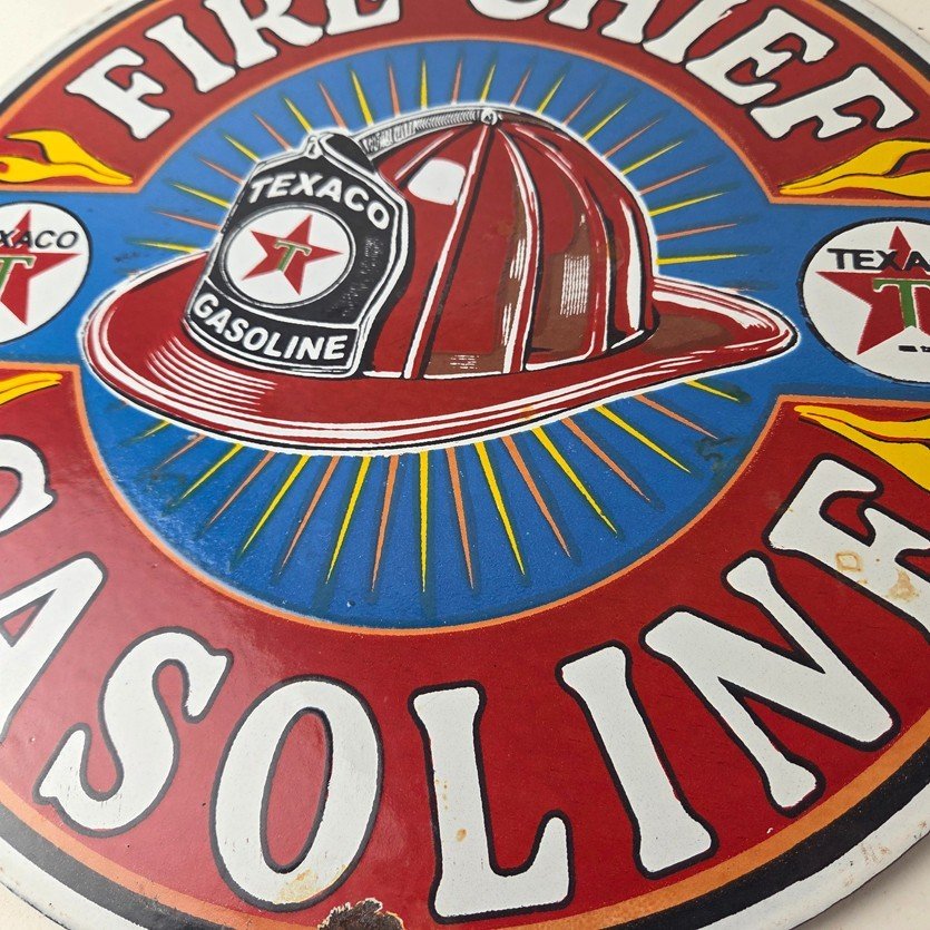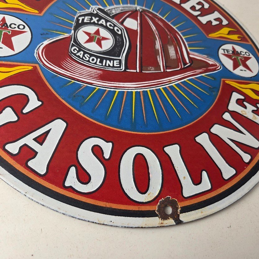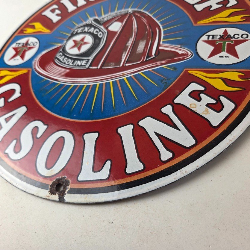 This vintage Texaco Gasoline porcelain sign features Texaco Gasoline and the iconic Fireman hat. The sign boasts vibrant colors, making it perfect for any collector of gas and oil advertising memorabilia. The sign is made of porcelain and is in excellent shape, showcasing the durability and craftsmanship of vintage gas pump signs.
