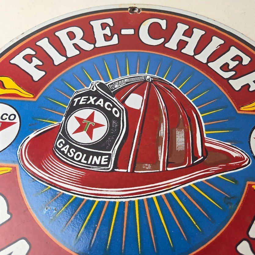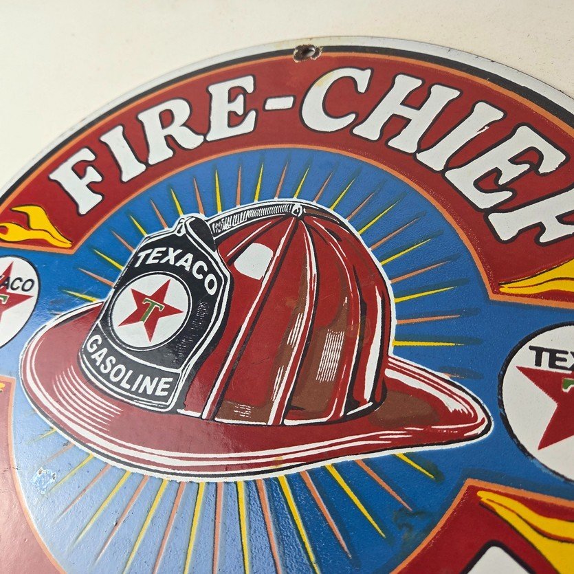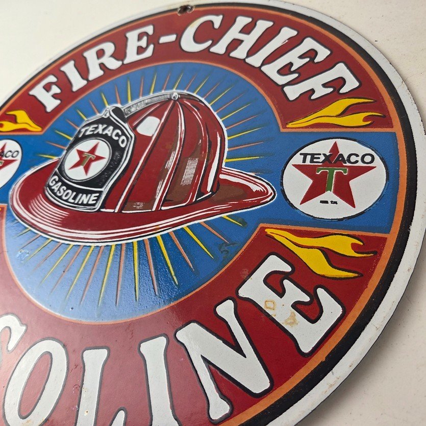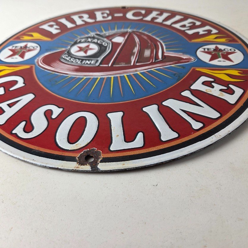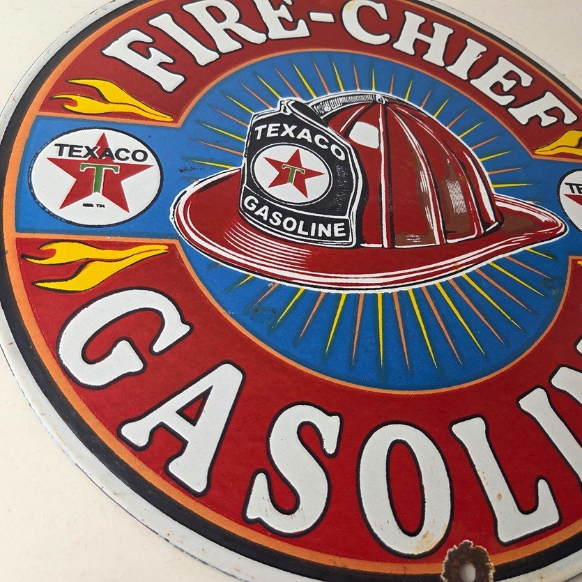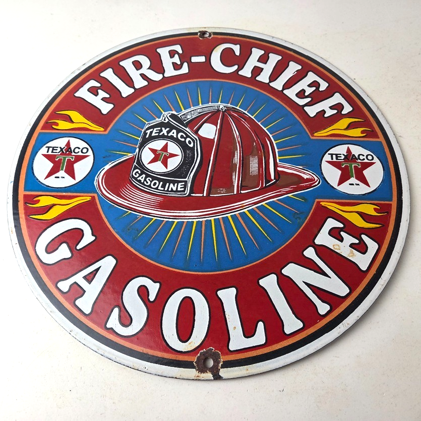 This vintage Texaco Gasoline porcelain sign features Texaco Gasoline and the iconic Fireman hat. The sign boasts vibrant colors, making it perfect for any collector of gas and oil advertising memorabilia. The sign is made of porcelain and is in excellent shape, showcasing the durability and craftsmanship of vintage gas pump signs.