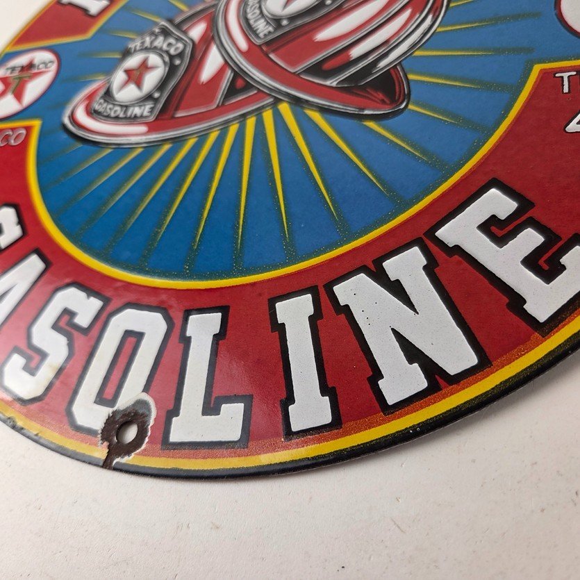 This vintage Texaco Gasoline porcelain sign features Texaco Gasoline and the iconic Texaco Fireman hats. The sign boasts vibrant colors, making it perfect for any collector of gas and oil advertising memorabilia. The sign is made of porcelain and is in excellent shape, showcasing the durability and craftsmanship of vintage gas pump signs.