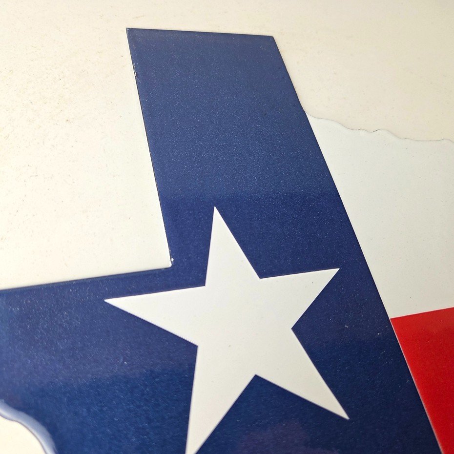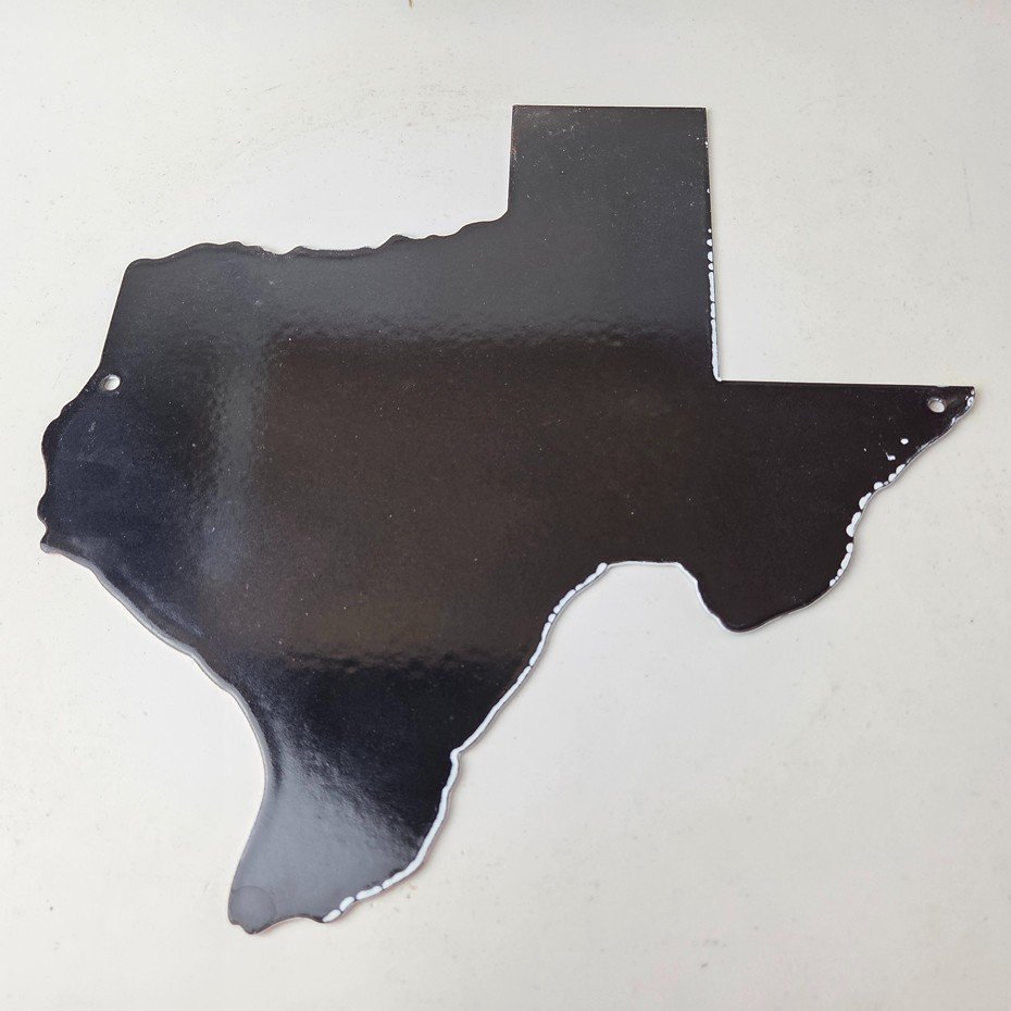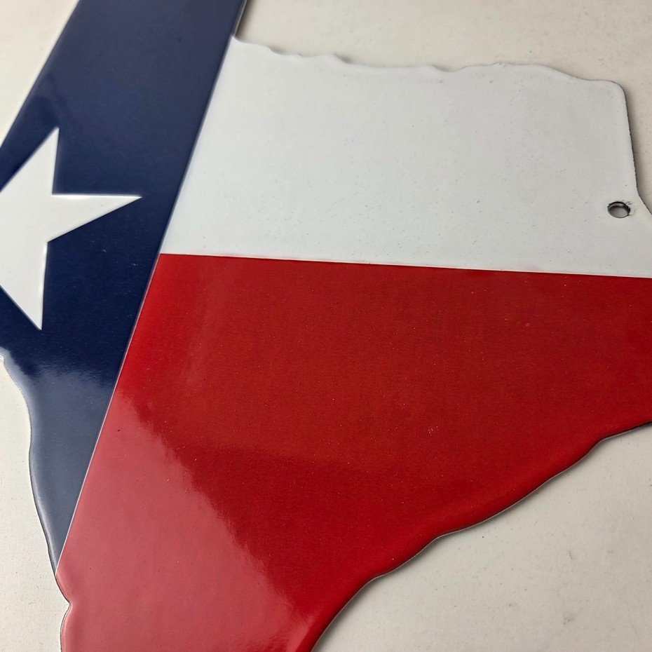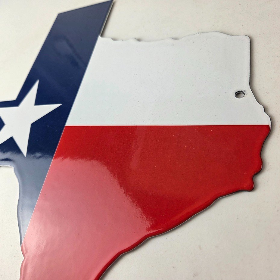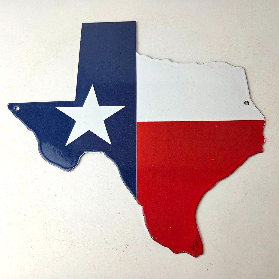 This vintage Texas Flag porcelain sign features the iconic USA State of Texas flag. This sign has excellent color and porcelain. The sign measures 11 3/4 inches across by 11 3/4 inches tall.
