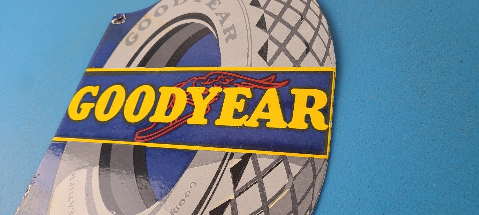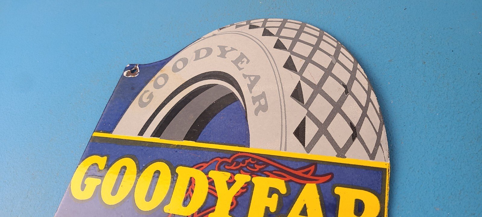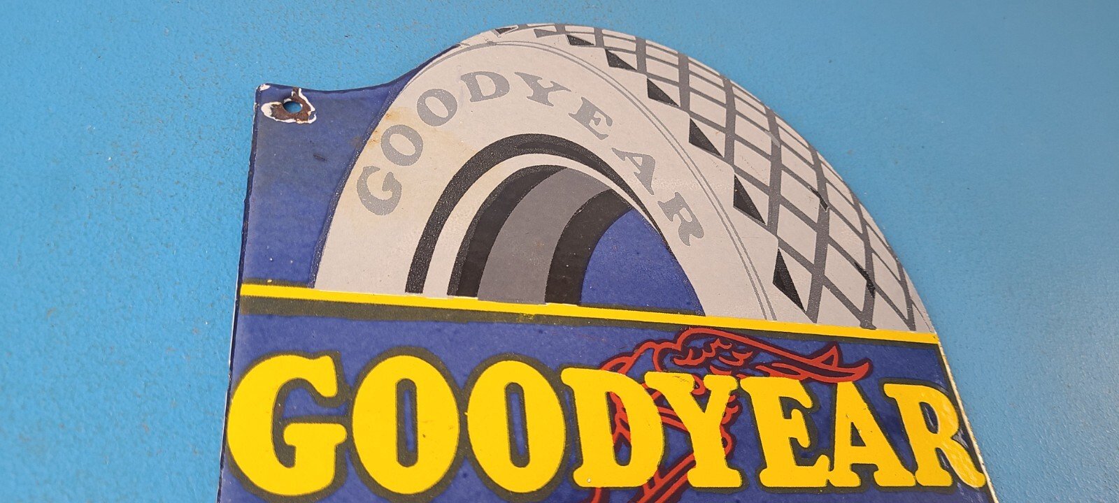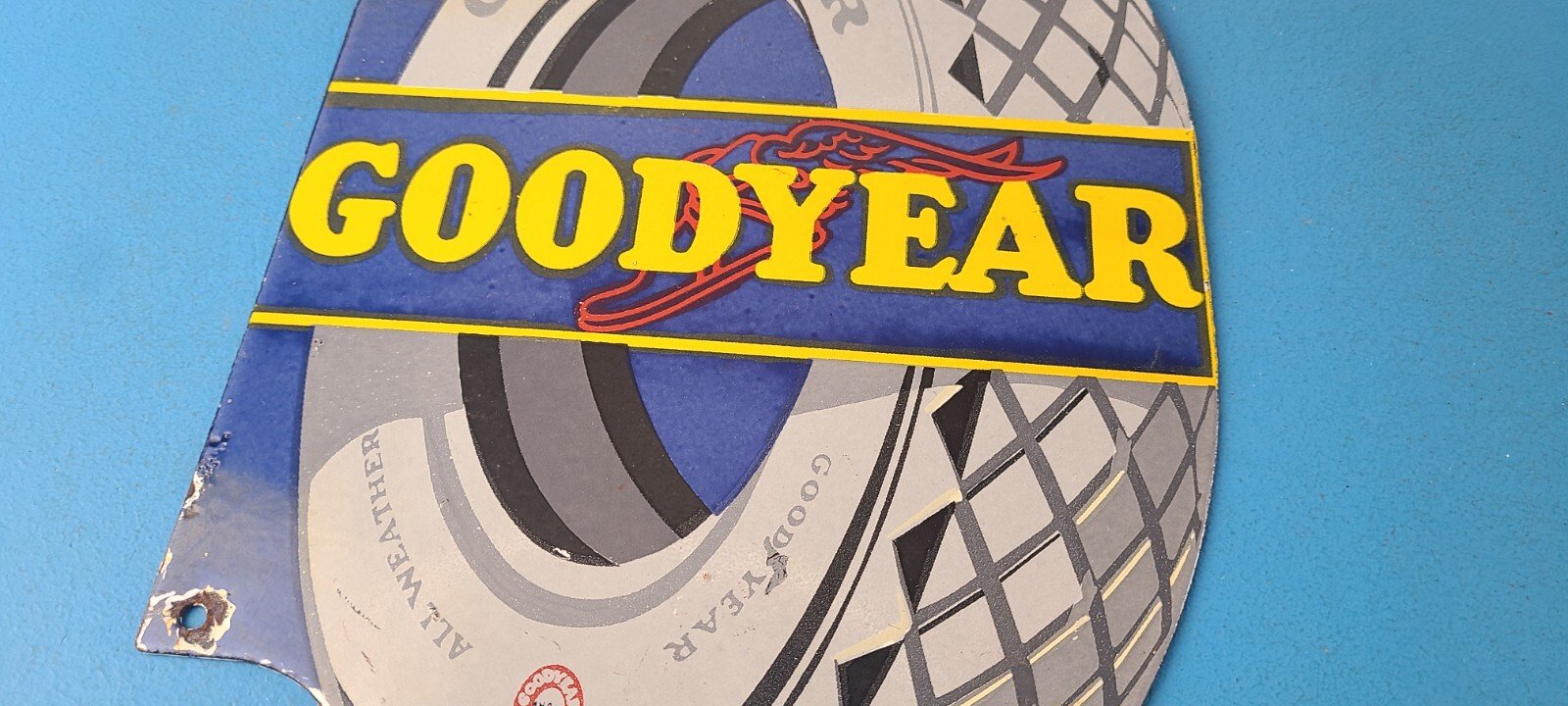 This vintage Tires porcelain sign features a striking design with bold blue & yellow colors and is made of porcelain material. It is perfect for display in a garage, shop, or man cave. The sign measures 12″ x 8″ and is in excellent condition, with no major chips or cracks. It was made in the United States and has excellent porcelain and colors.