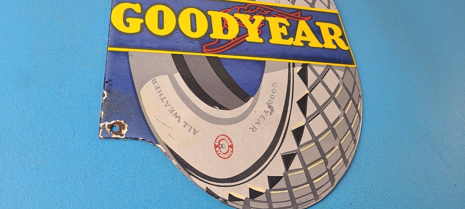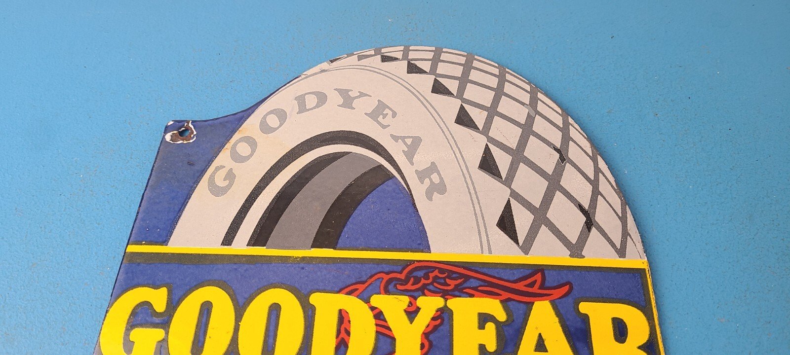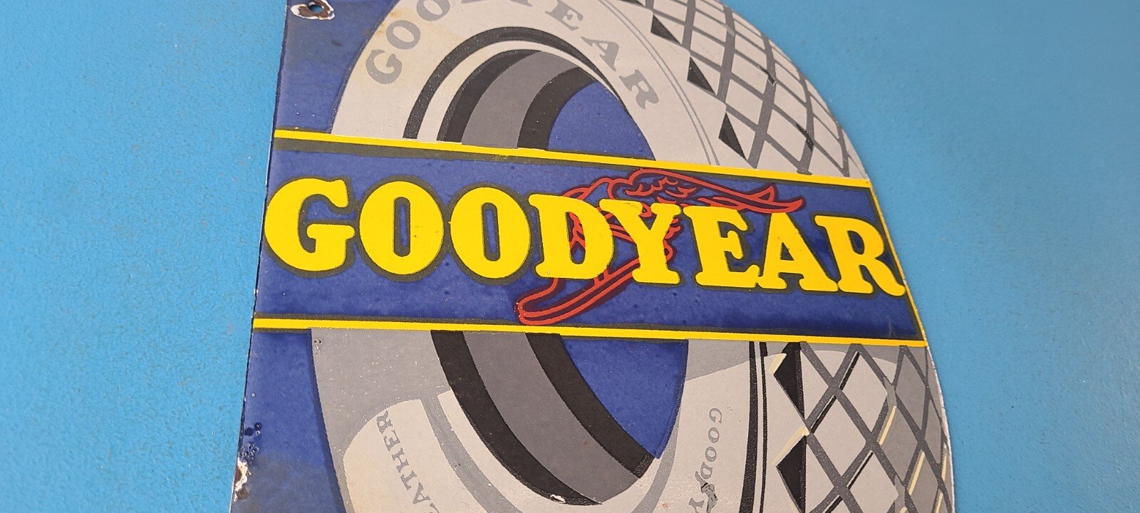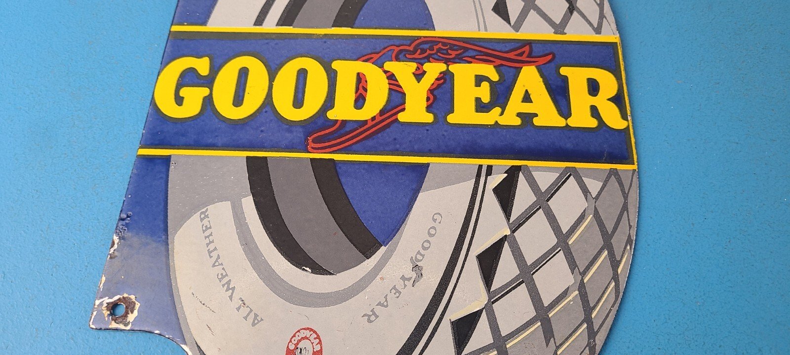 This vintage Tires porcelain sign features a striking design with bold blue & yellow colors and is made of porcelain material. It is perfect for display in a garage, shop, or man cave. The sign measures 12″ x 8″ and is in excellent condition, with no major chips or cracks. It was made in the United States and has excellent porcelain and colors.