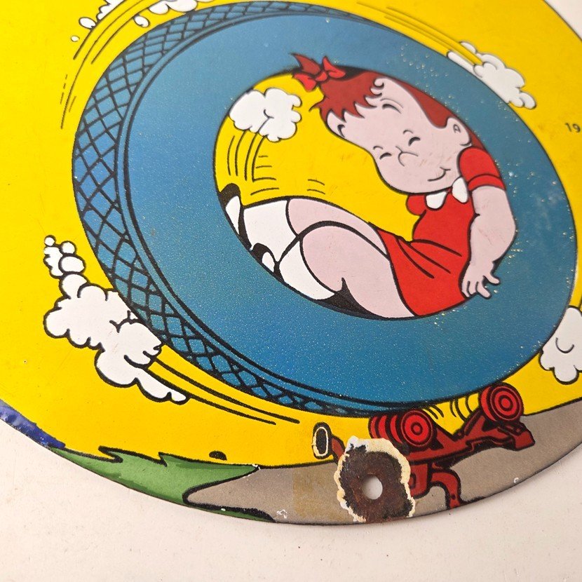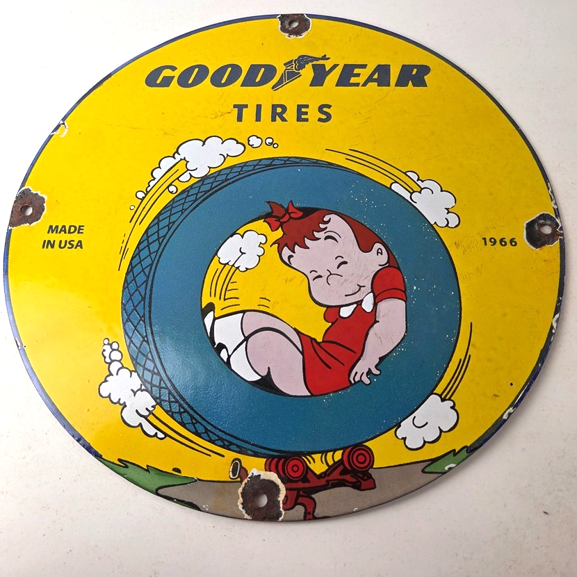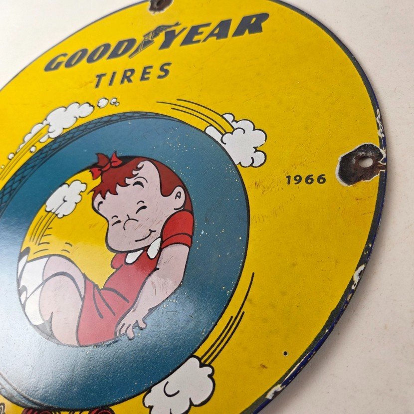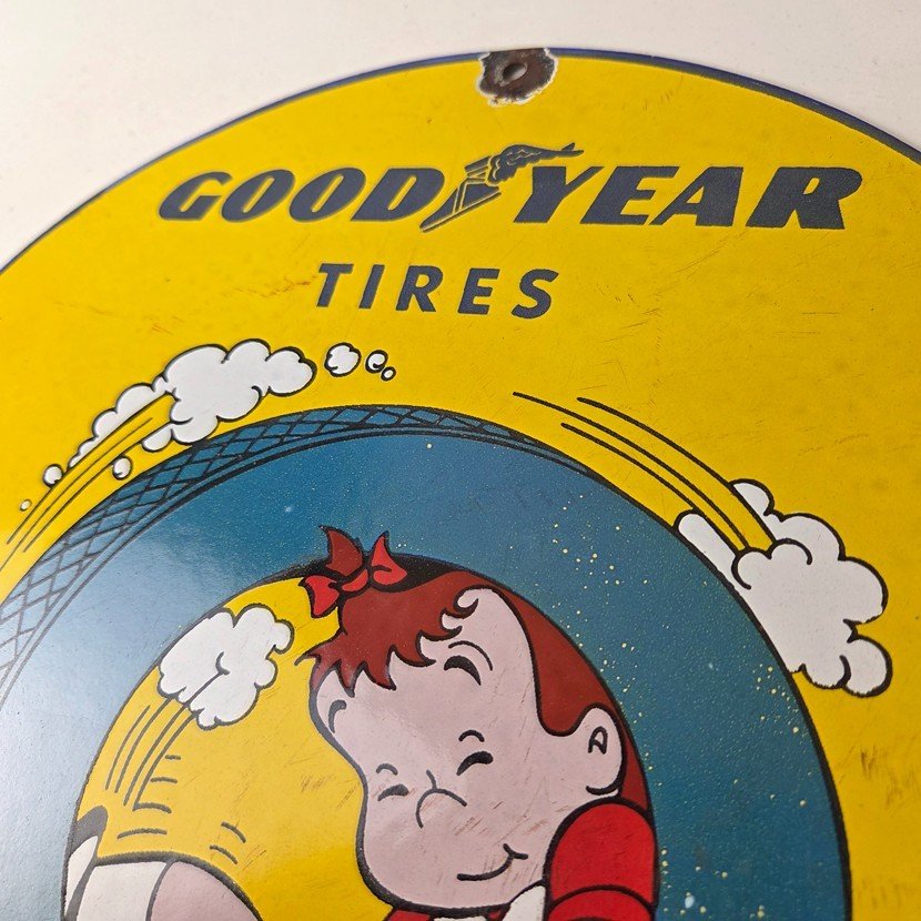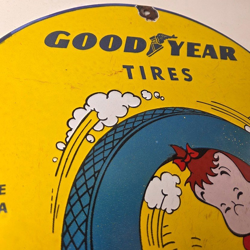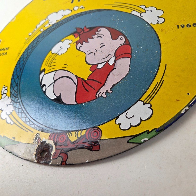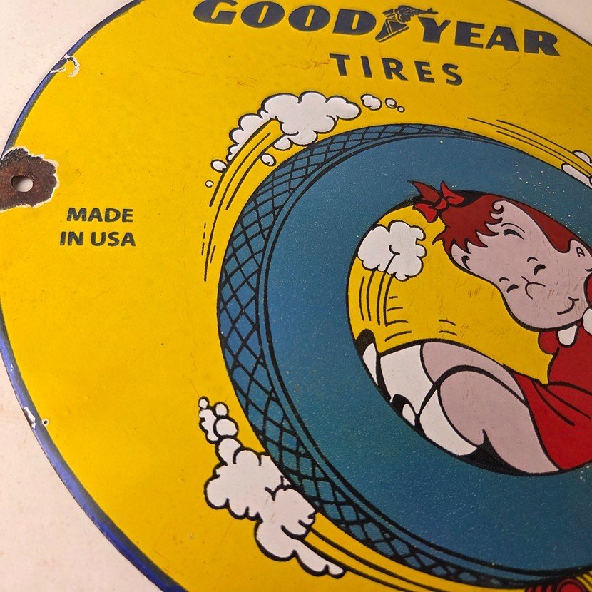This vintage porcelain sign is a neat piece of advertising memorabilia. It features the iconic Tires logo and is designed for use in gas service stations. The sign features Little LuLu playing in a tire. The sign is perfect for collectors of gas and oil memorabilia, as well as people who need to fill their garage or shop.