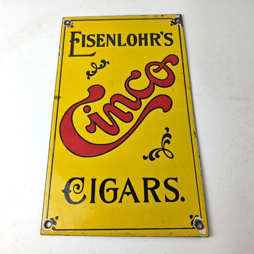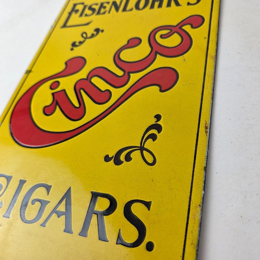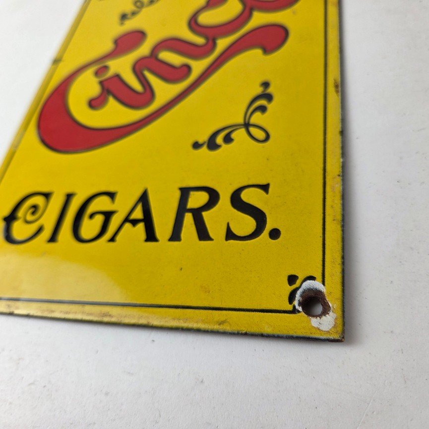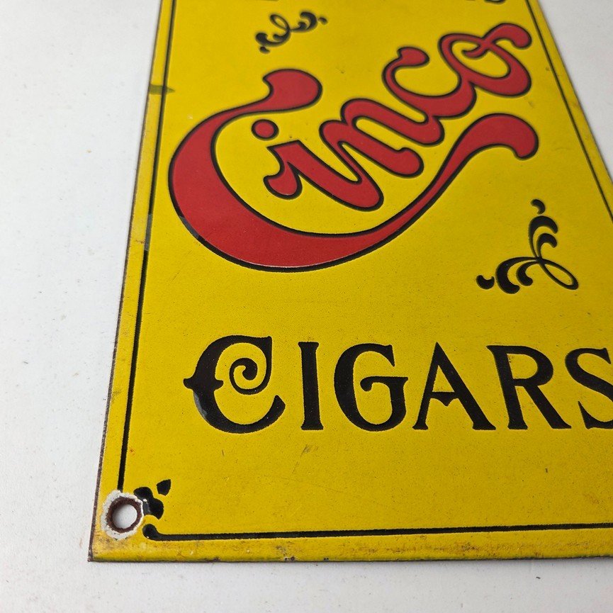 For sale is a vintage Cinco Cigar Porcelain Sign featuring the large red Cinco lettering. This unique piece is 10″ x 6″ are suitable for those who collect porcelain tobacco signs.