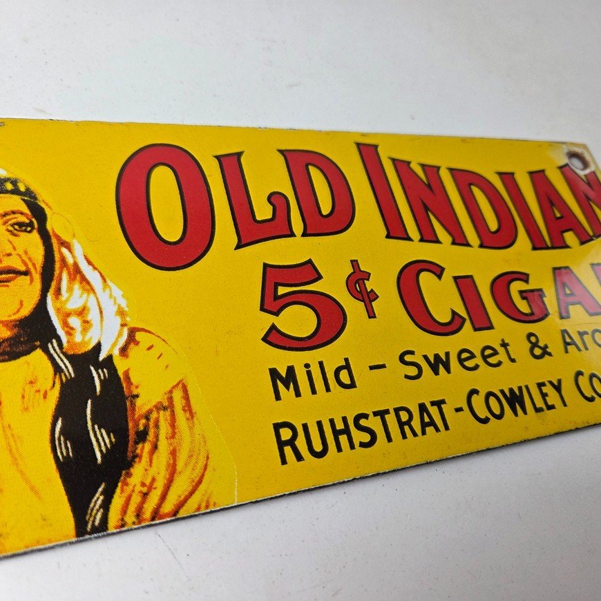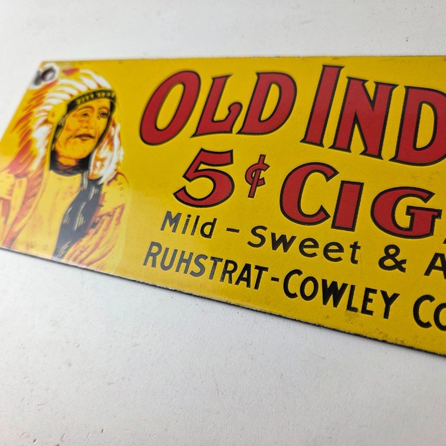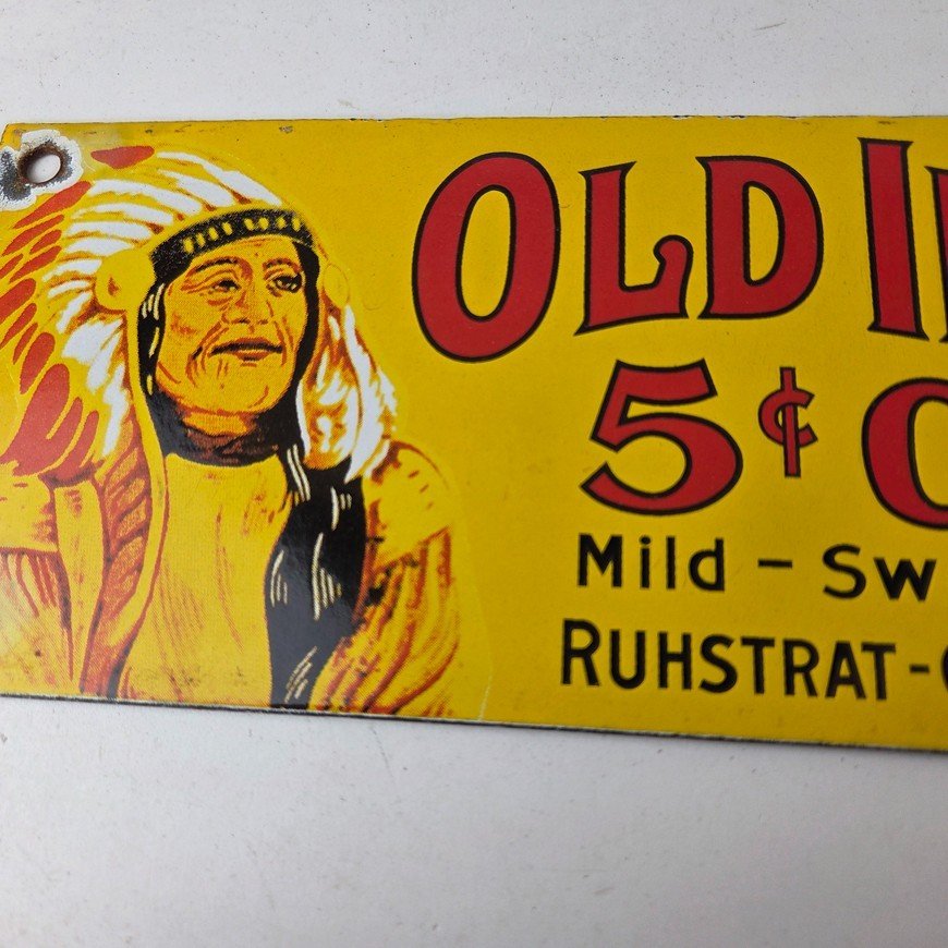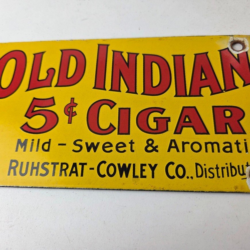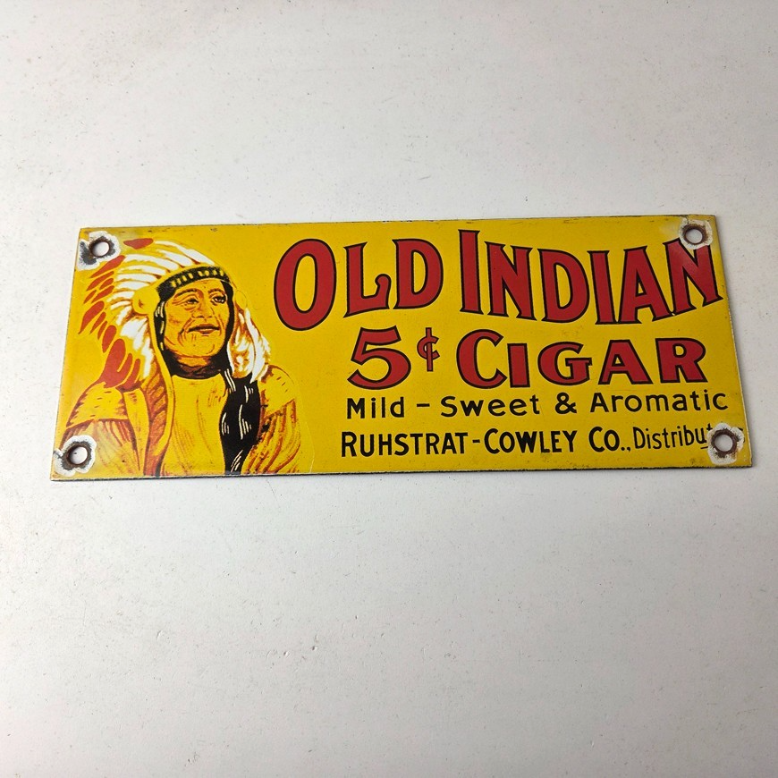 For sale is a vintage Old Indian Cigar Porcelain Sign featuring the large red 5 cent lettering. This unique piece is 10″ x 4″ are suitable for those who collect porcelain tobacco signs.