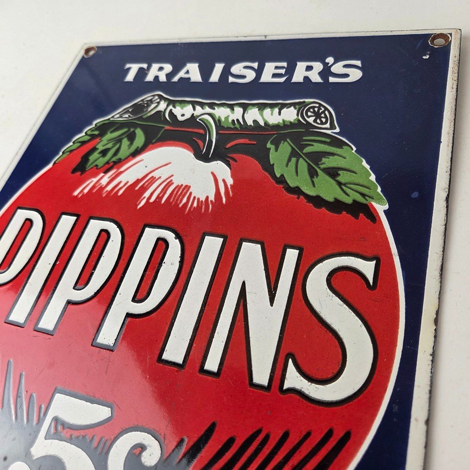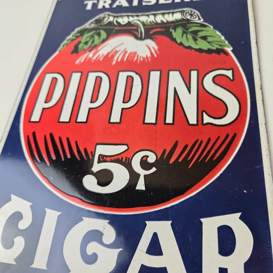 For sale is a vintage Pippins Cigar Porcelain Sign featuring Traiser’s Tobacco. This unique piece is 12″ x 8 1/2″ are suitable for those who collect porcelain tobacco signs.