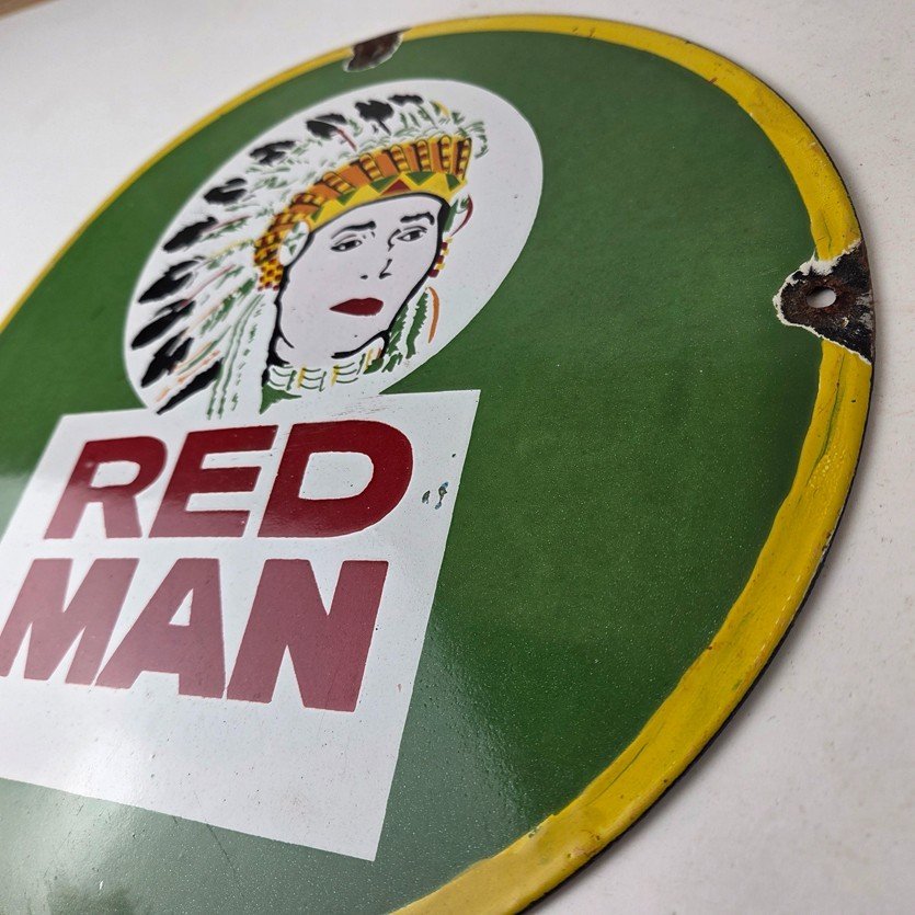 This vintage Red Man Chewing Tobacco porcelain sign features the iconic Native American Indian and is sure to be a great addition to any collection. Measuring at 12 inches in size, it boasts a striking color scheme that catches the eye.