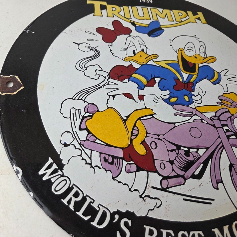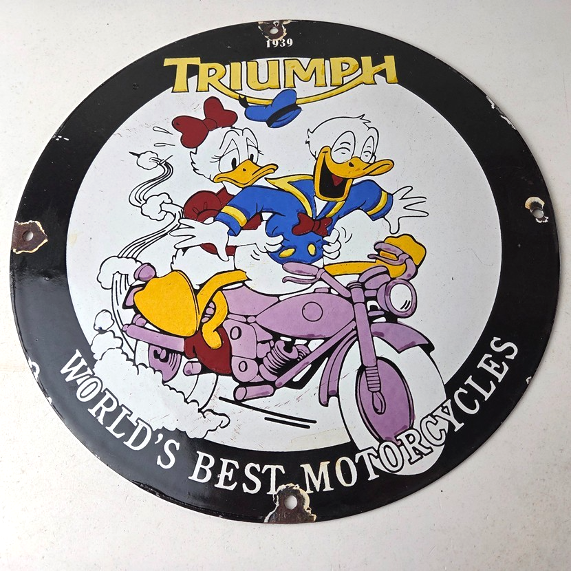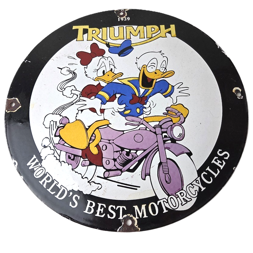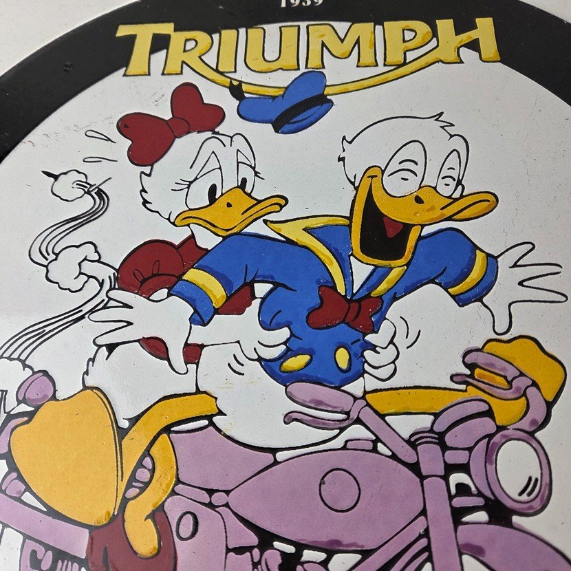 Vintage Triumph Donald Daisy Motorcycle Porcelain Sign – Disney Triumph Sign