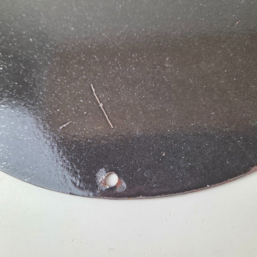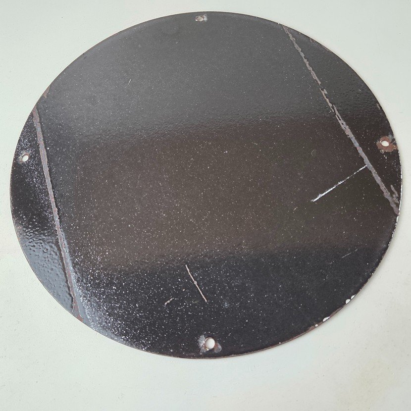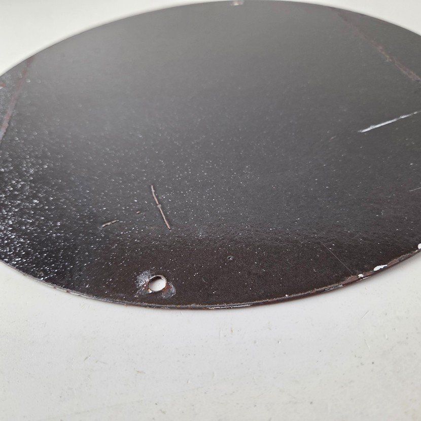 Made of porcelain enamel on steel with patina and wear: rust spotting around the mounting holes, minor edge chips, light surface scratches, and minimal discoloration. This is a porcelain enamel advertising sign in excellent condition, exactly as shown in the photos.