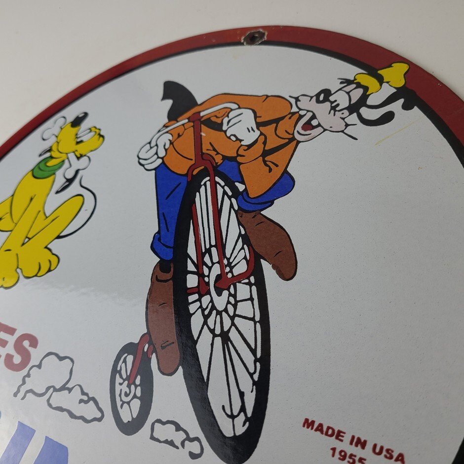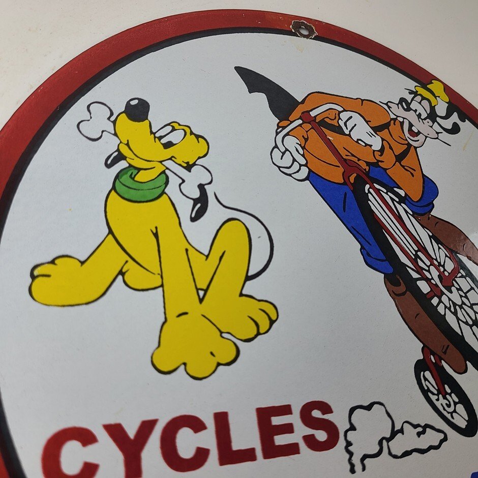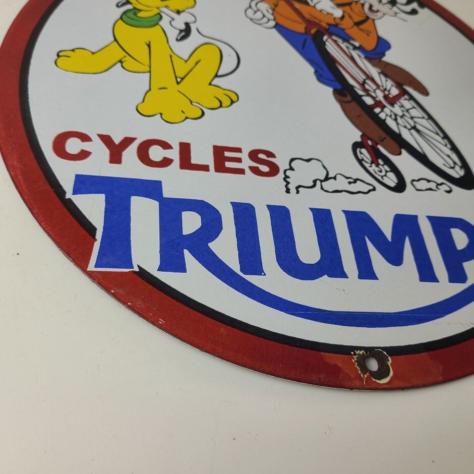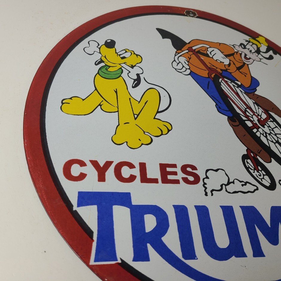 This vintage Triumph Motorcycles porcelain sign features Triumph Motorcycles with the Walt Disney Goofy and his dog! The sign measures 12″ in size and has porcelain on both sides.