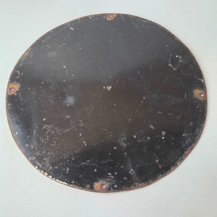 Made of porcelain enamel on steel with patina and wear: rust spotting around the mounting holes, minor edge chips, light surface scratches, and minimal discoloration. This is a porcelain enamel advertising sign in excellent condition, exactly as shown in the photos.