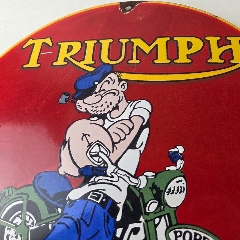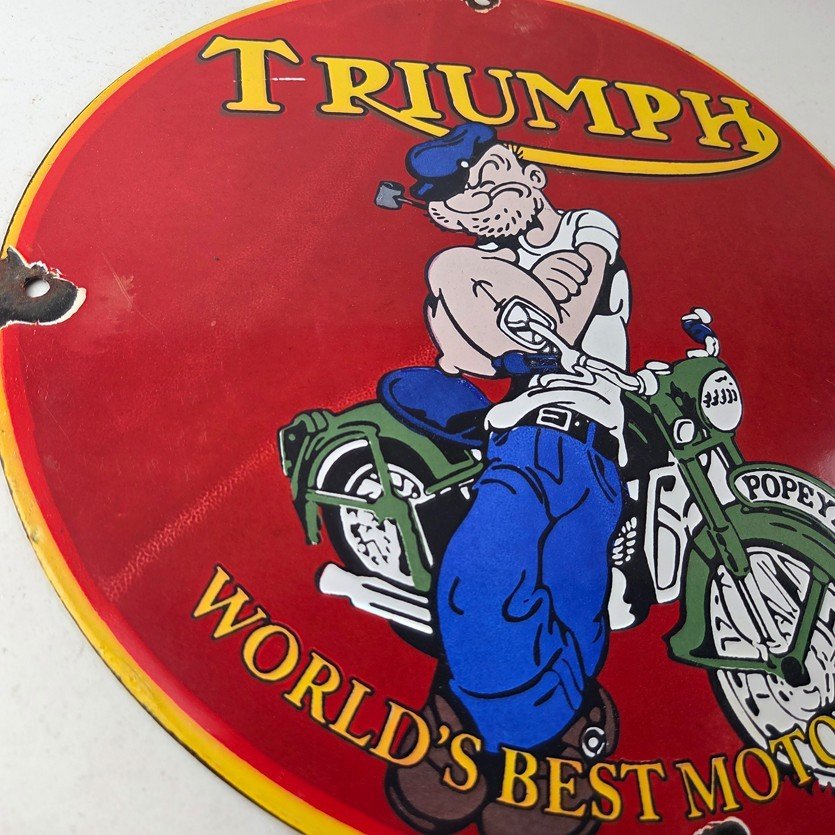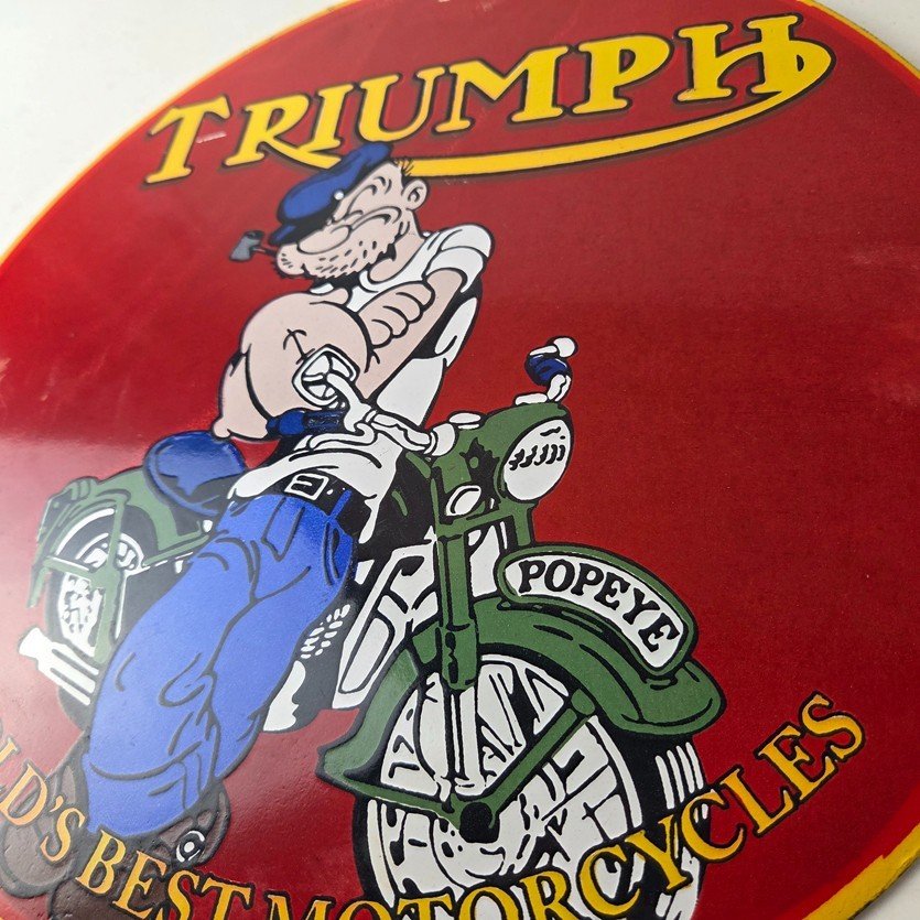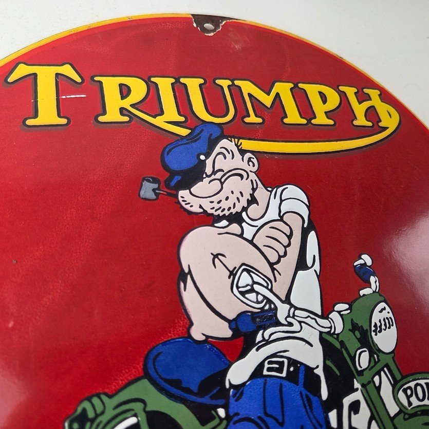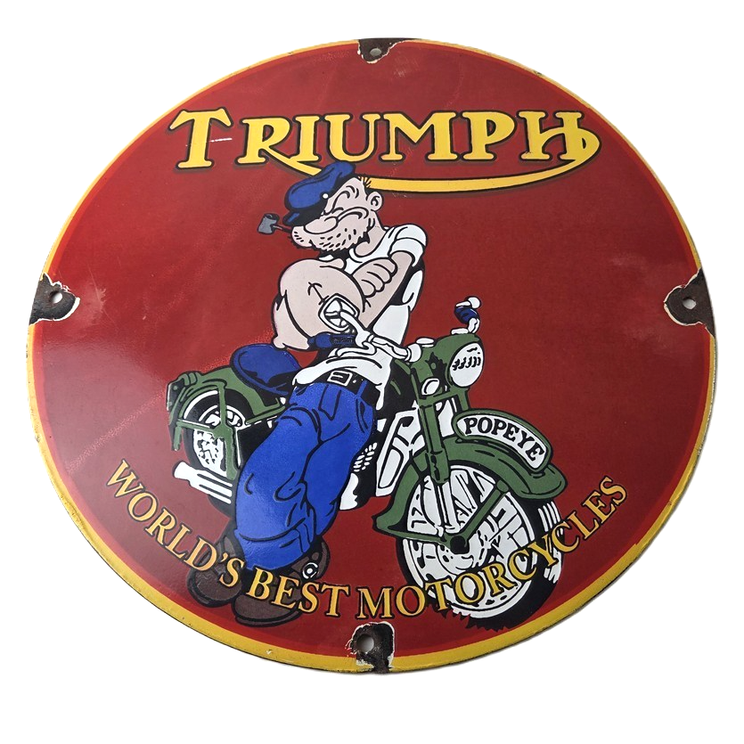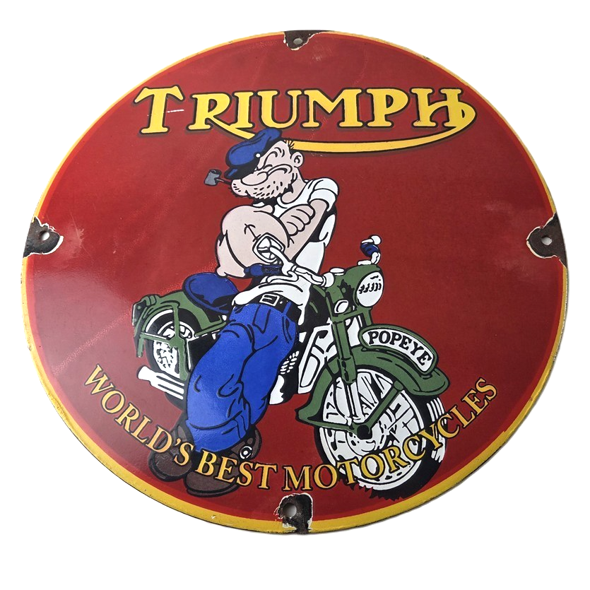 This vintage Triumph Automobiles porcelain sign features the Triumph Motorcycles and Popeye. This sign is perfect for advertising your love for Triumph culture and measures 12″ across.